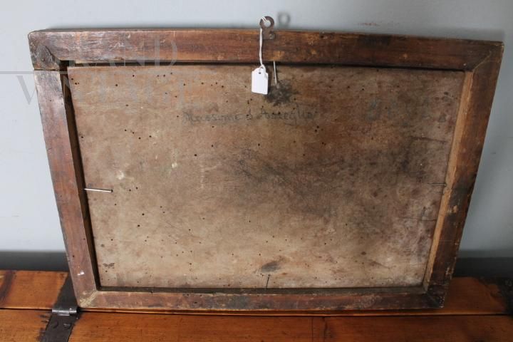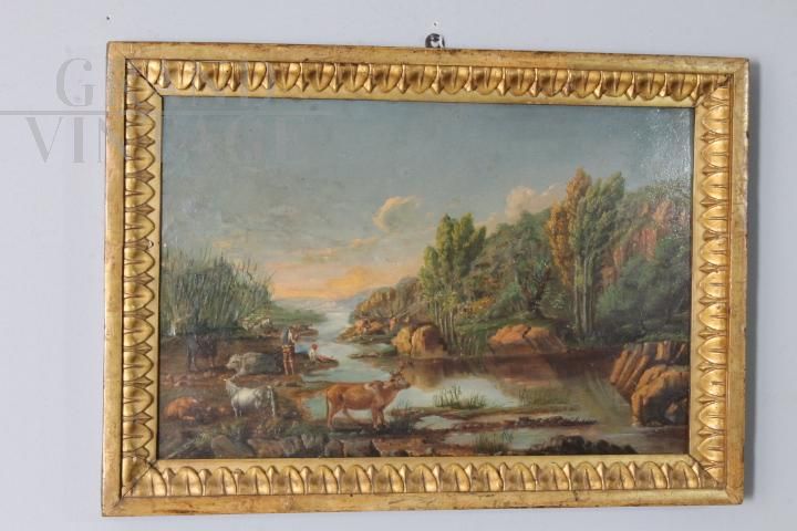 Painting with bucolic scene, oil on panel from the late 18th century in an antique frame