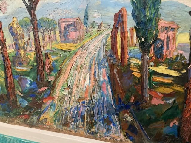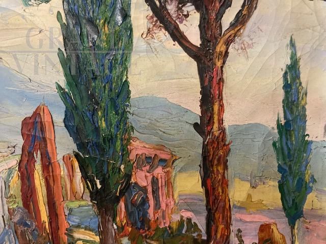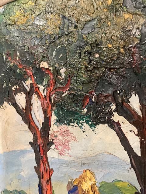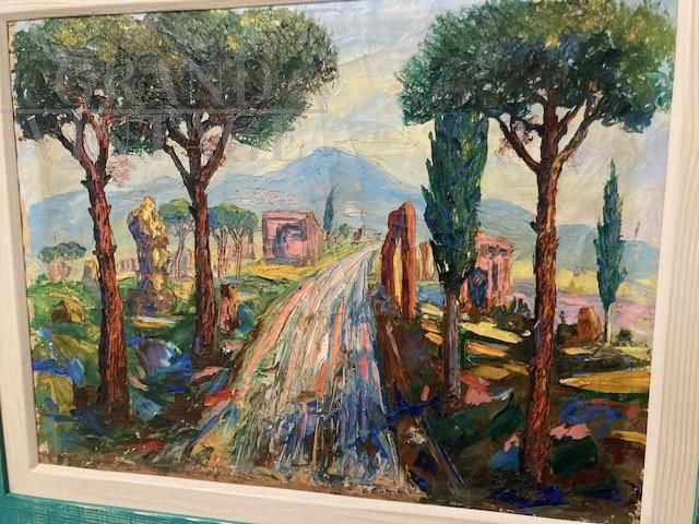 Antique splendid painting with tree-lined avenue and mountains in the background, oil on canvas from the 1940s with material brushstrokes. Beautiful, very colorful and lively, complete with green lacquered frame from a later period. Very good condition.