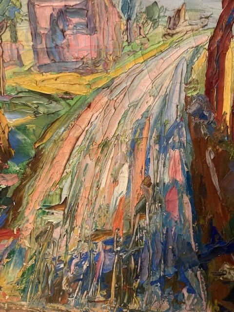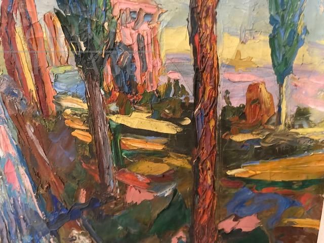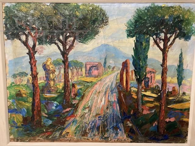 Painting with tree-lined avenue, oil on canvas from the 1940s