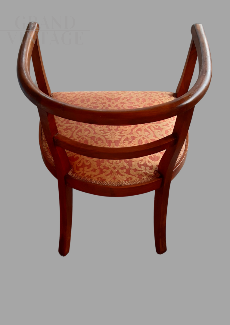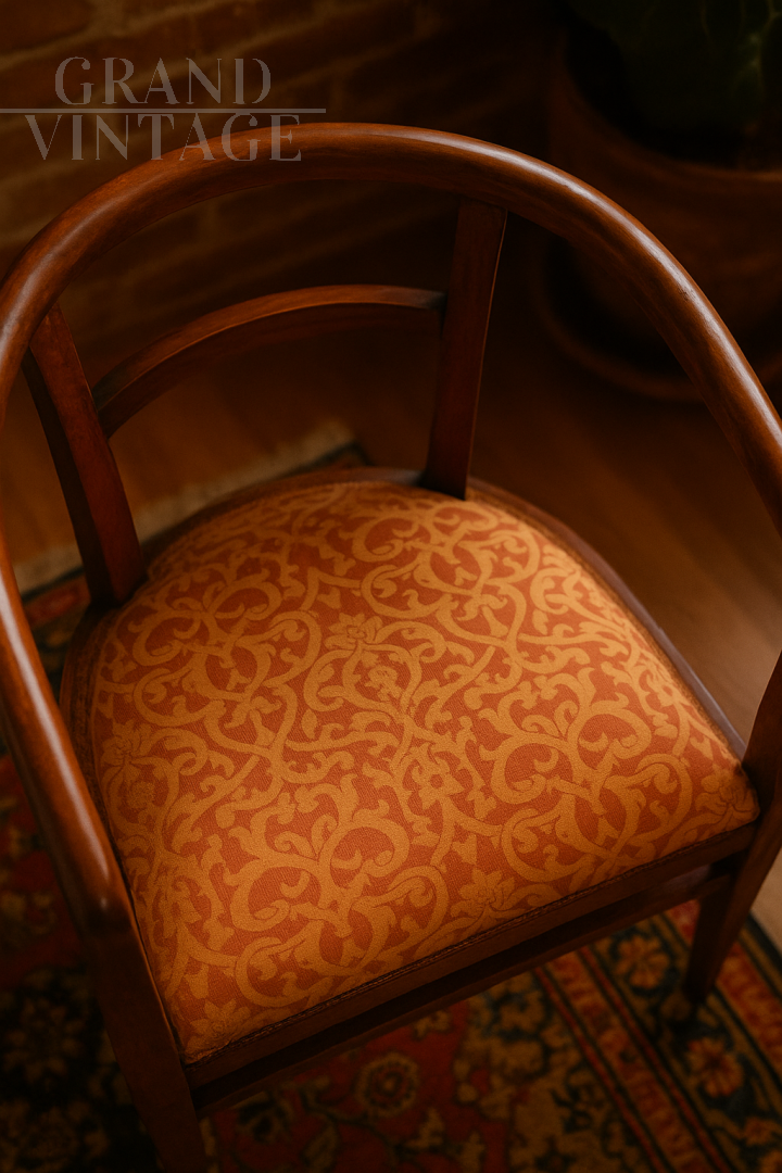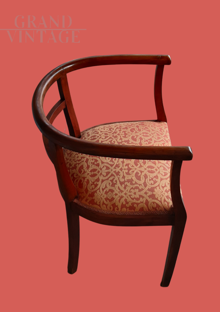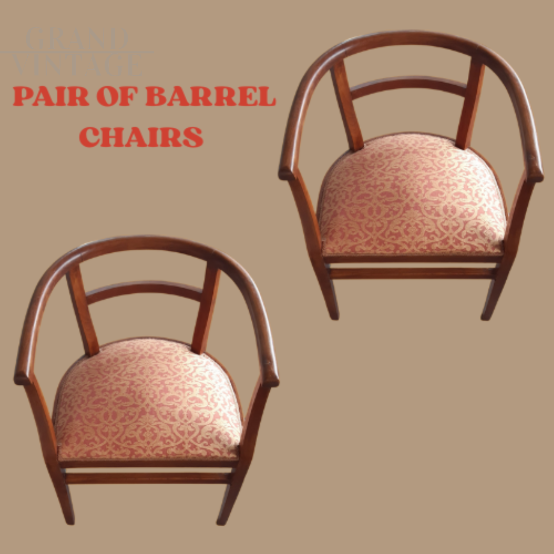 A pair of vintage 1930s armchairs with barrel armrests, recently restored and treated for woodworms. A unique piece, rich in charm and history. These two armchairs date back to the 1930s and carry a family history: they belonged first to my grandmother, then to my mother, and finally to me. They have recently been carefully restored and treated for woodworms, preserving their original charm with a renewed beauty. The fabric is in excellent condition, and the rounded shape makes them elegant and versatile for any type of decor.