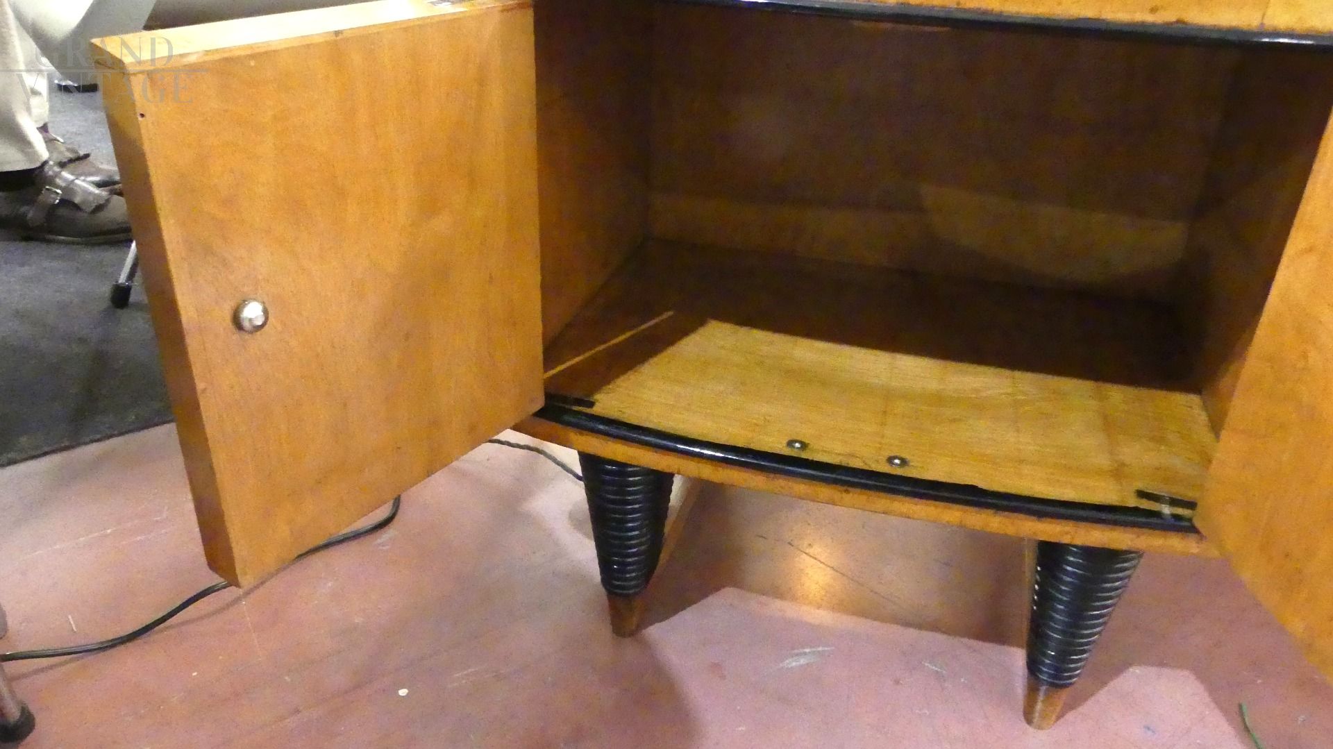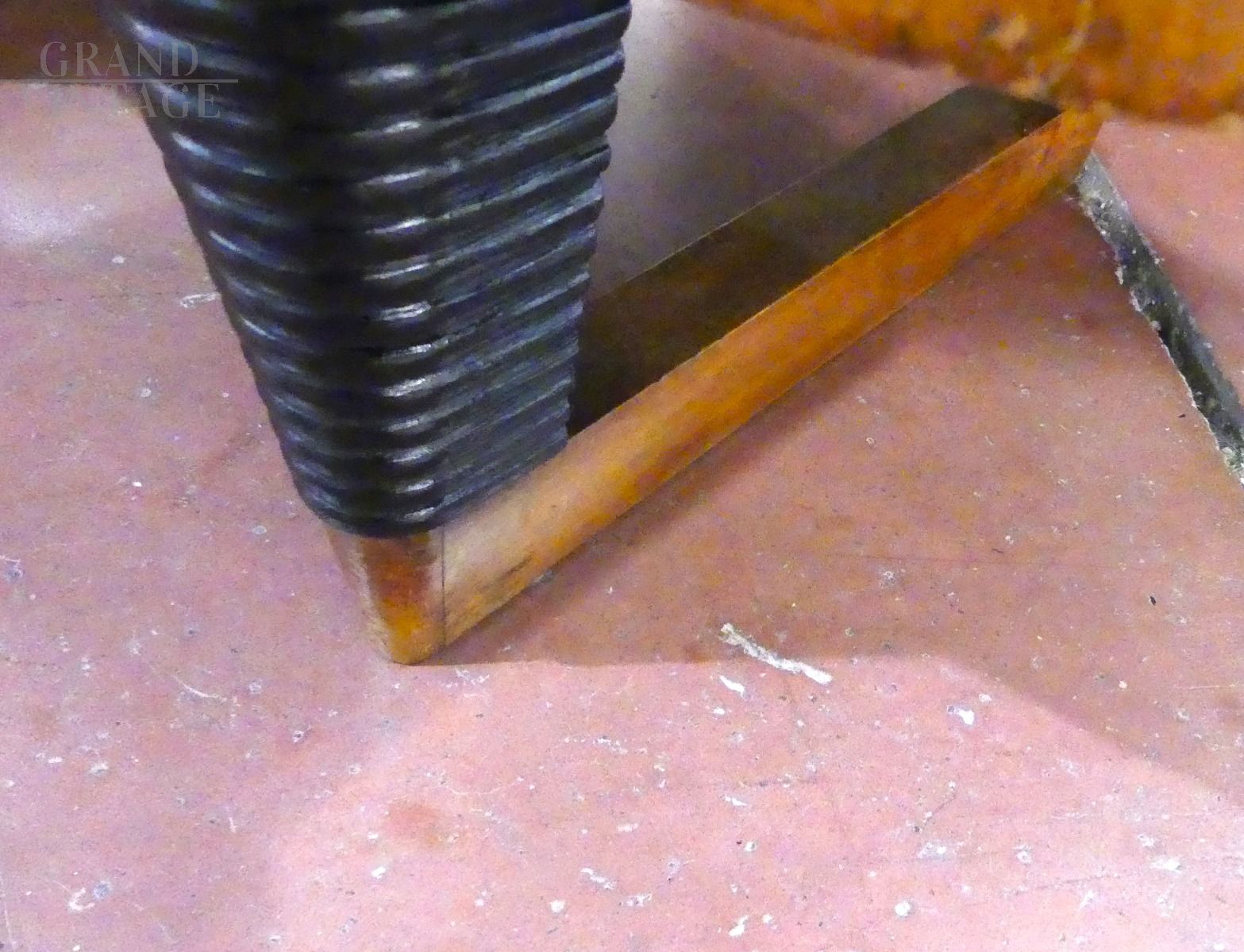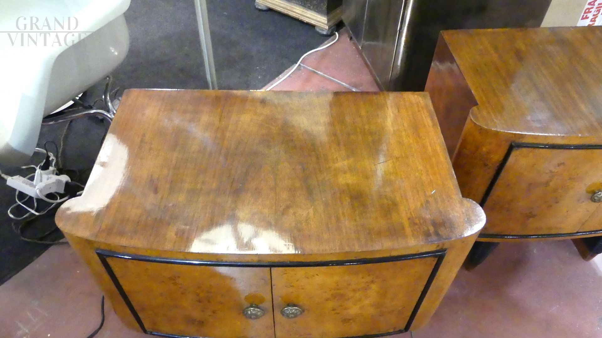 Beautiful pair of 1940s art deco bedside tables in oak briar and poplar with ebonized profiles, very particular legs with ebonized twisted decoration and with wooden piece that joins the front legs to the rear ones.