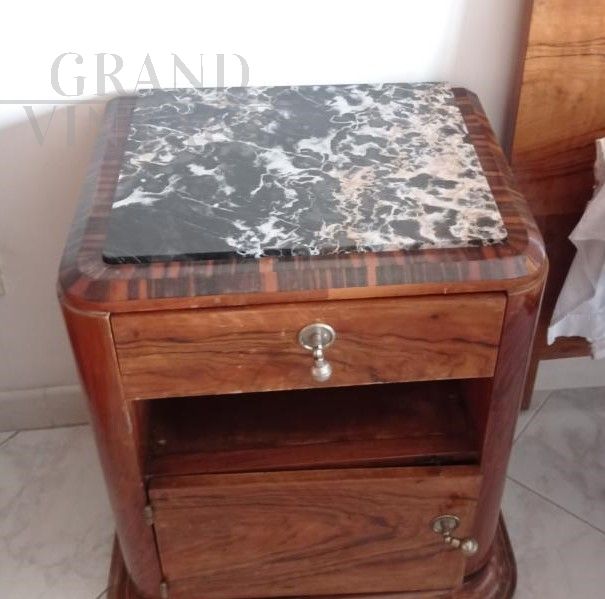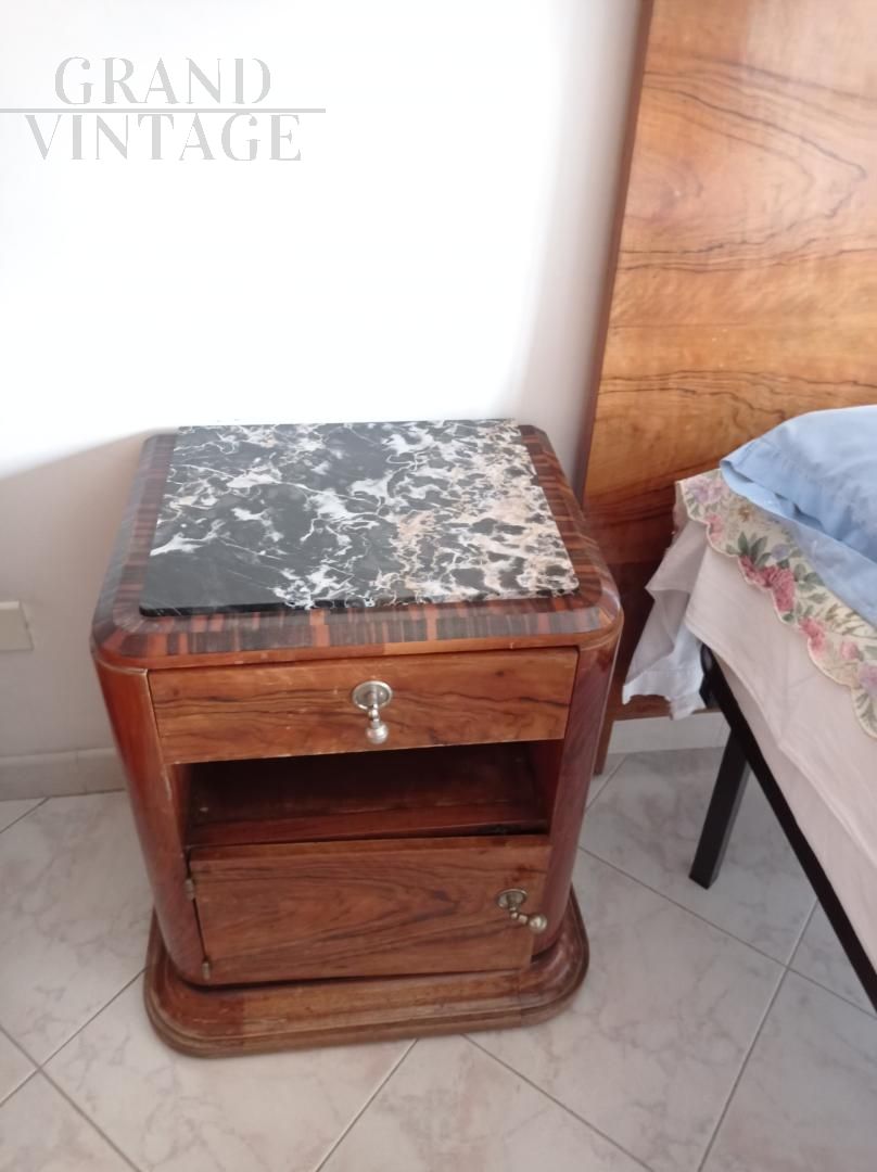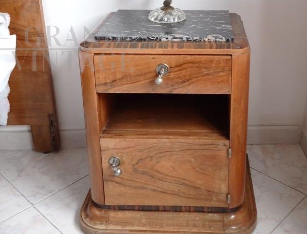 Pair of 1950s bedside tables in walnut with black marble top, in good condition, unrestored, showing natural signs of aging.