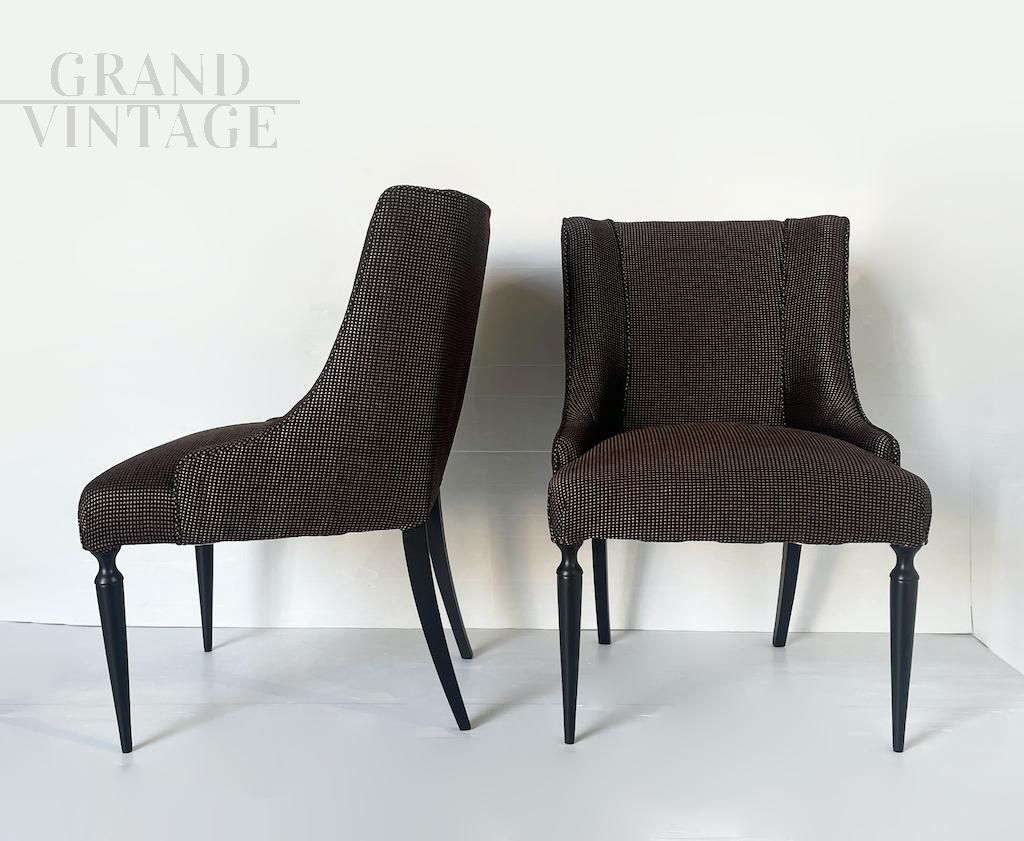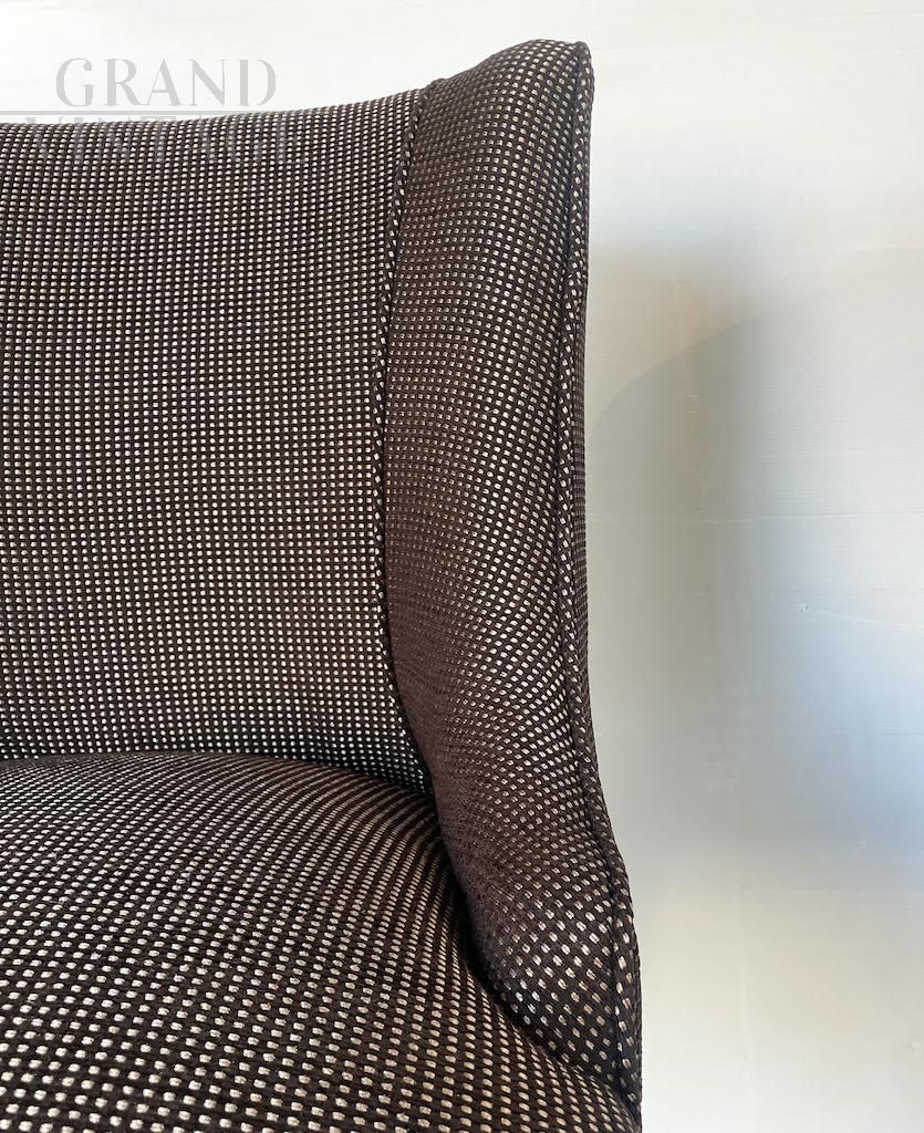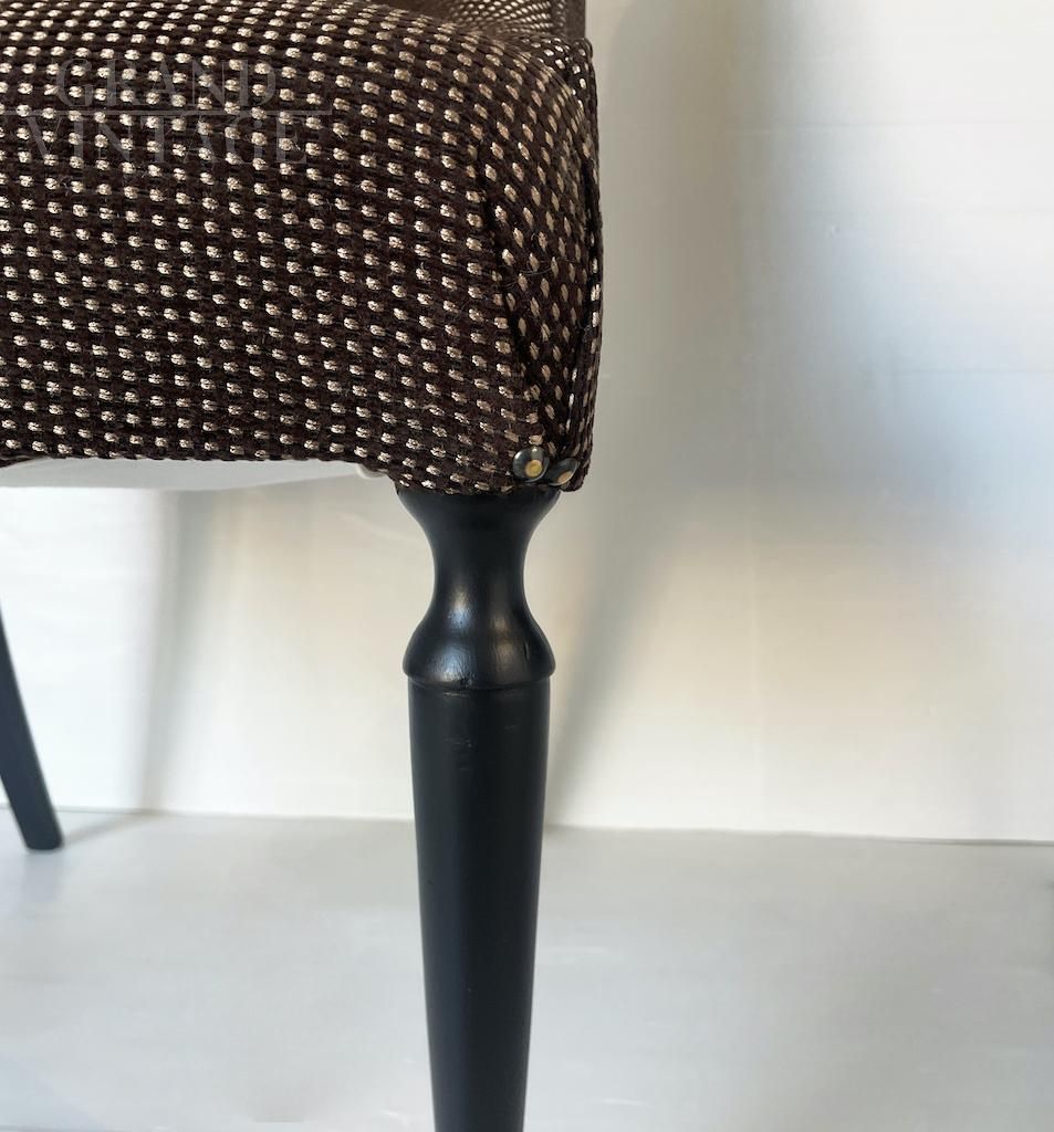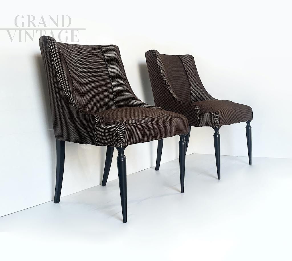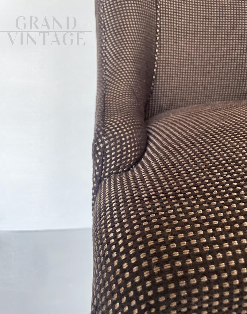 Particolare coppia di poltroncine italiane anni '50 in tessuto marrone, caratterizzate da eleganti gambe in legno di mogano e piccoli inserti in ottone, tipiche degli anni '50. Presentano uno schienale e una seduta comodi e avvolgenti.