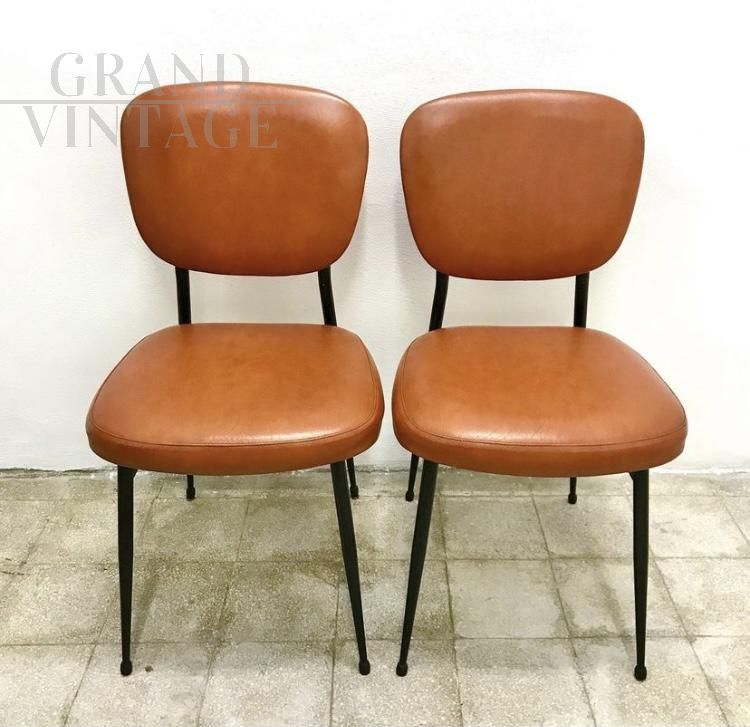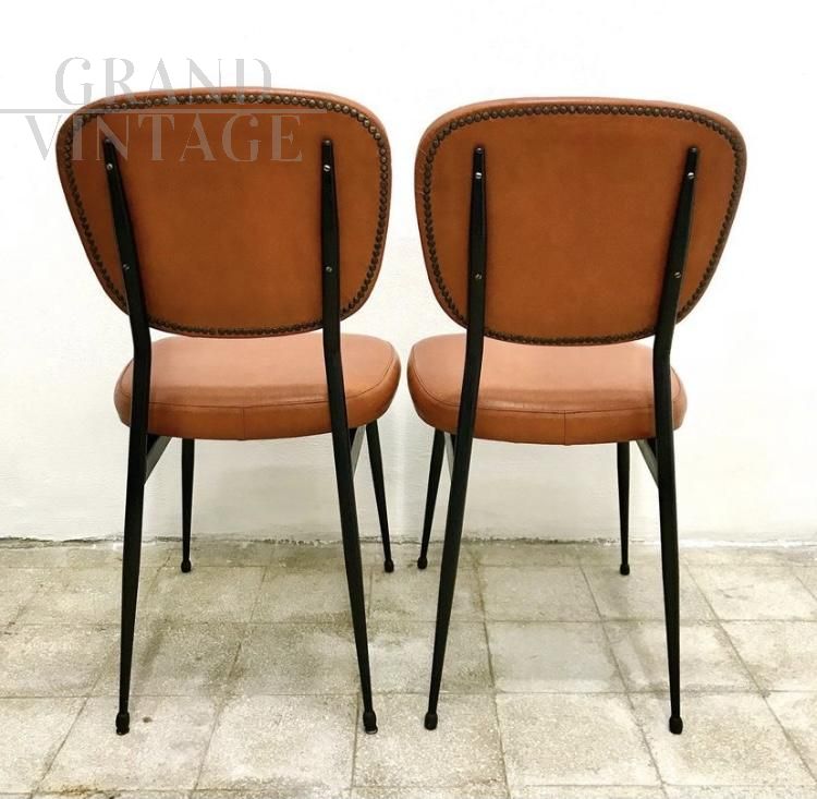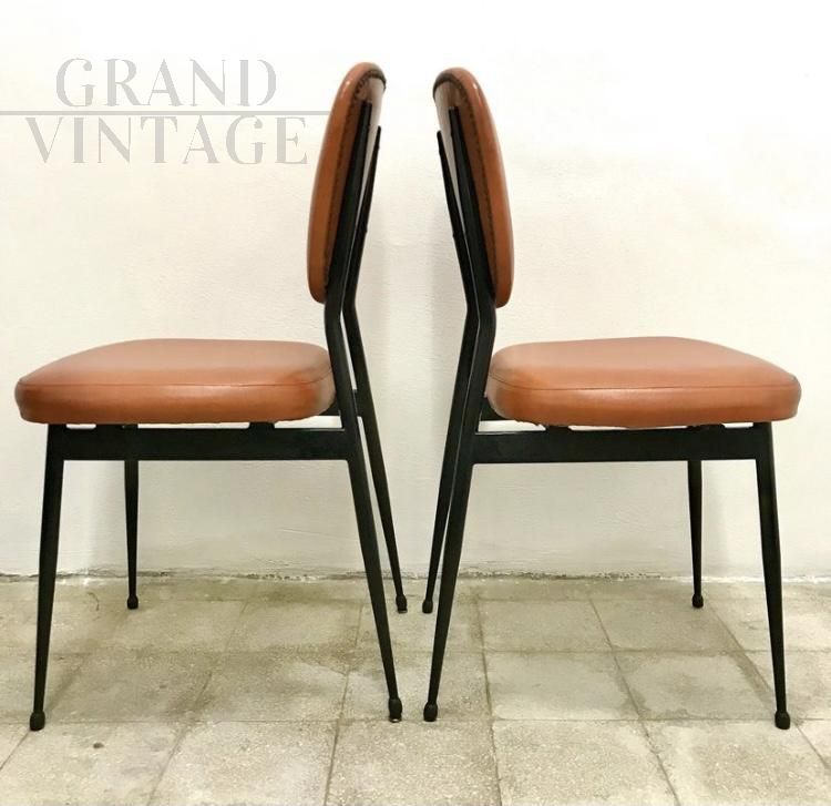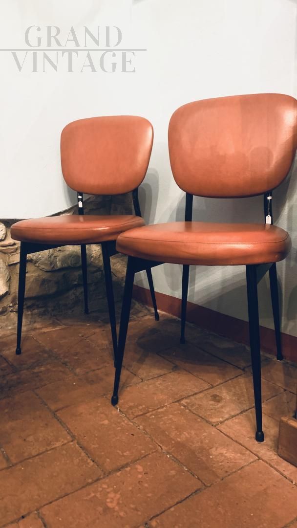Pair of 60s chairs with black rubberized iron structure and original padding lined in orange brick colored leather, very comfortable and very well preserved.