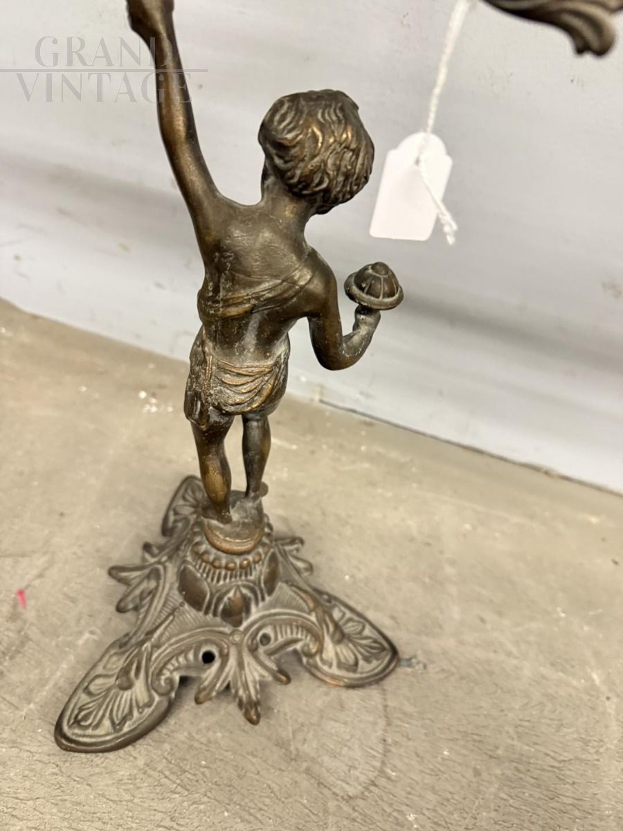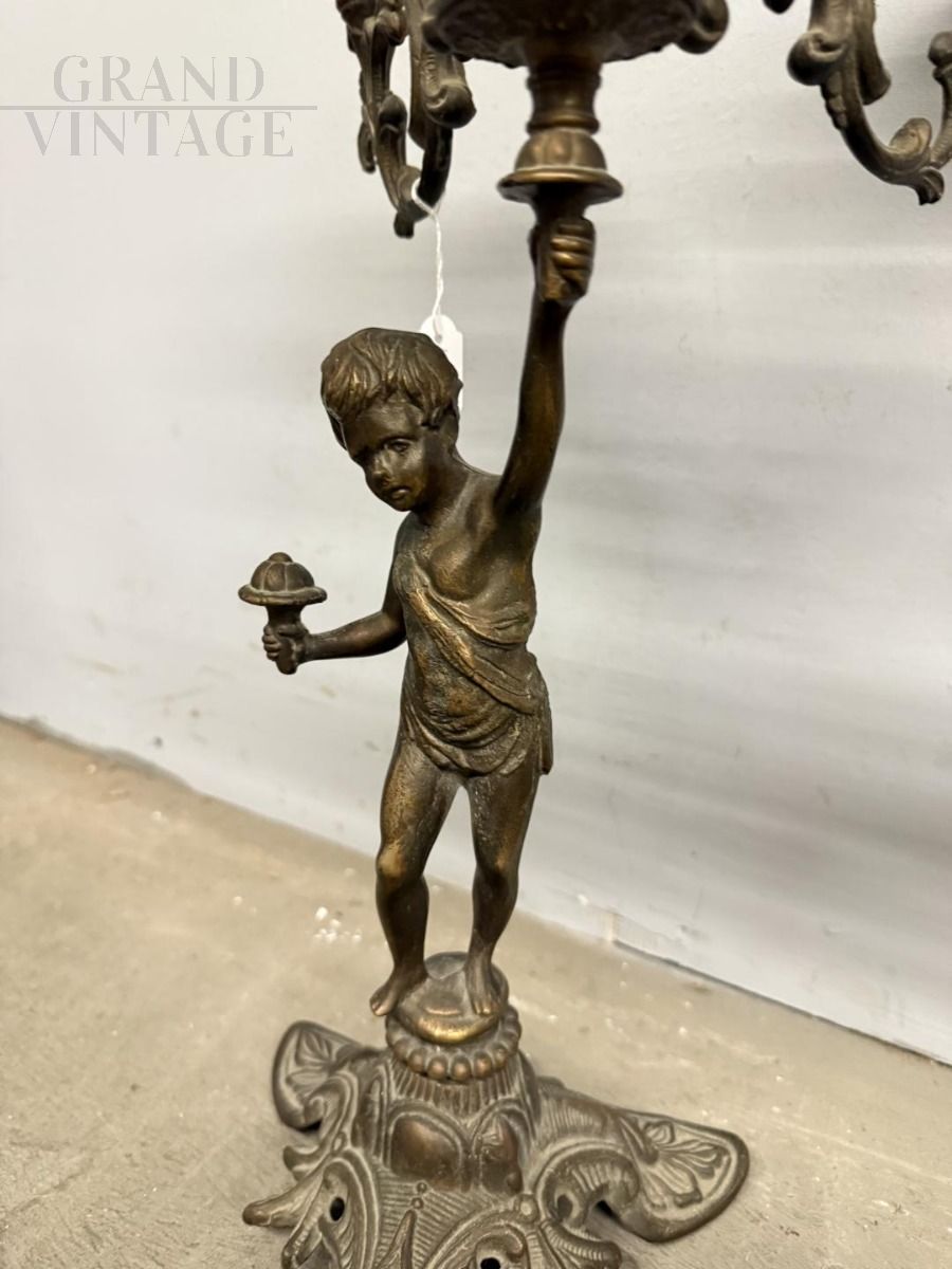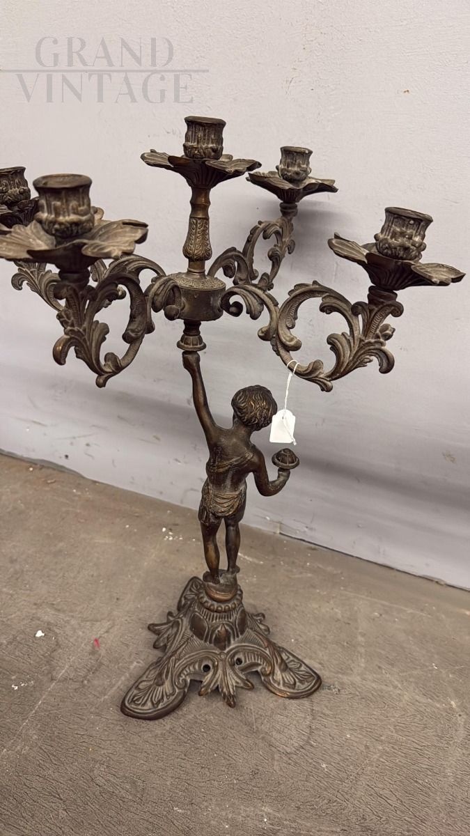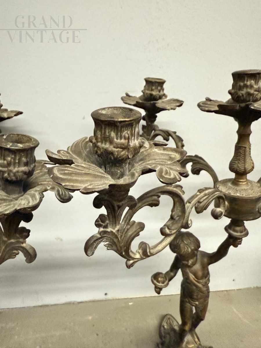 Pair of Art Nouveau candelabra from the early 1900s in finely chiseled bronze with figures of children or cherubs and 5 candle flames, in excellent condition, dimensions: 52 x 42 cm.