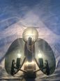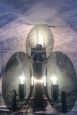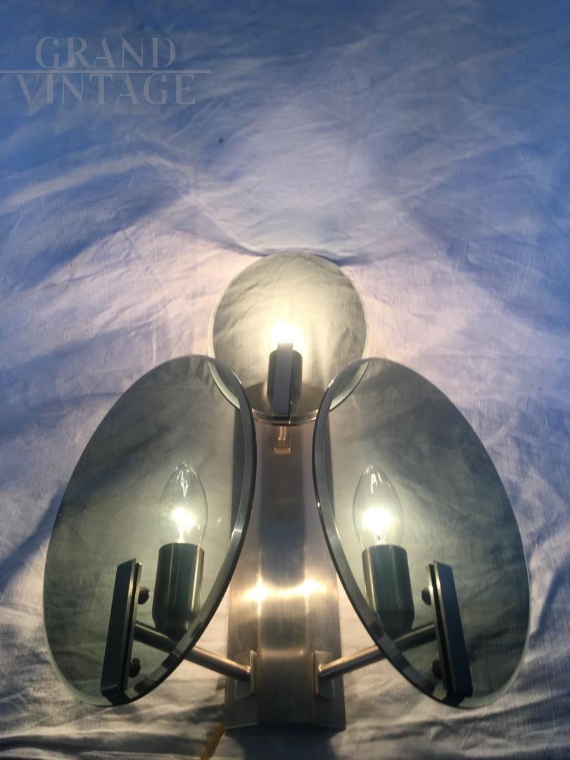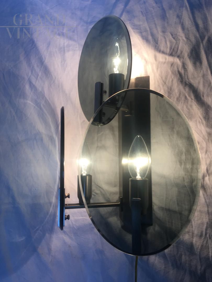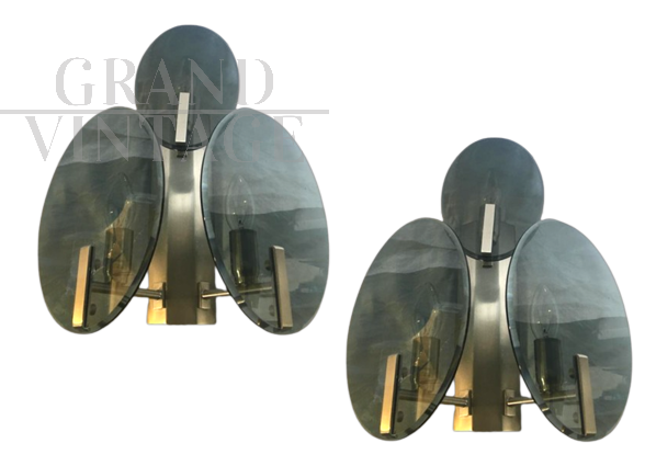 Pair of Veca applique wall lamps with three light points, with beveled smoked glass discs on an iron and brass structure, very special, in good condition, with non-cracked glass. Electrical system redone with three sockets for E14 bulbs, also suitable for LED bulbs. The color of the glasses is smoked tending towards dark green.