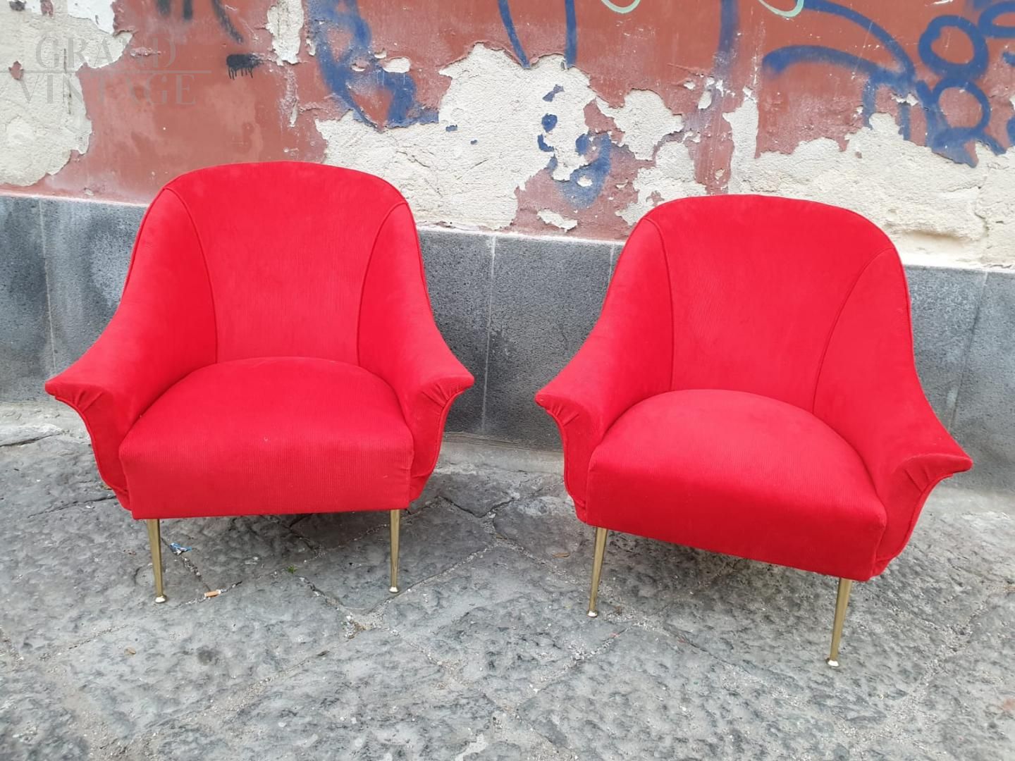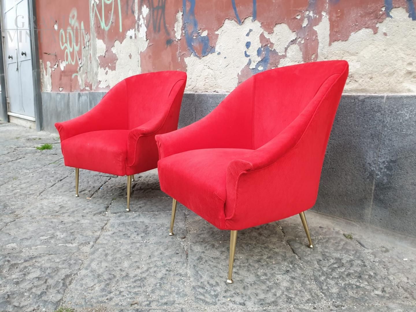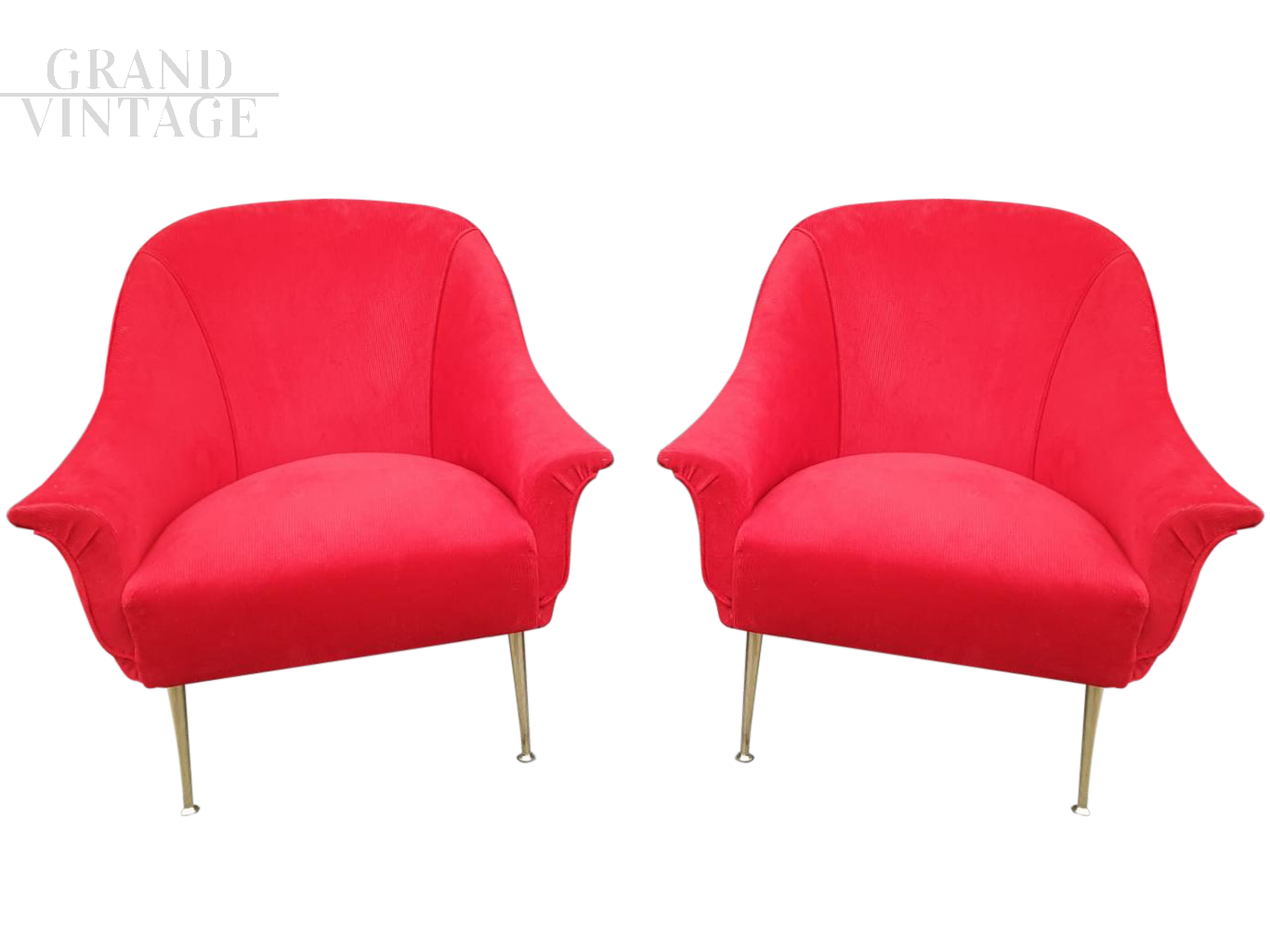 Pair of 50s / 60s armchairs in red velvet, with spiked legs.