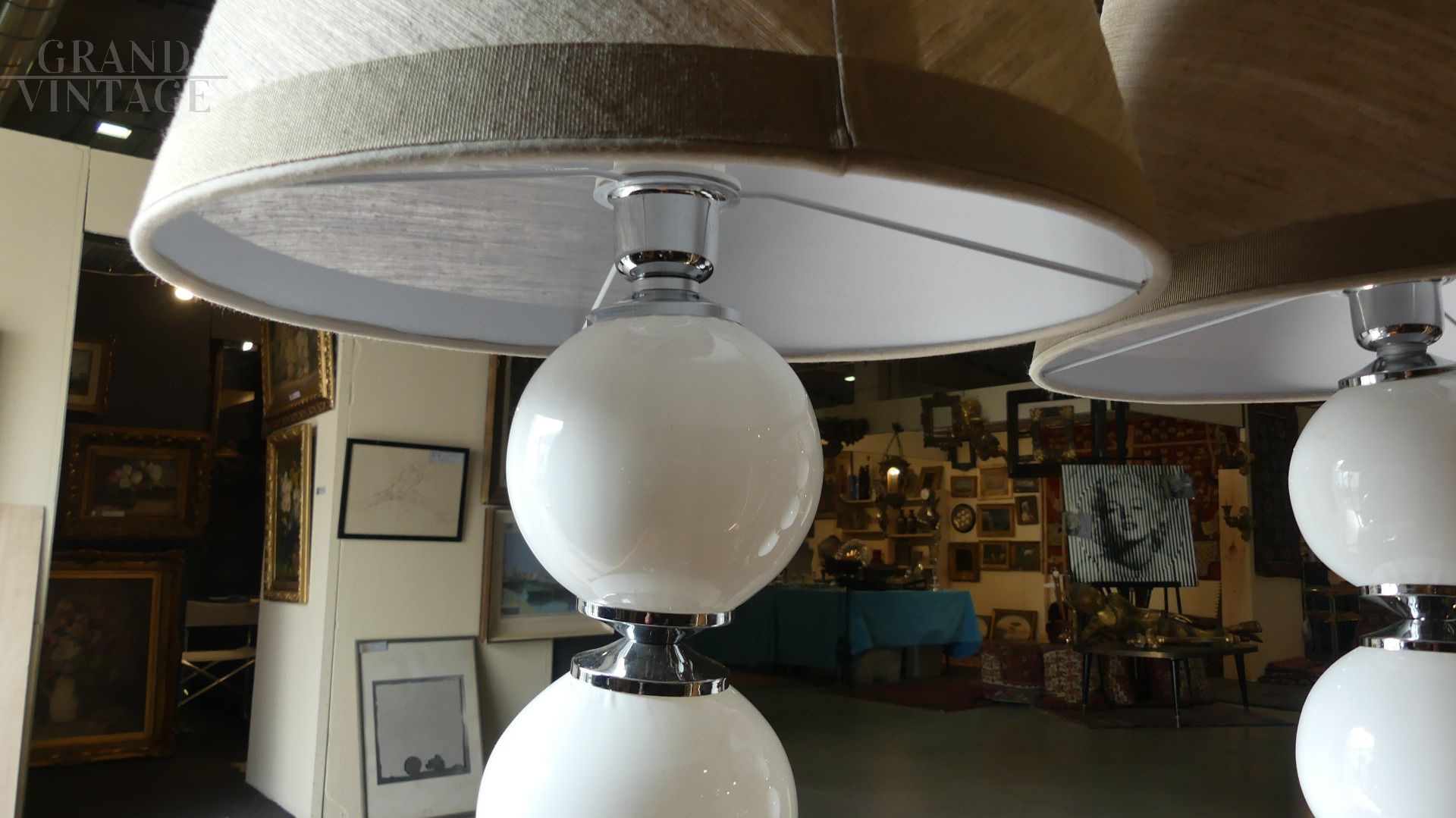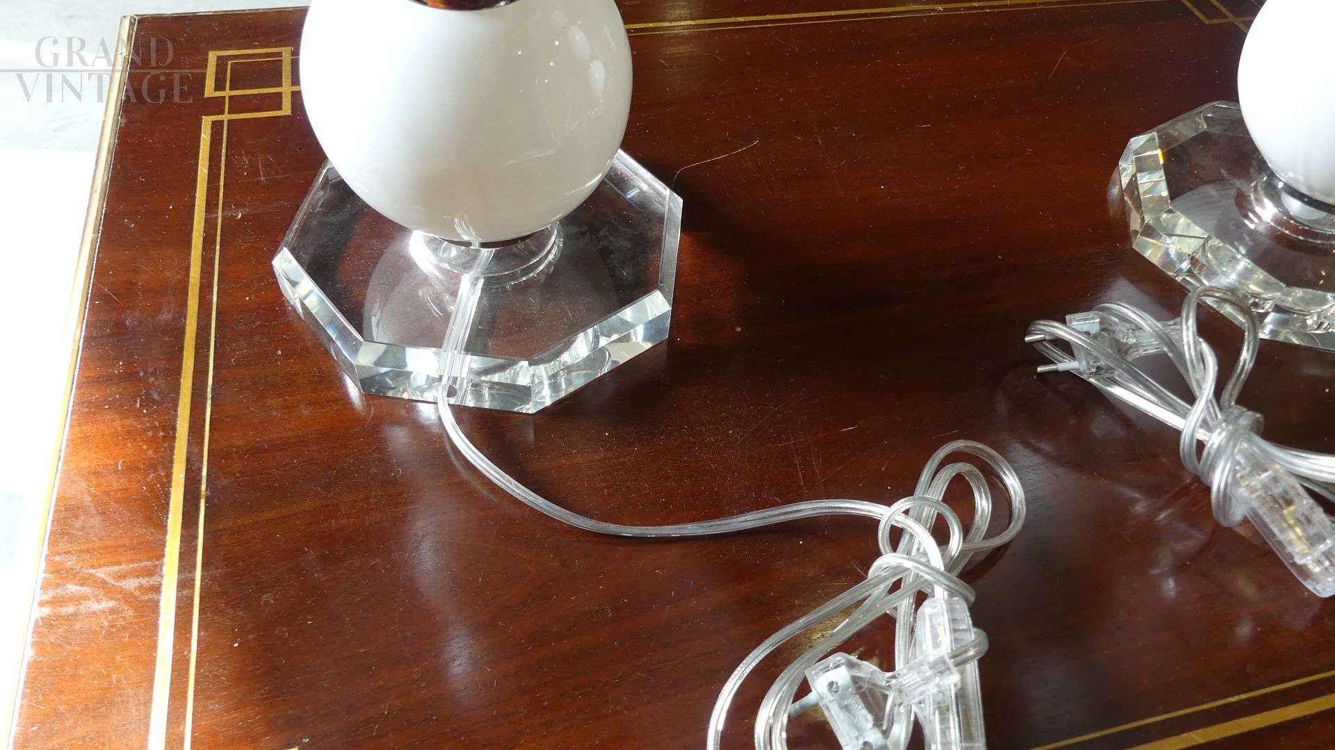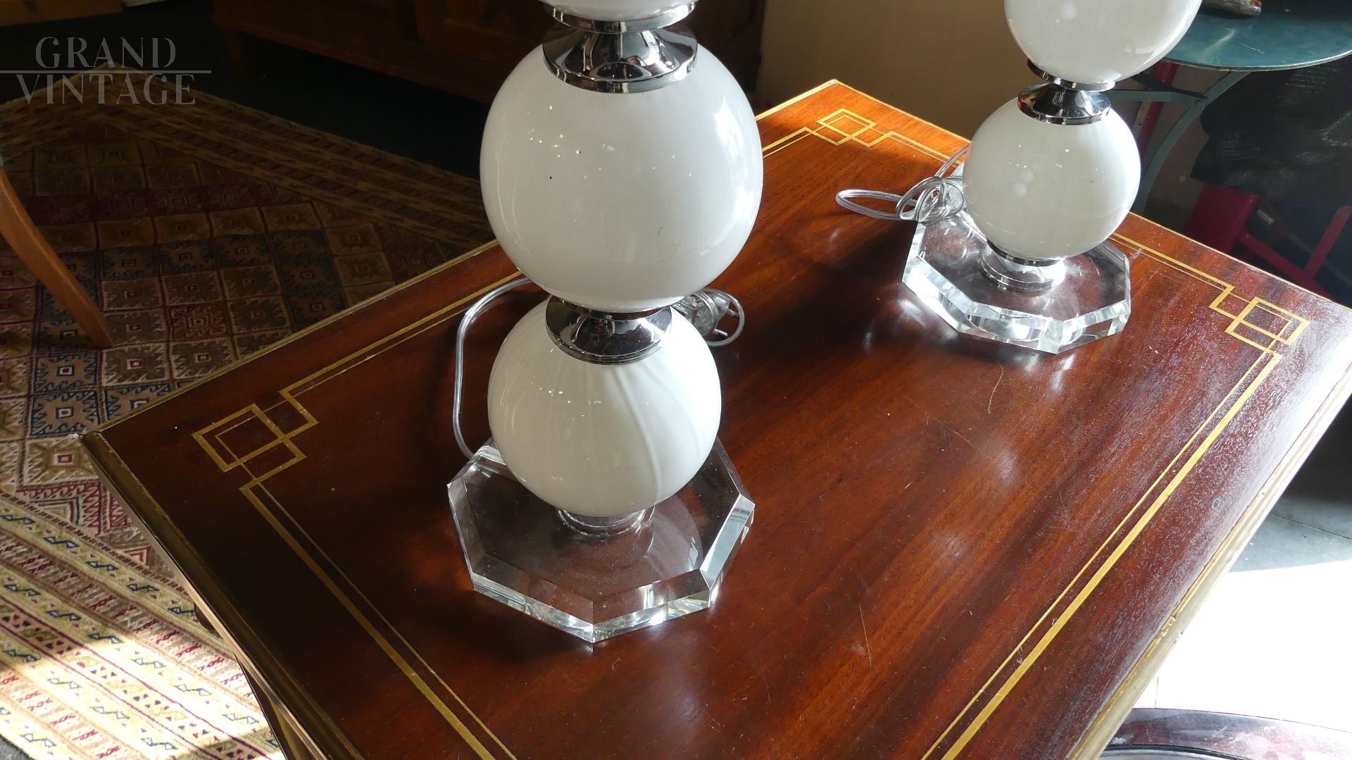 Pair of 70s lamps with opal Murano glass spheres, handmade lampshade, steel stem and plexiglass base.