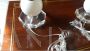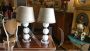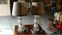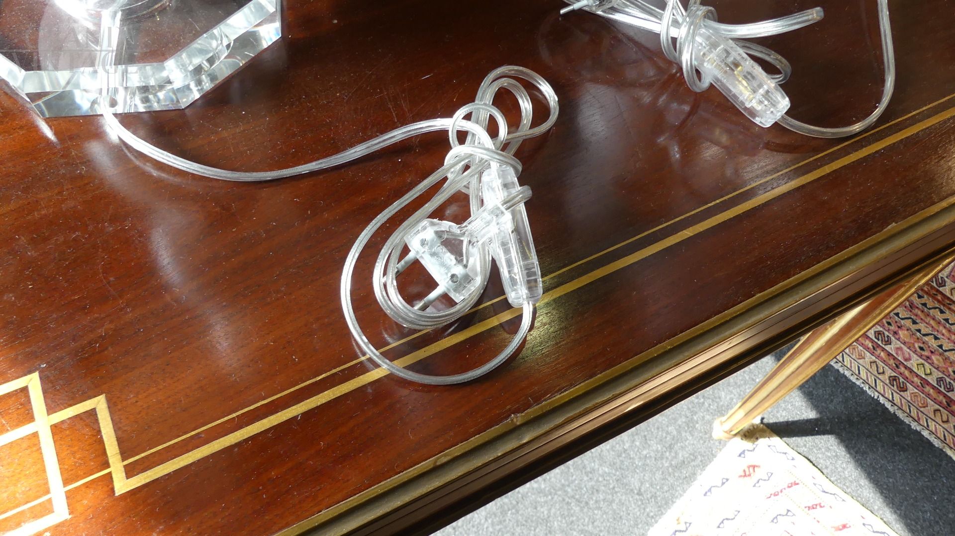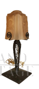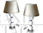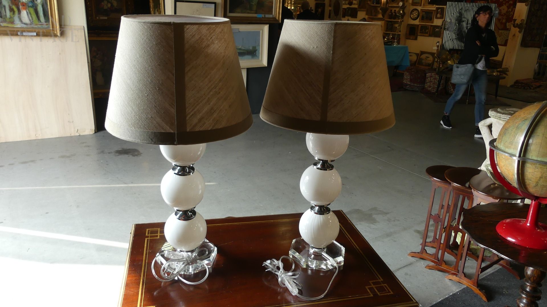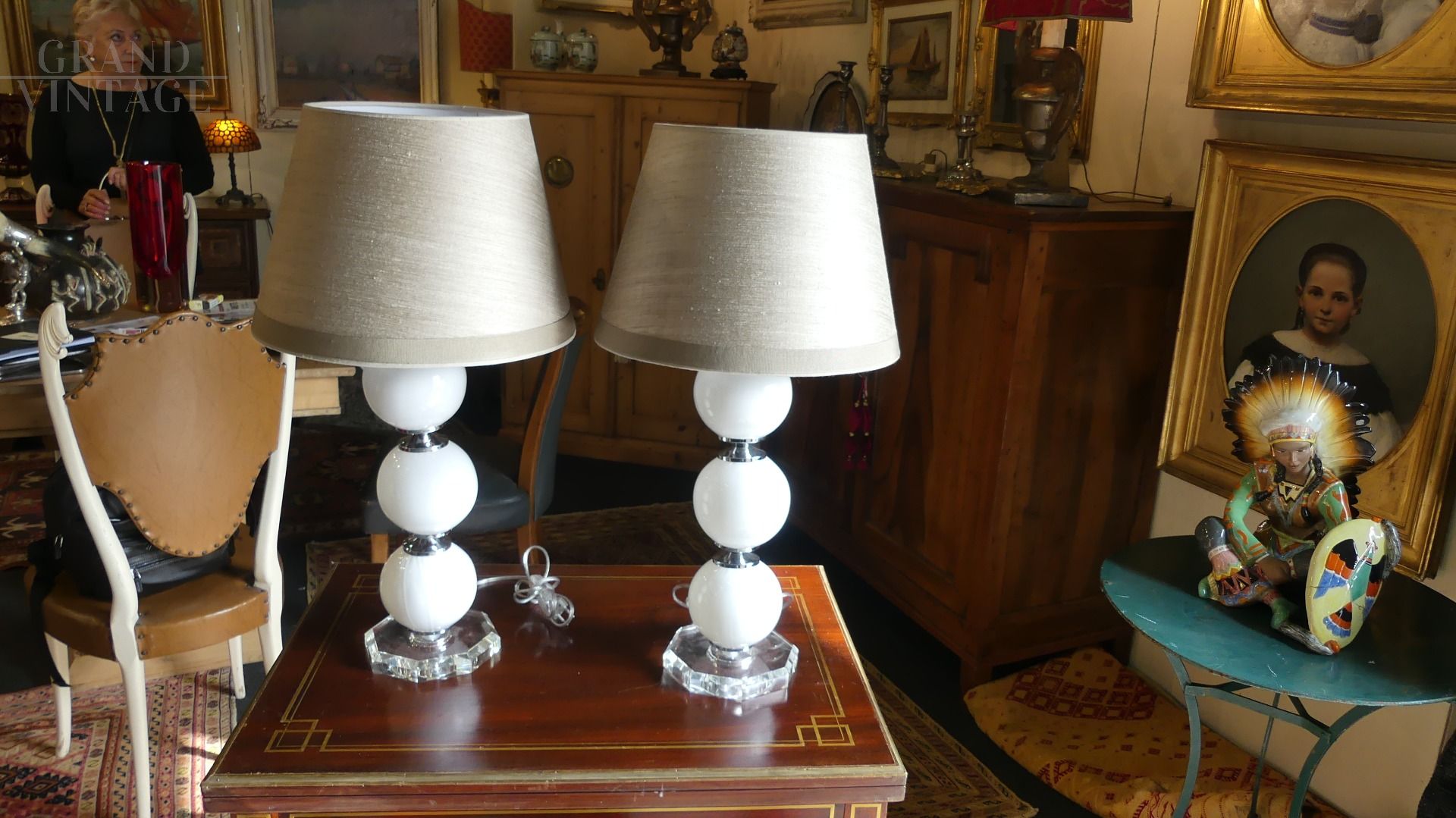 Pair of 70s lamps with opal Murano glass spheres, handmade lampshade, steel stem and plexiglass base.