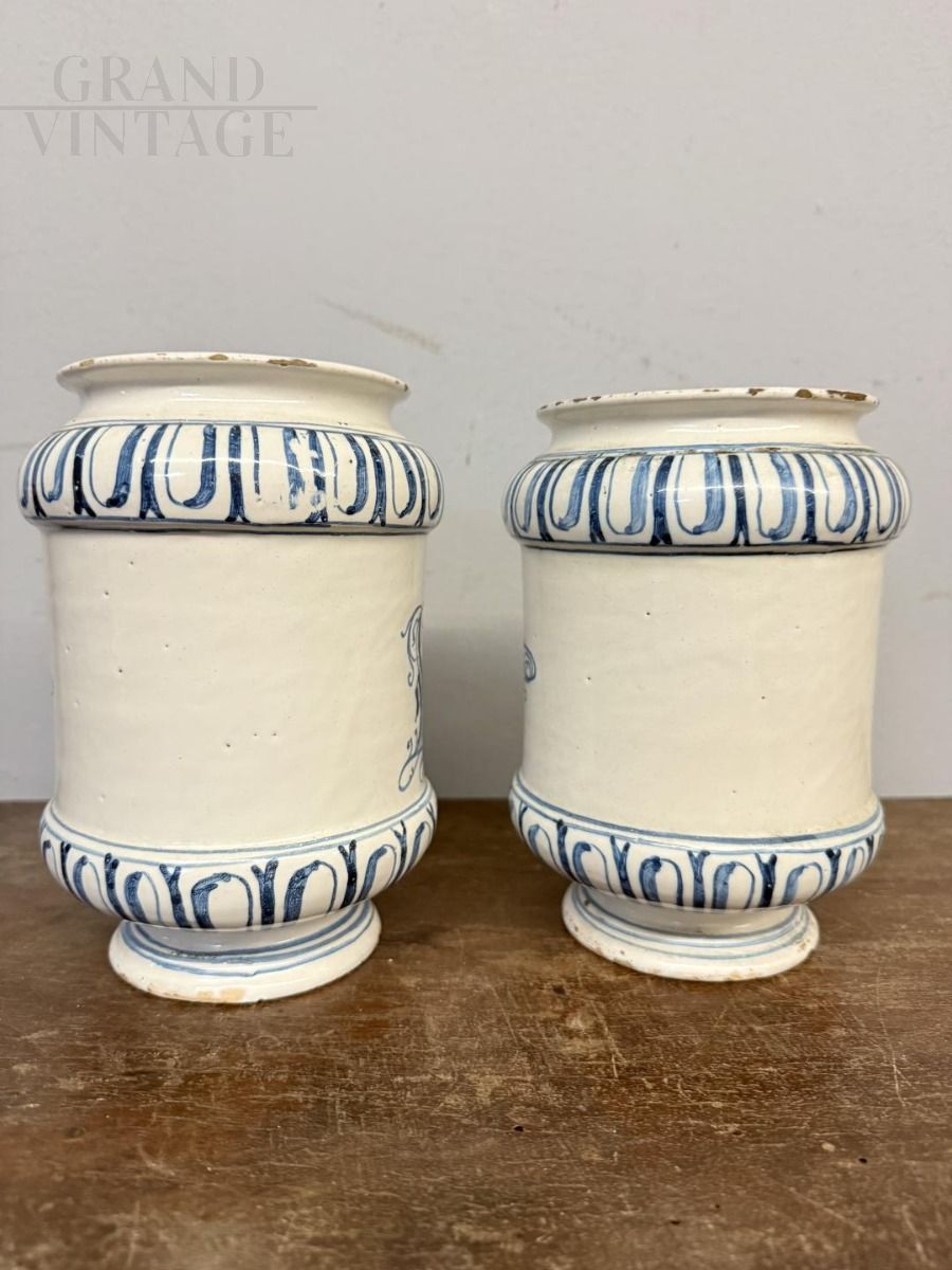 Pair of antique 18th century apothecary jars in white albarello ceramic with blue writing, Italy - Bassano 18th century, 20 x 14 cm.