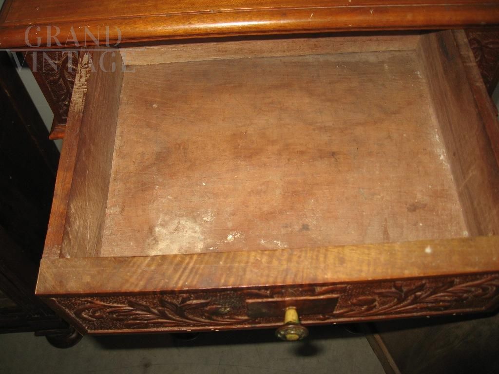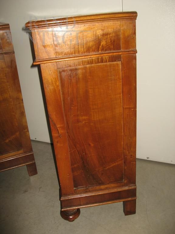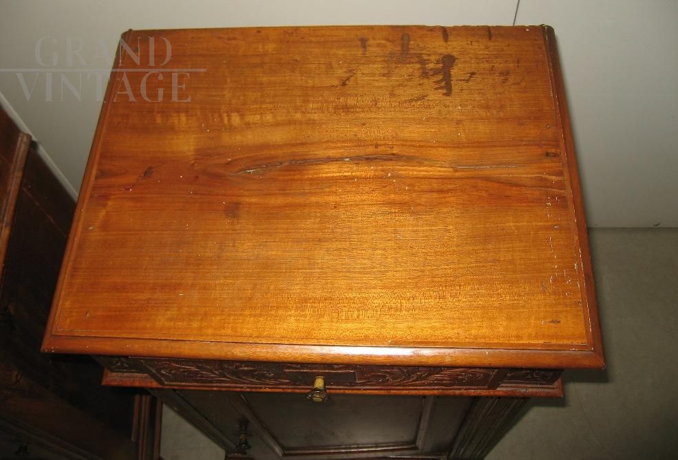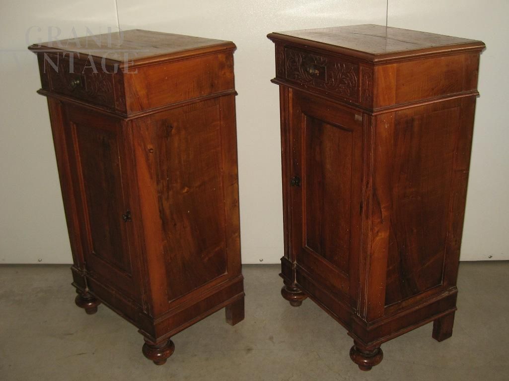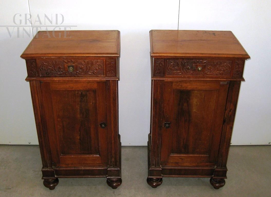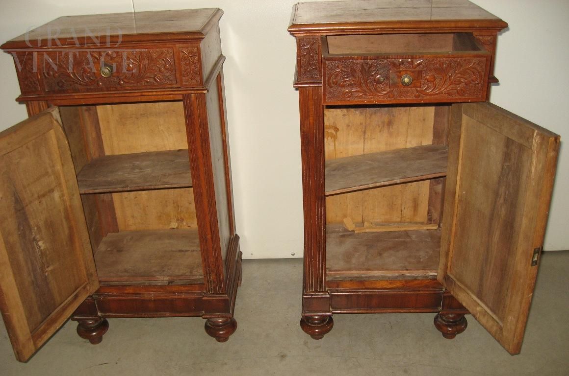 Pair of antique Baroque style bedside tables in solid walnut with walnut veneered small parts, featuring pretty floral carvings on the drawers and an internal shelf. Made in Italy - Lombardy in the early 1900s. In good general condition, with original patina, not restored.