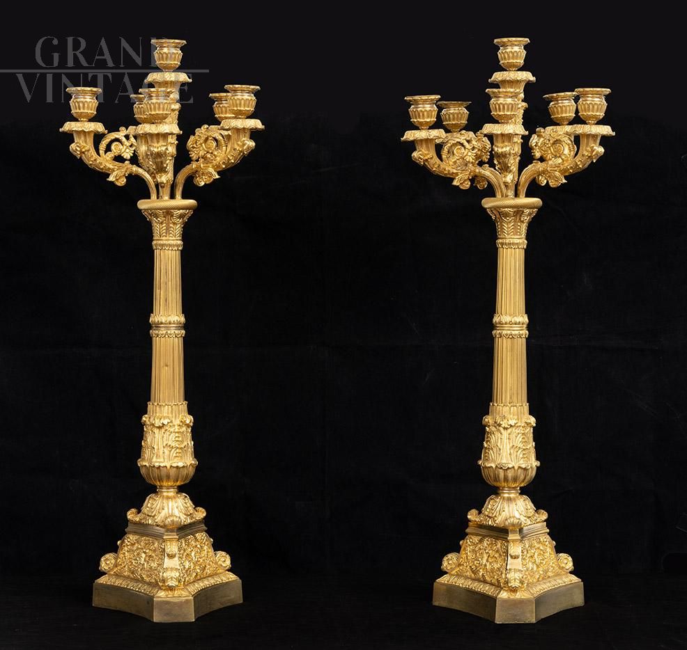 Pair of antique Charles X six-flame gilded bronze candelabra