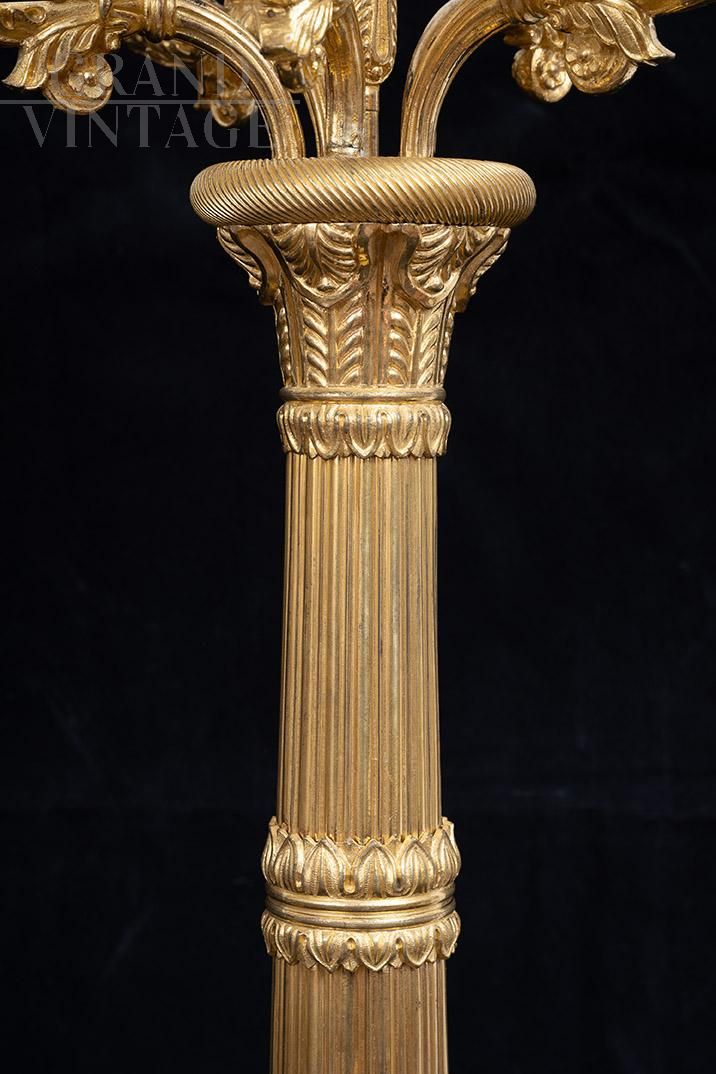 Pair of antique French candelabra from the Charles X period in gilded bronze belonging to the early 19th century. The triangular base is surmounted by a fluted shaft where five volute arms spread out with another candle holder element in the center. The base has a double chiselling enhanced by the smooth part of the support. General Condition: Good Condition. Origin: France (1820/30)