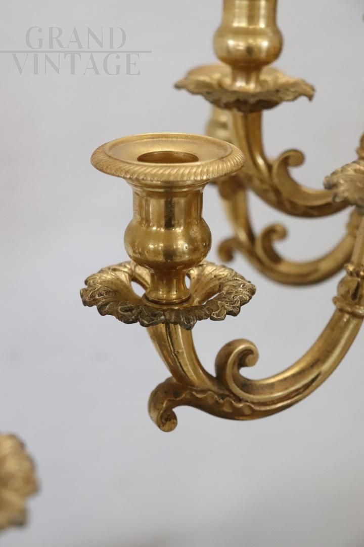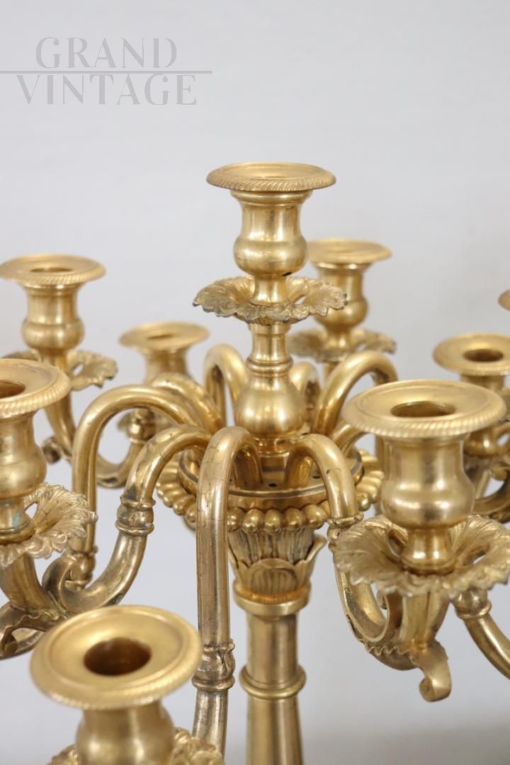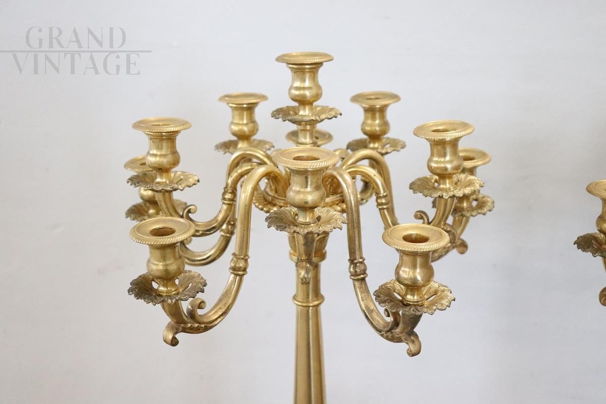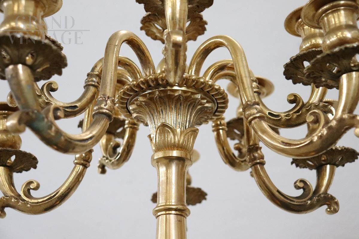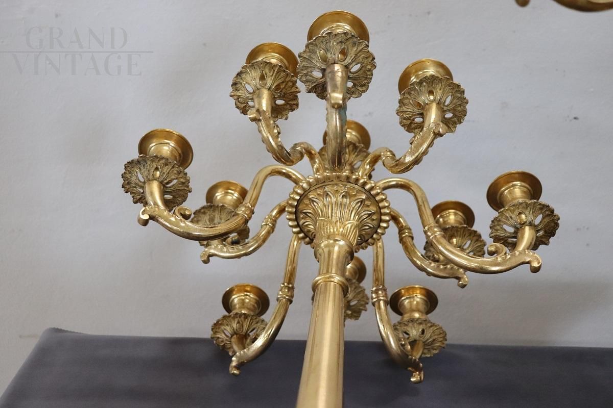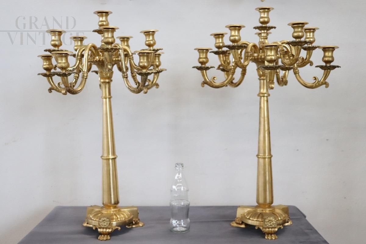 Majestic pair of antique gilded bronze candelabra candlesticks from the 19th century. Rare pair of large antique gilded bronze table candlesticks with twelve flames each, dating back to the end of the 19th century. Great artistic quality. Characterized by a circular base on feral feet, the arms have a double spiral. The bronze presents a beautiful decoration of classic taste. Majestic, perfect for embellishing an important table, they will be admired by all your guests. Possibility, upon request, to carry out electrification, they are already set up but the electrical system is missing. Excellent condition, price negotiable.