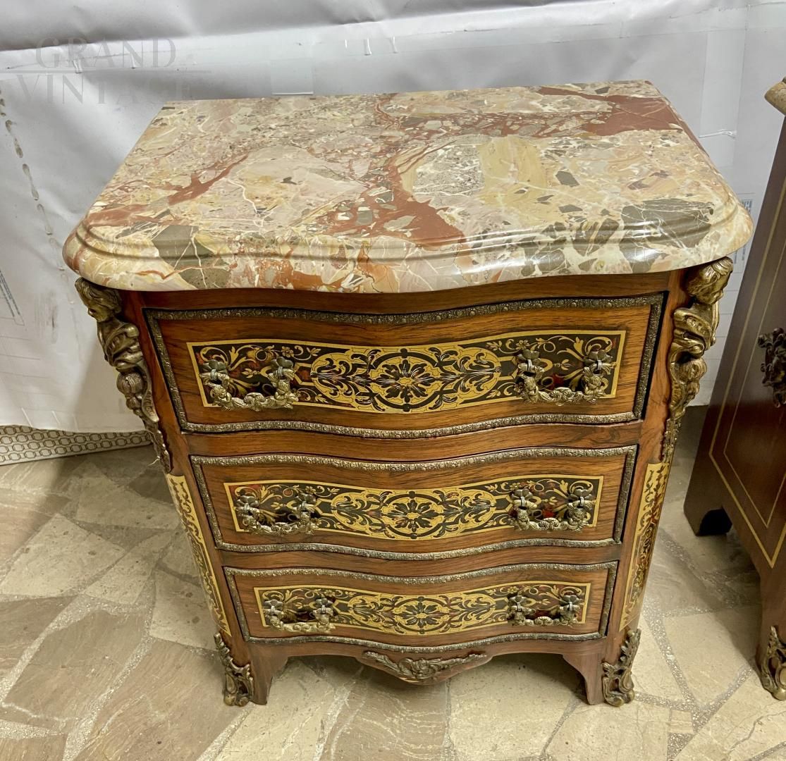 A pair of elegant Boulle-style bedside tables, dating to the second half of the 19th century, during the Napoleon III era. Crafted from ebonized wood, they feature richly engraved brass inlays and exquisitely crafted gilded bronzes, perfectly in keeping with the ornamental style of the period. The two bedside tables are topped with original pink marble tops. The set has been meticulously preserved, remaining in excellent structural and aesthetic condition.