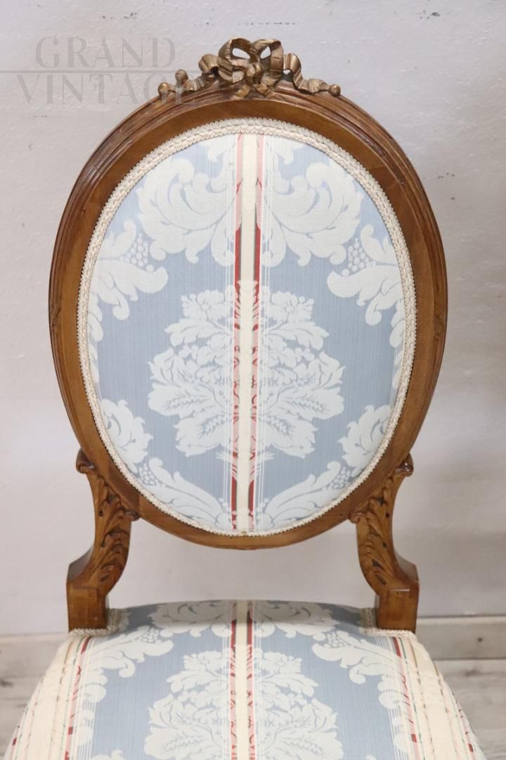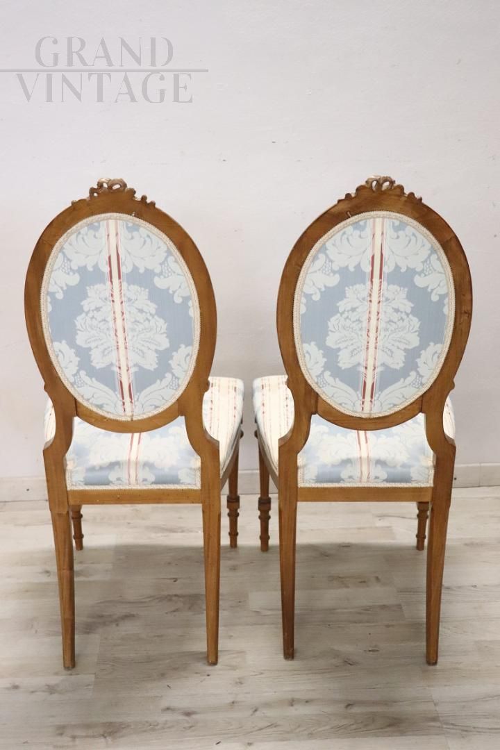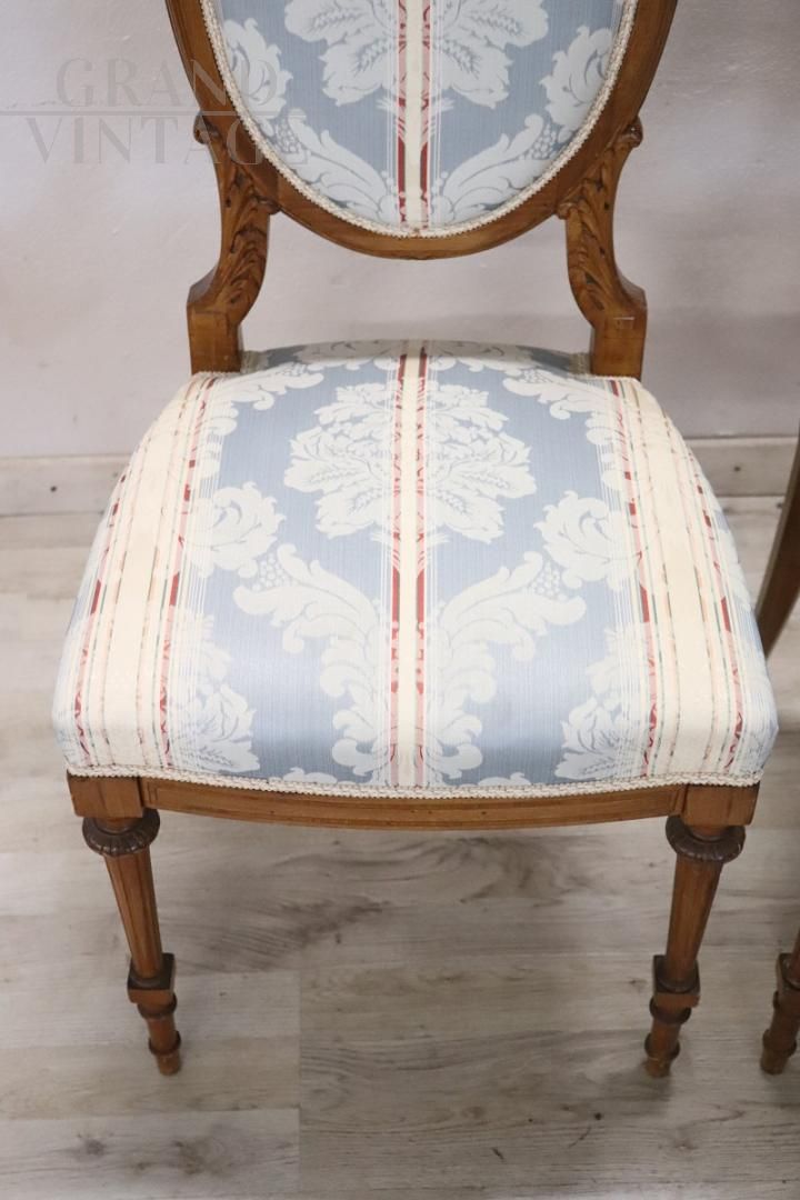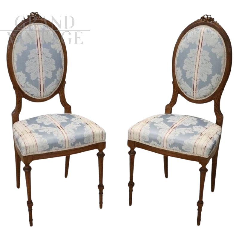 Refined pair of antique padded chairs with medallion backs, dating back to the first decades of the 20th century. The chairs are made of solid beech wood; the seat and backrest are comfortable and padded, covered with an elegant fabric decorated with a damask pattern. The wood features refined carved decorations, the line and decorations are reminiscent of the Louis XVI style. Perfect condition of the wood, padding and fabric. Ready to be placed in your home! Offered at a negotiable price. Seat height 49 cm.