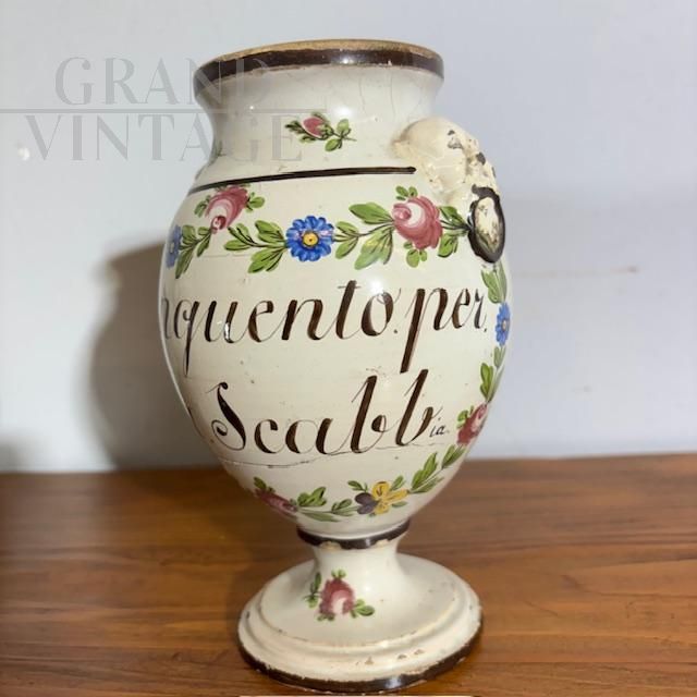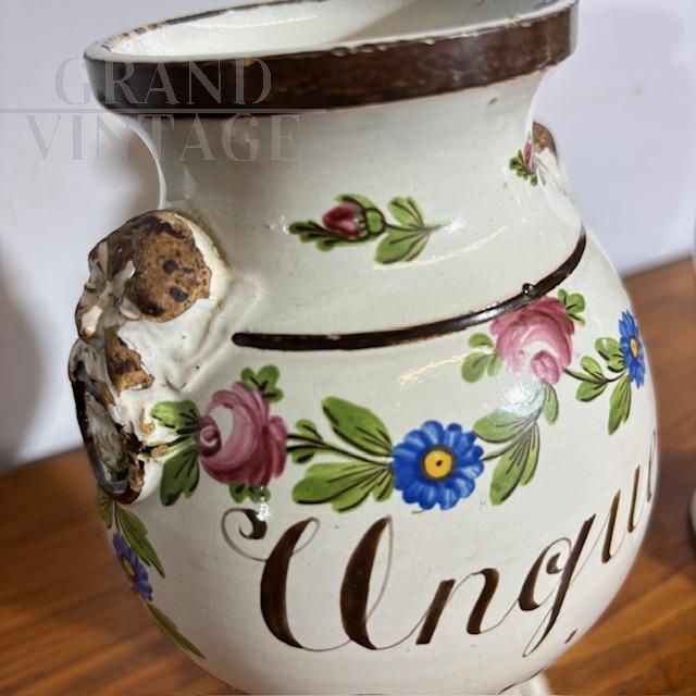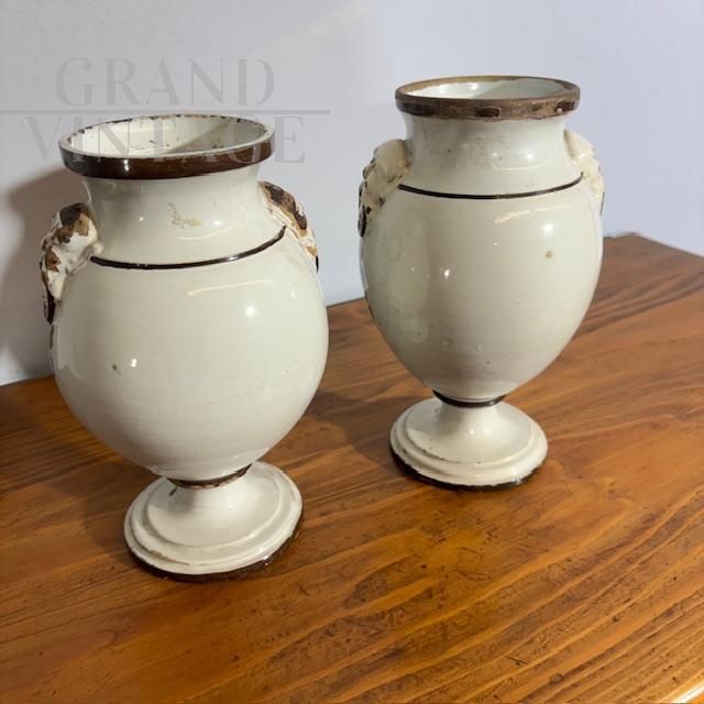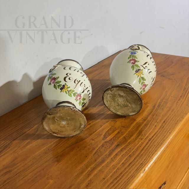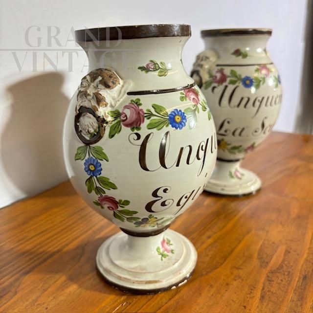 A rare pair of late 18th-century white ceramic apothecary jars with hand-painted mask faces on the sides and the inscriptions "Egyptian Ointment" and "Scabies Ointment." They are 20 cm tall. Originally used in pharmacies for galenic preparations, the jars are in good condition and show normal signs of wear and tear. One jar, in particular, has some cracking, as shown in the photo.