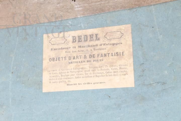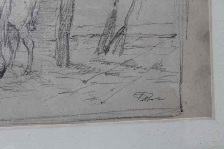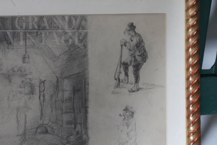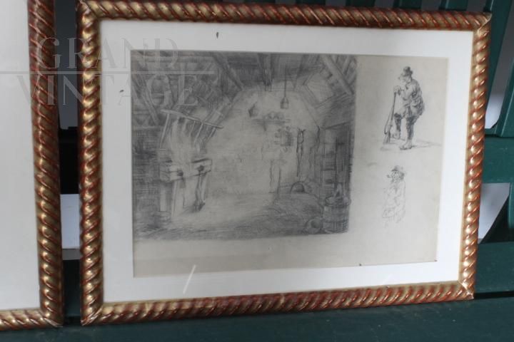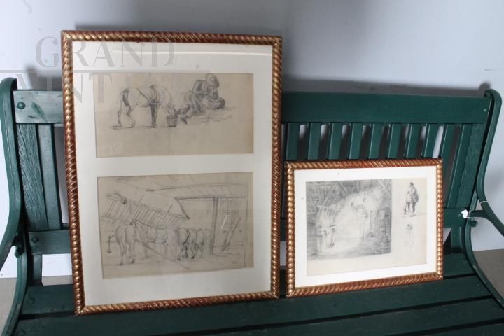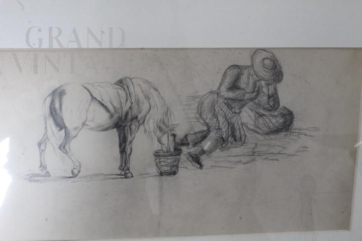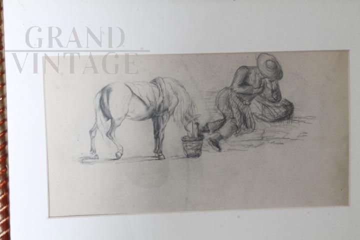 Pair of antique paintings from the 19th century with pencil drawings on paper depicting horses and characters, signed and complete with gilded and twisted wooden frames. In very good state of conservation.