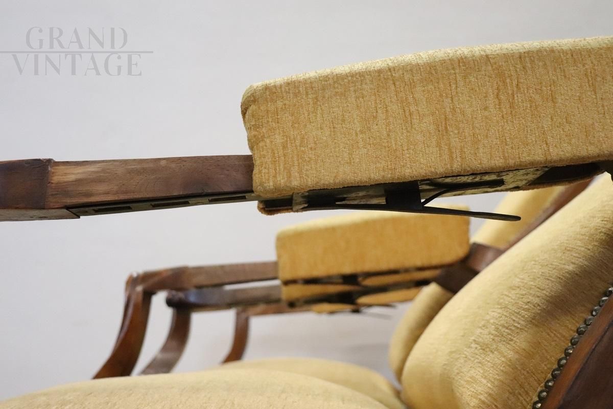 Introducing a magnificent pair of antique Italian upholstered armchairs, crafted in the mid-19th century during the elegant Louis Philippe period. These exquisite armchairs are constructed from high-quality walnut and feature a timeless design that balances comfort and style. The seats and backs are generously padded and upholstered in a rich deep yellow fabric that adds a touch of warmth and sophistication to any space. A distinctive feature of these armchairs is the reclining backrest, allowing for maximum relaxation and versatility of use: perfect for enjoying a good book, conversation or simply relaxing after a long day. Excellent condition, price negotiable. Seat height 40 cm