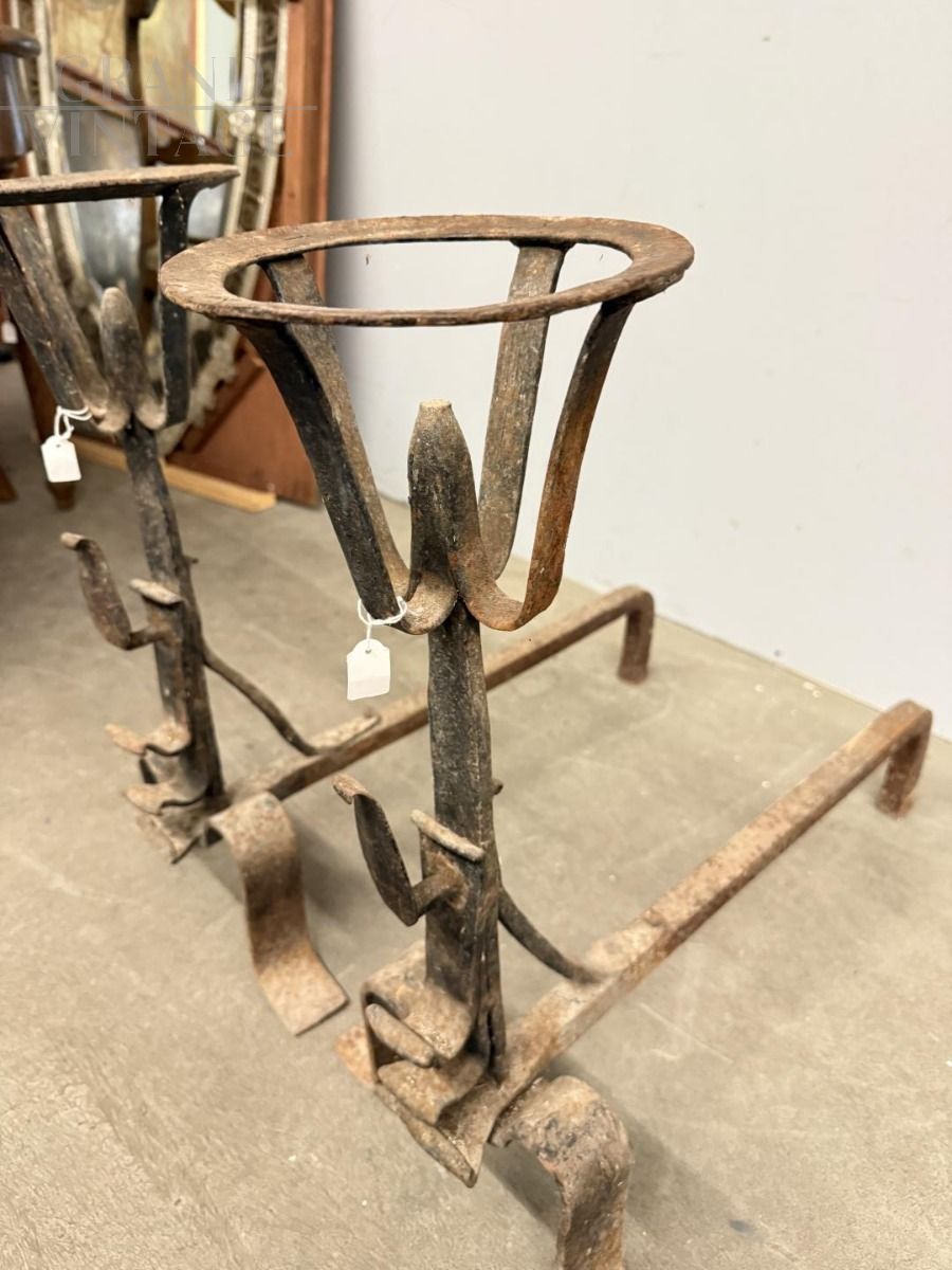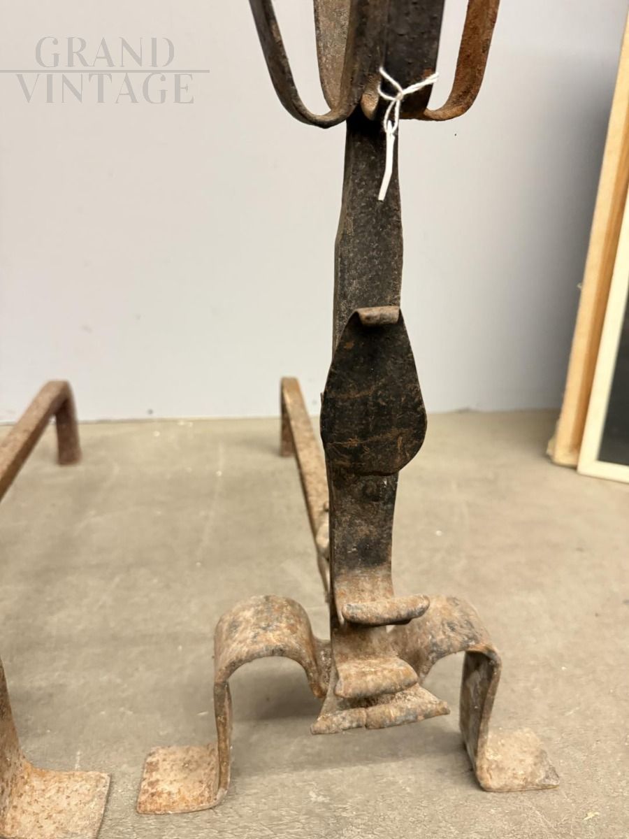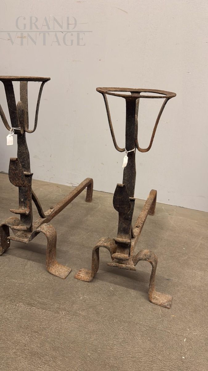 Pair of antique Tuscan andirons in wrought iron, 18th century