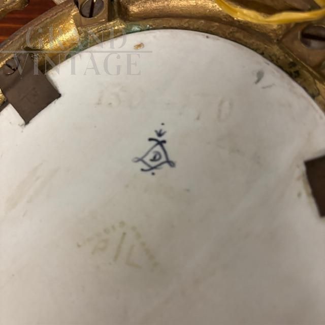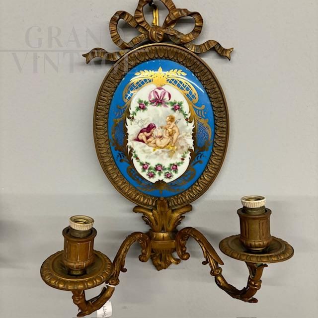 Pair of antique wall lights in bronze and painted Limoges ceramic