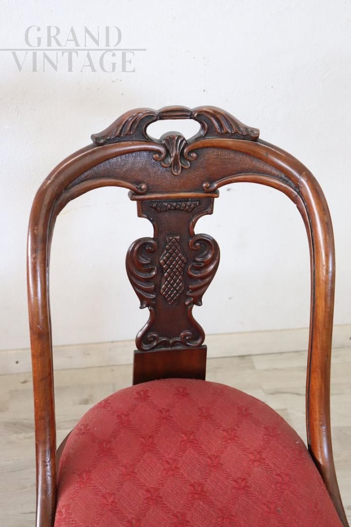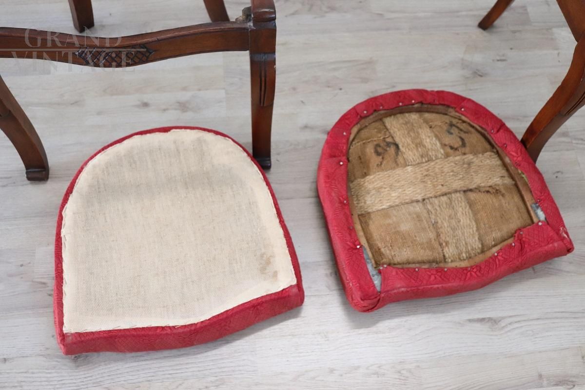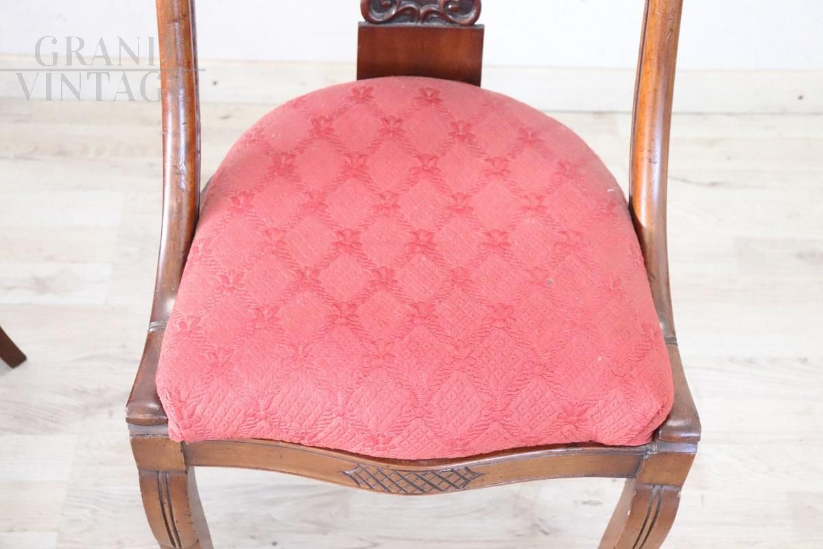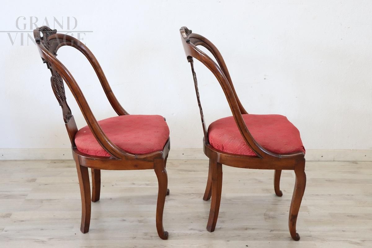 Beautiful pair of antique gondola chairs in solid walnut from the first half of the 19th century, Charles X period Italian cabinet-making. The chairs are characterized by an enveloping and refined backrest, embellished with an elaborate decoration hand-carved in walnut wood. The seat is large and comfortable with padding covered in elegant red fabric. Excellent condition of the wood with light wear of the fabric and padding, replacement is recommended. Price negotiable.