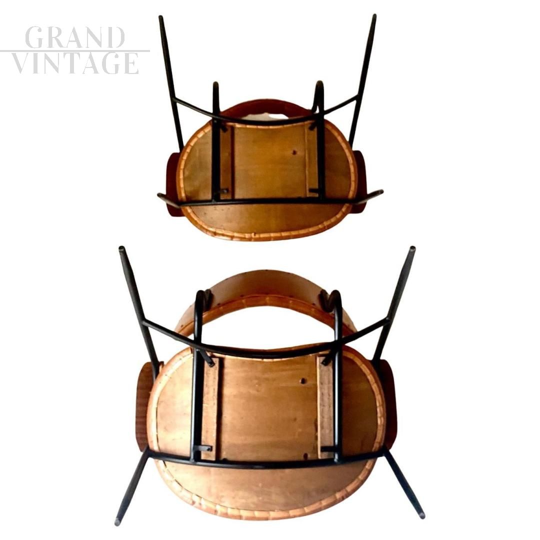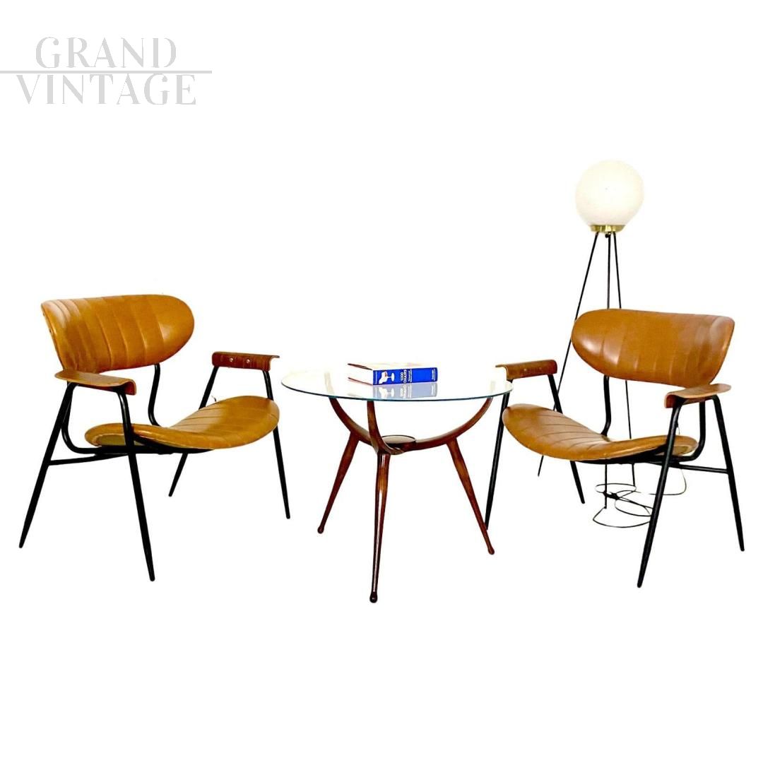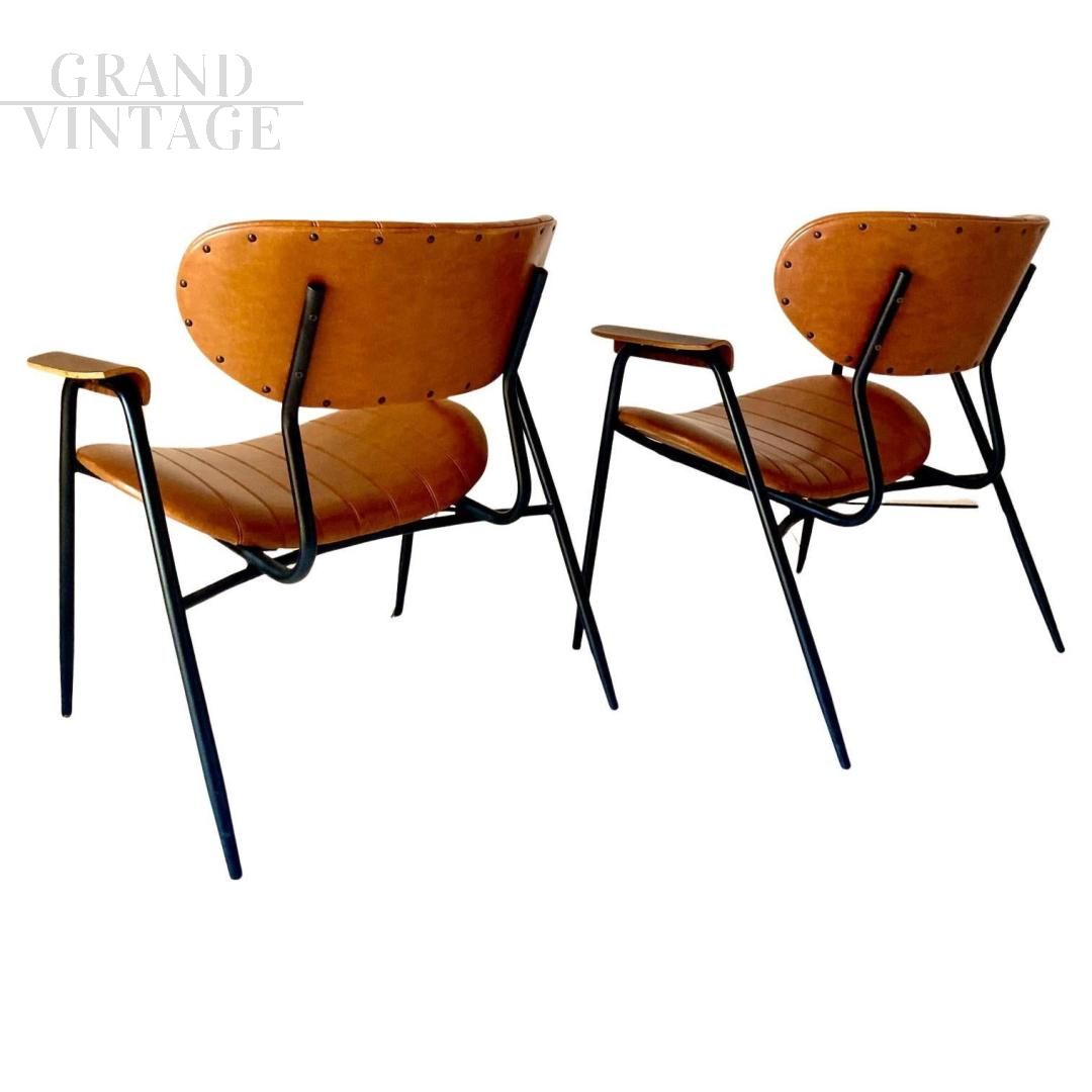 Pair of beautiful armchairs designed by Gastone Rinaldi for RIMA, made with a black curved metal frame with wooden armrests and brown imitation leather fabric, Italian mid-century modern design from the 1960s. With a very refined design with comfortable curved seats, the armchairs have been partially restored: the metal frame has been repainted while the fabric has been cleaned and polished. The armrests have been refinished. The set is sold in very good condition with only a few signs of aging on the leather.
