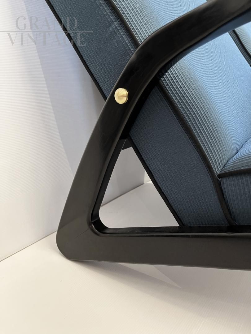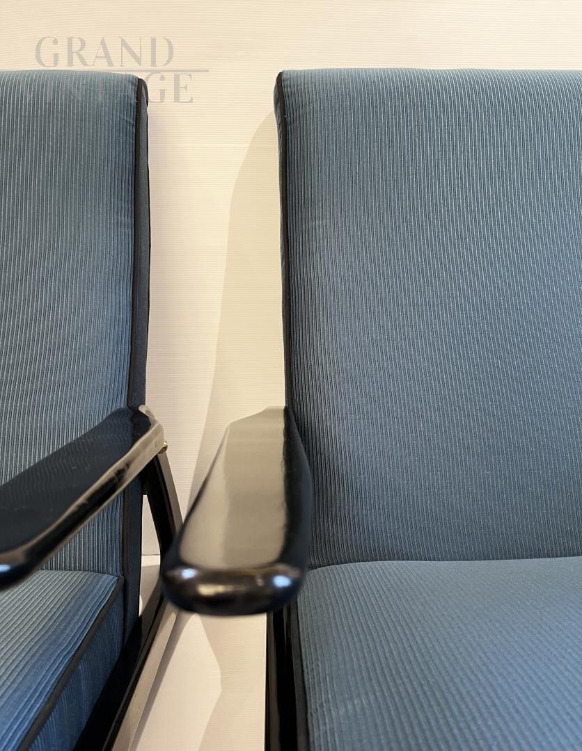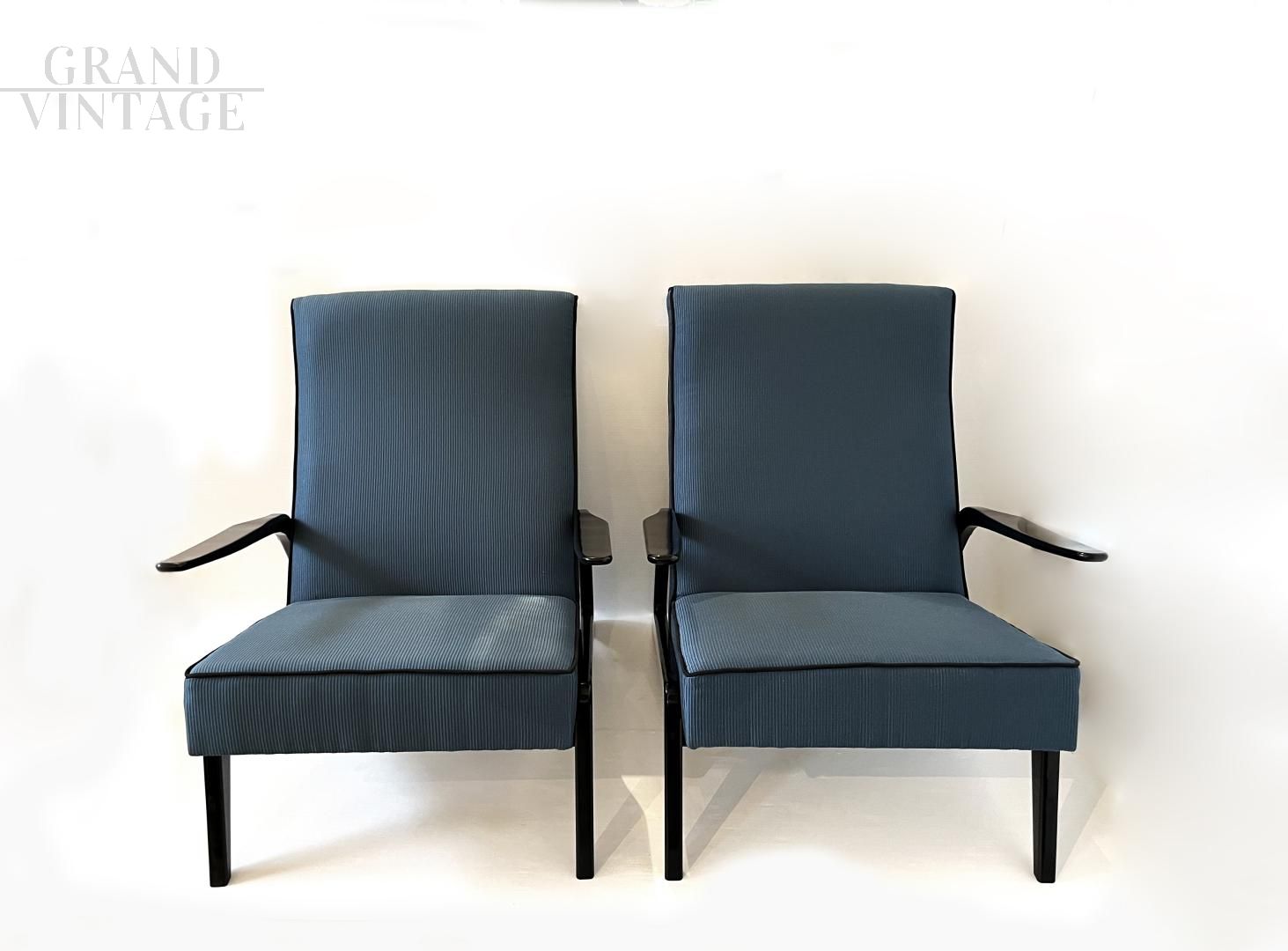 Particular pair of armchairs designed by Alfred Hendrickx for Belform with structure in ebonized cherry and upholstery in blue striped cotton with black profiles, Belgium 1950s.