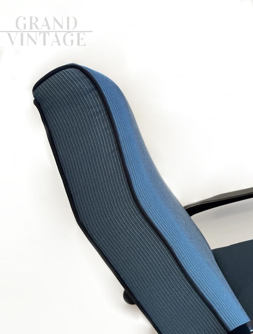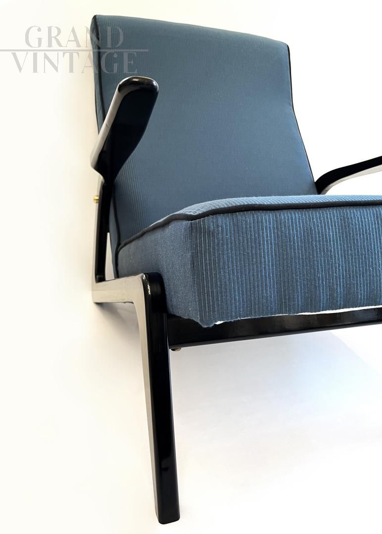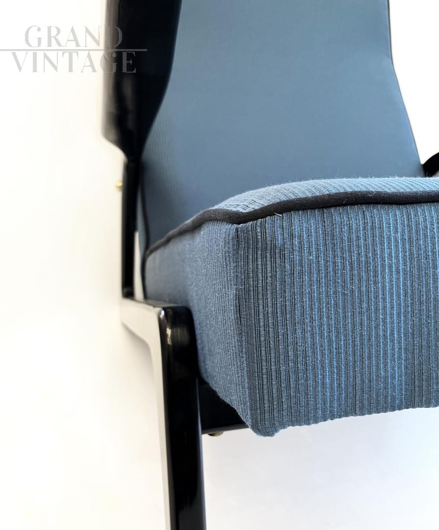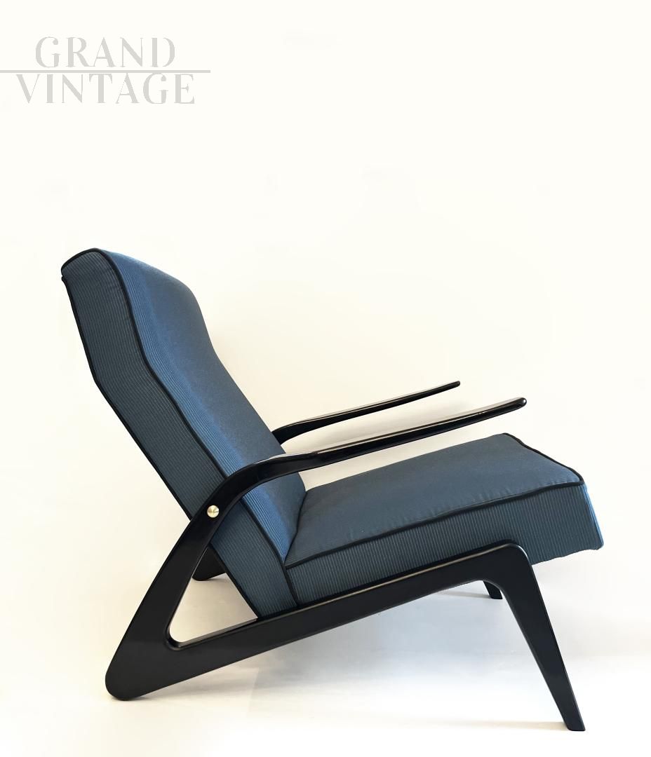 Particular pair of armchairs designed by Alfred Hendrickx for Belform with structure in ebonized cherry and upholstery in blue striped cotton with black profiles, Belgium 1950s.