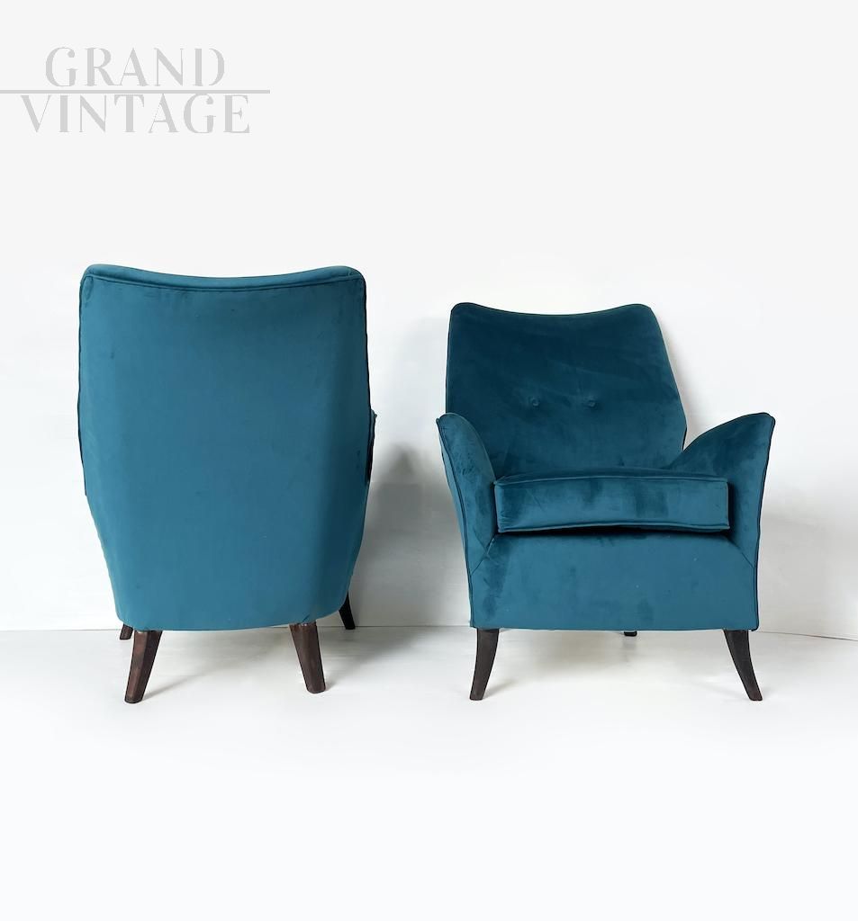 Elegant pair of 1950s armchairs made in Gio Ponti style for ISA Bergamo. The two armchairs have wooden legs and structure and padded parts entirely covered in teal velvet.