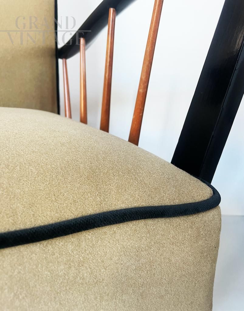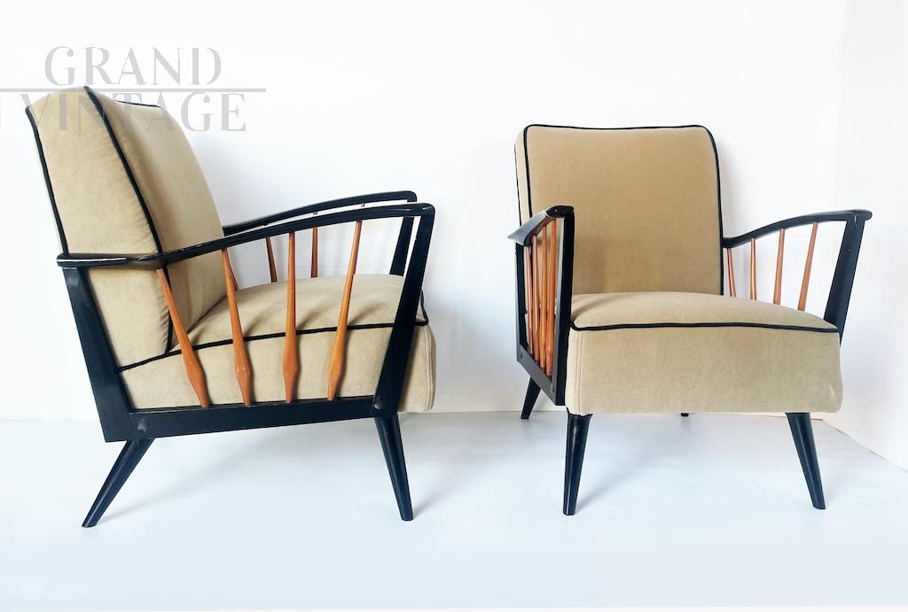Special pair of 1950s Italian Art Deco armchairs made in the style of designer and architect Paolo Buffa (1903-1970). The armchairs have a black lacquered beech wood structure with live wood details. The seat is completely upholstered in sand-colored fabric featuring a black perimeter.