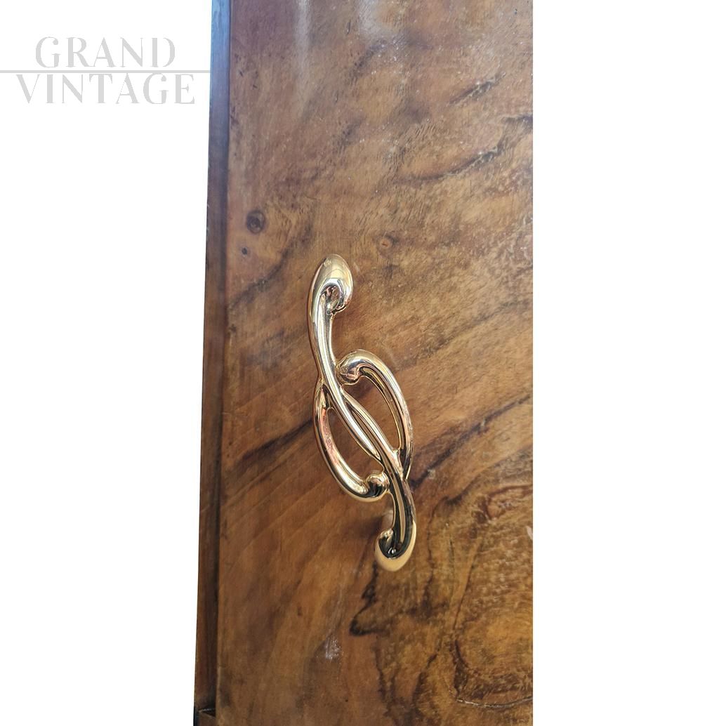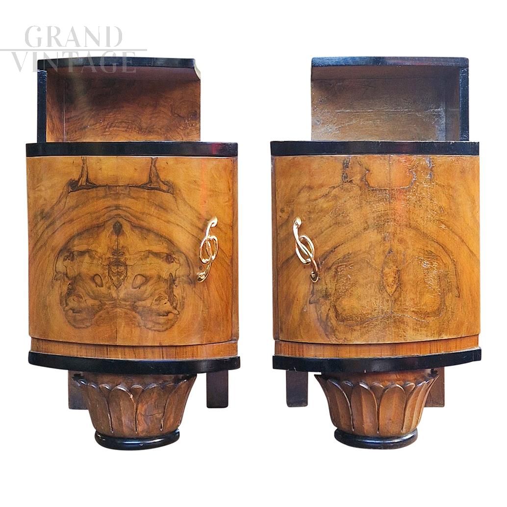 Pair of original Italian Art Deco bedside tables from the 1930s - 1940s in walnut briar veneer, with single-door wavy fronts with mirrored openings, carved bases and glossy black edges. G clef-shaped handles, mirrored upstand with double top.
