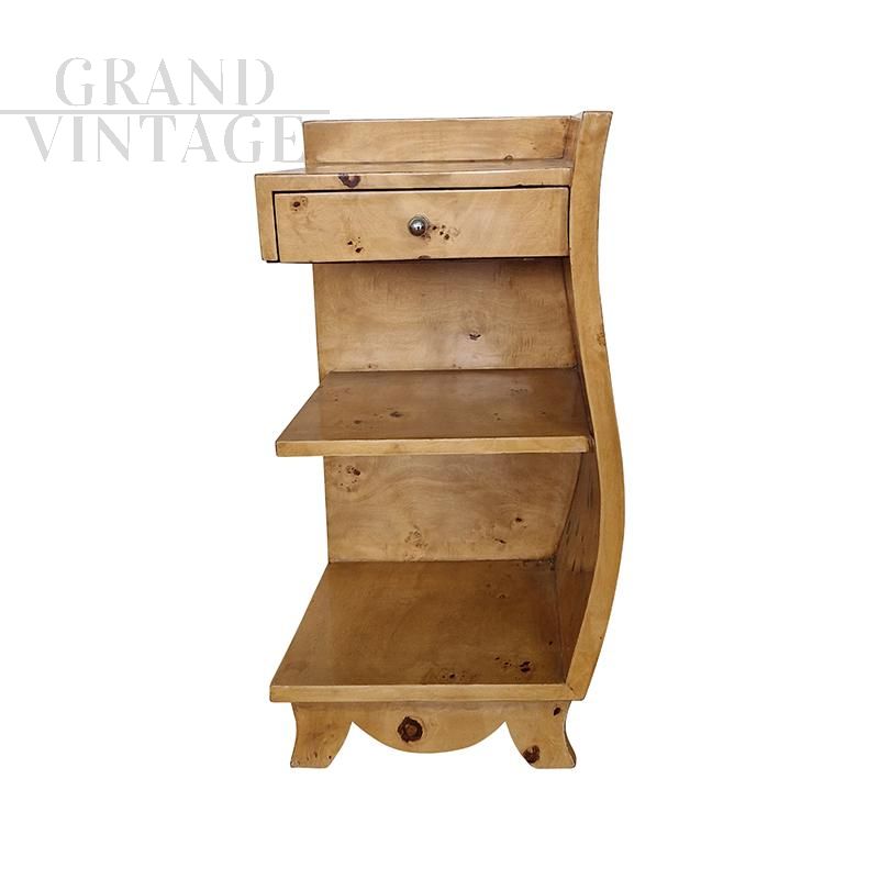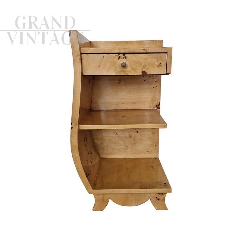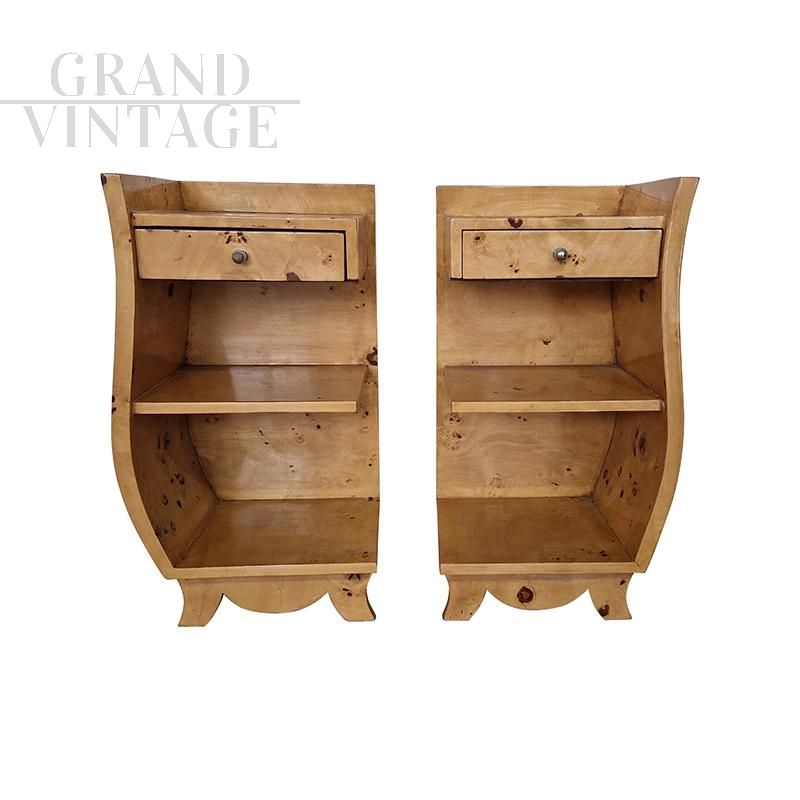 Pair of symmetrical Art Deco bedside tables in birch root with one drawer, the upper surface has a diamond inlay.