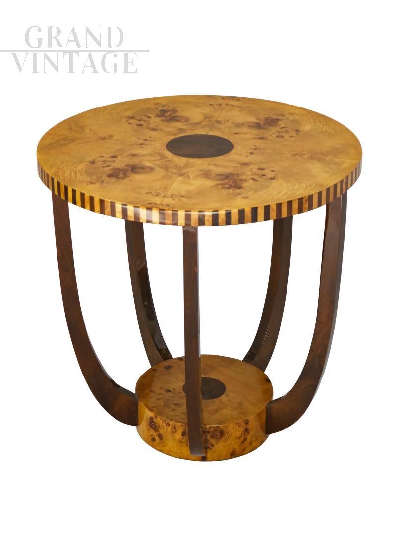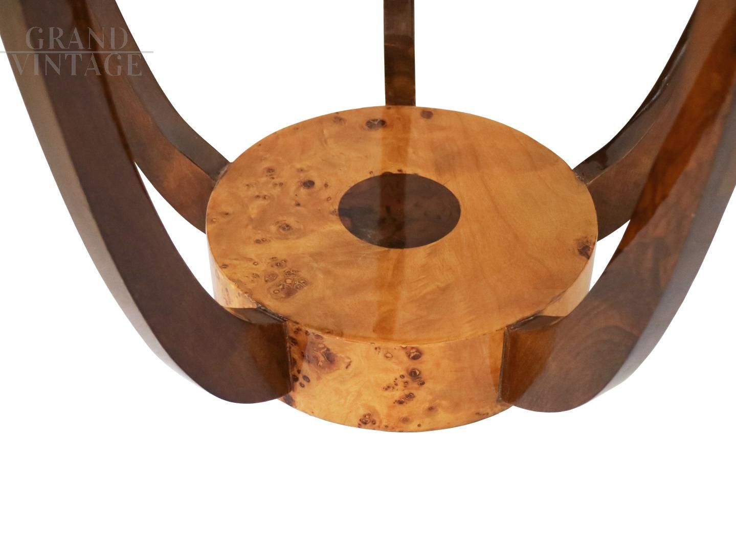 Pair of art deco style coffee tables in briar veneer with walnut support elements and inserts.