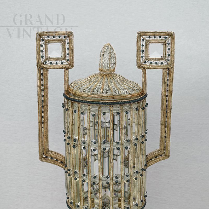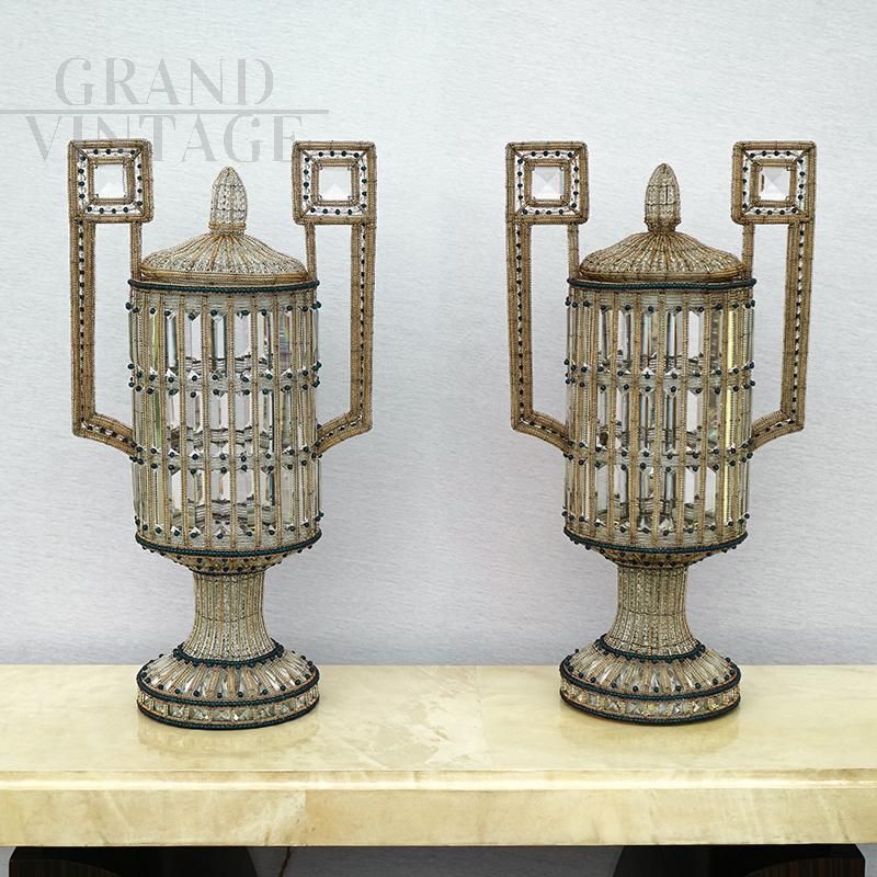 Beautiful pair of Art Deco style table lamps with golden structure covered in glass pearls and faceted glass that projects wonderful plays of light. The Art Deco style lamp pair features a cylindrical shade with a round pedestal and meander-shaped handles, as well as a mirrored cover with a tall bow. Symmetrically arranged with clear and blue glass beads and faceted glass panels. Electrified and working.