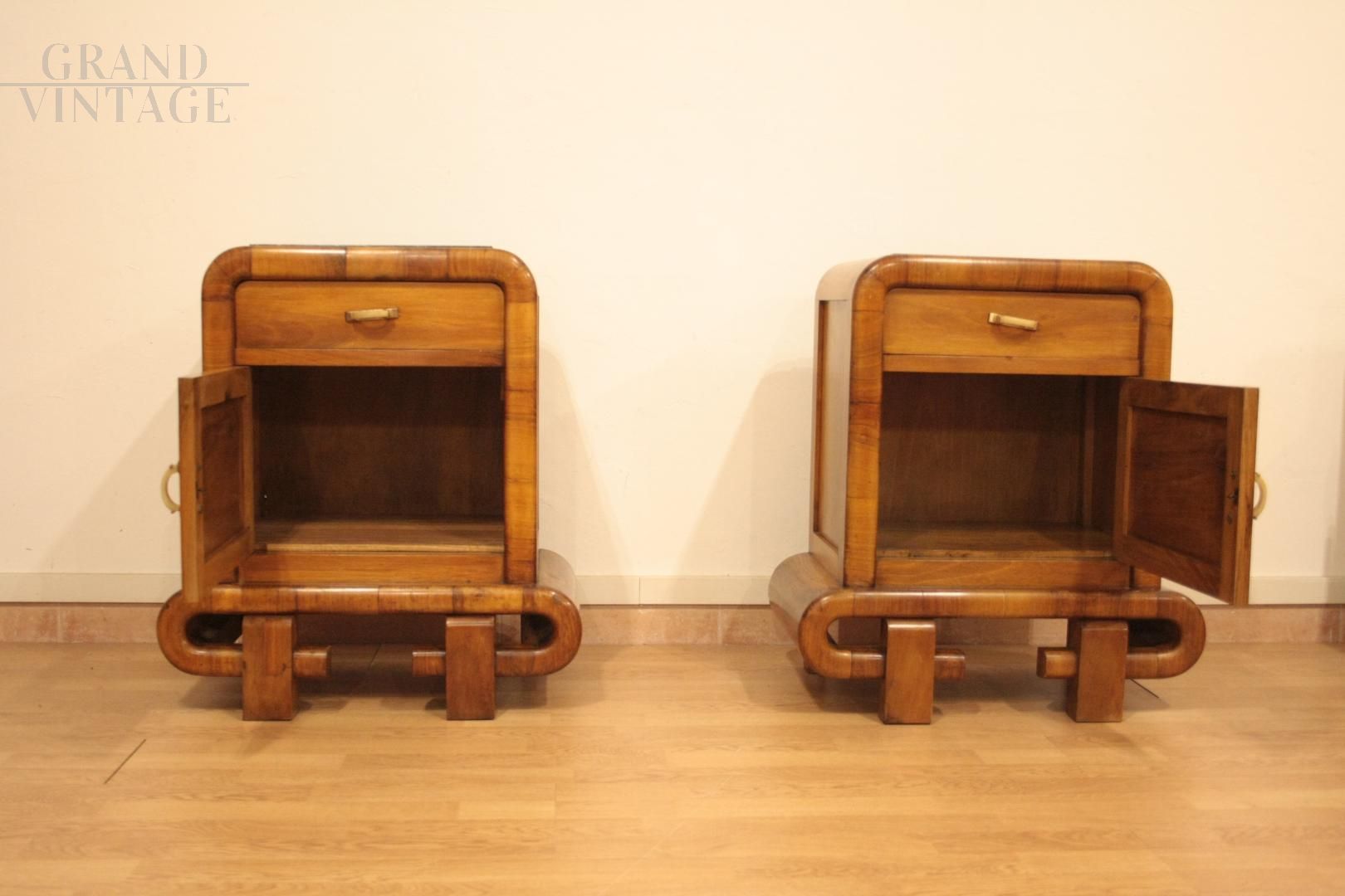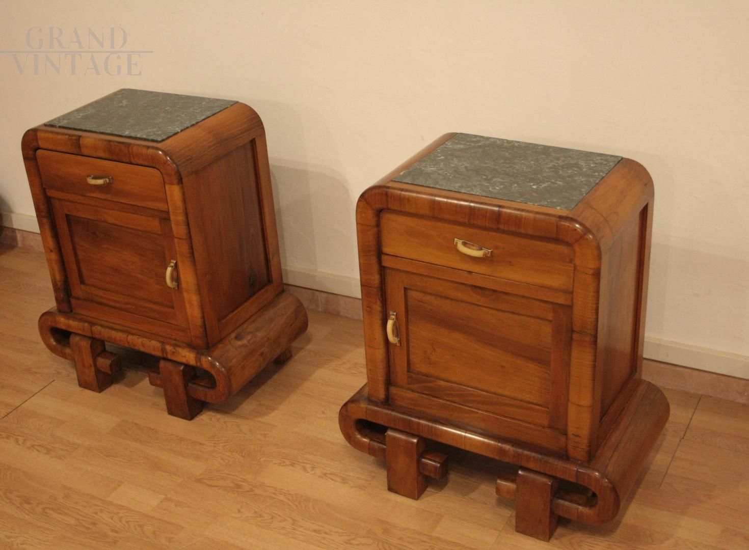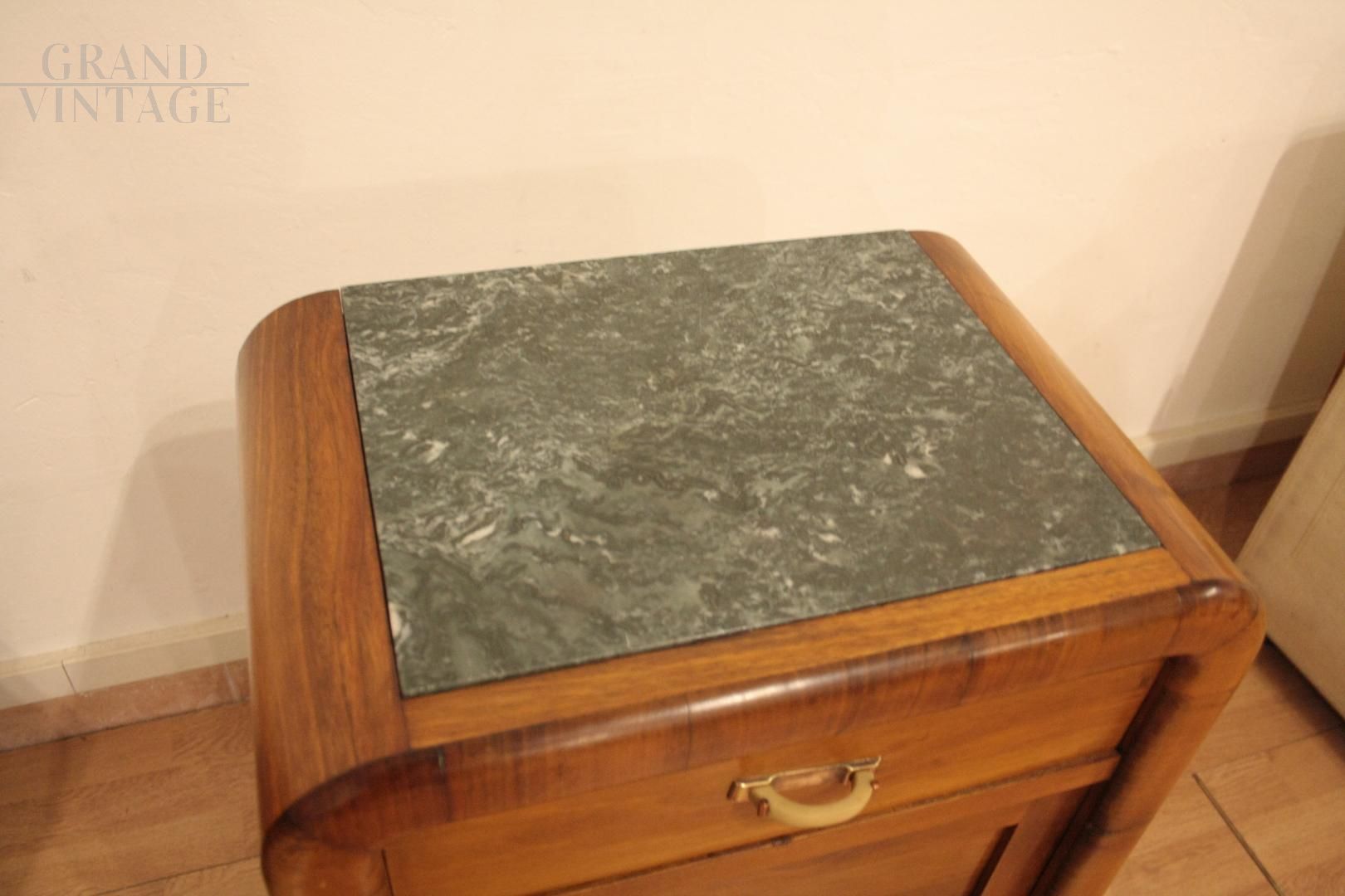 Beautiful pair of solid walnut nightstands. Made in the 1950s in Art Deco style, these pieces are true examples of Mid Century furniture. Their elegance is distinguished by the typical line of Art Deco furniture, characterized by a very particular and worked base, an element not often found in the quality of mid-century furniture. These nightstands have a modern profile that reflects the distinctive design of that era, complemented by a marble top that is in excellent condition, as is the rest of the furniture, authentic in every part. The handles, also original, are made of brass with faux ivory details, adding a touch of refinement and class.