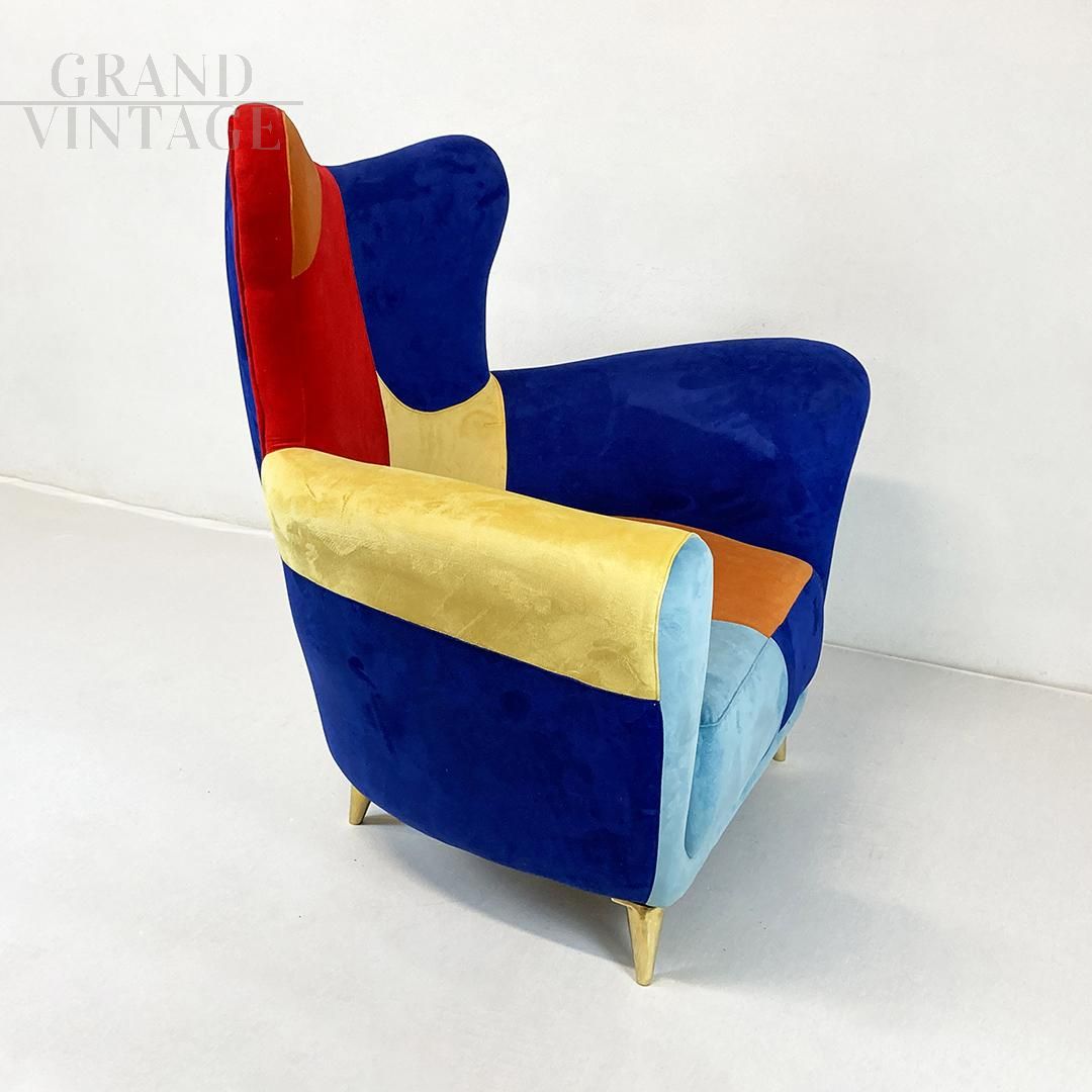 Pair of asymmetric design armchairs in multicolored velvet