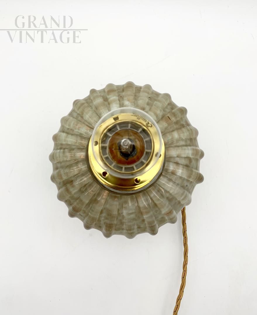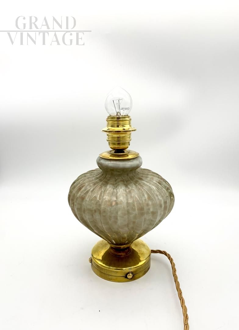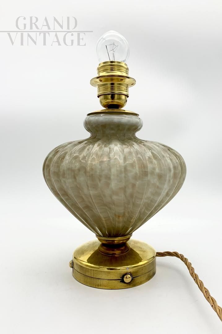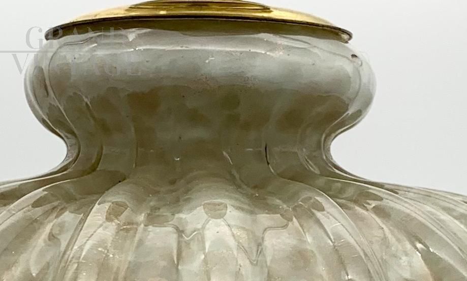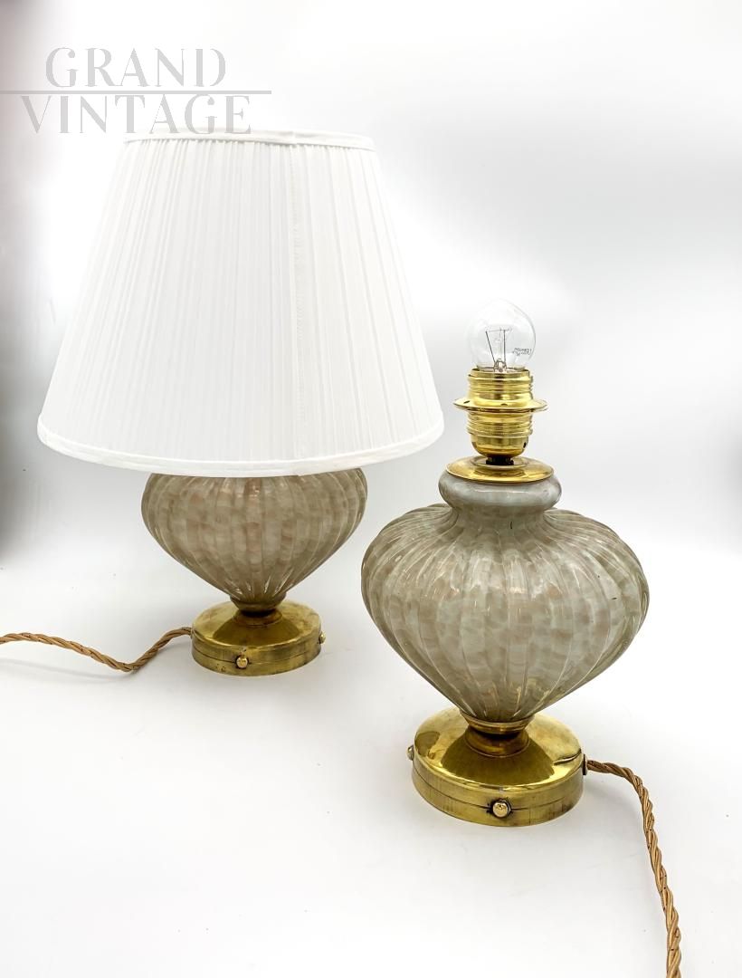 Pair of Avem 50's abat-jour table lamps in magnificent beige Murano glass hand blown on a mold, brass base and details and white fabric lampshade.