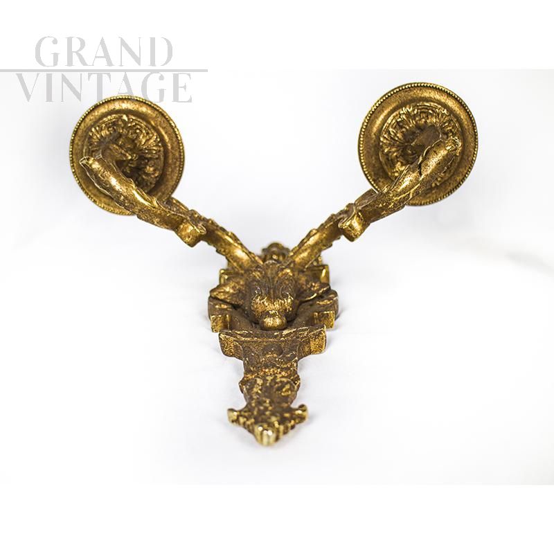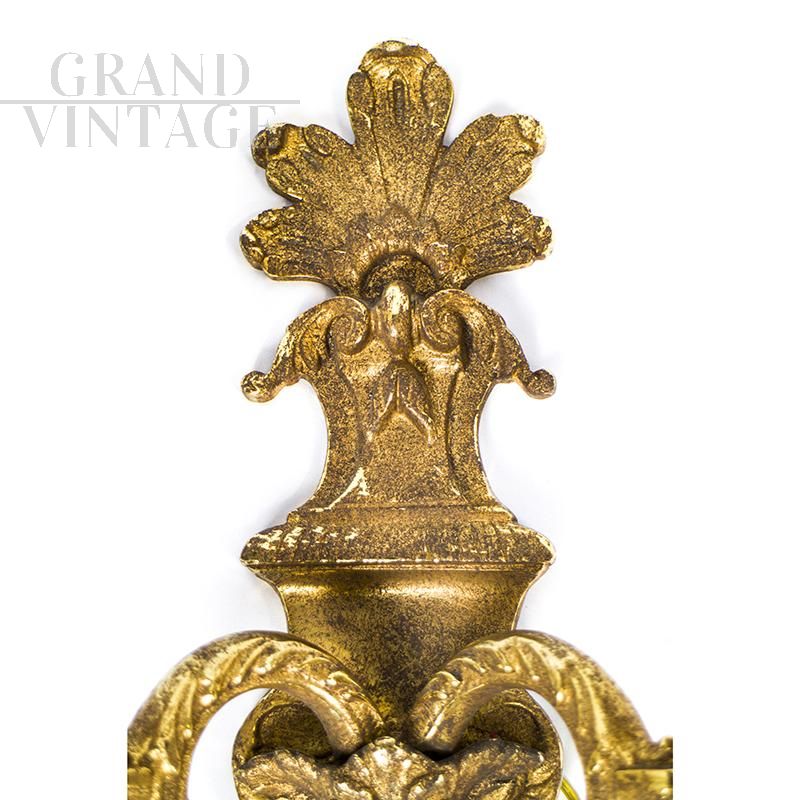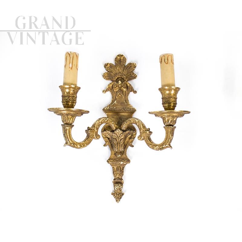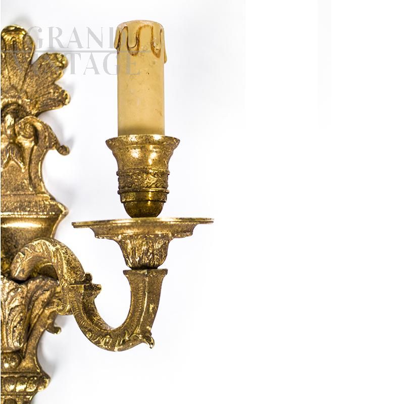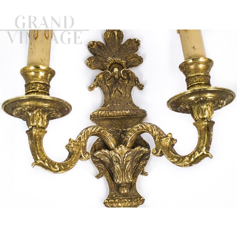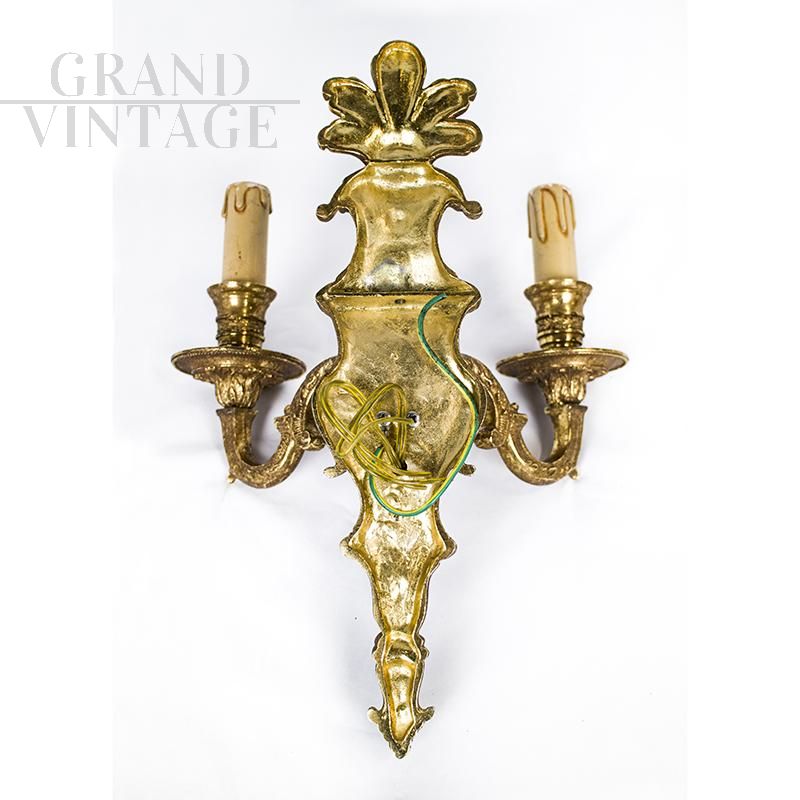 Pair of antique baroque style wall lights in finely crafted golden brass, in excellent condition, working electrical system.