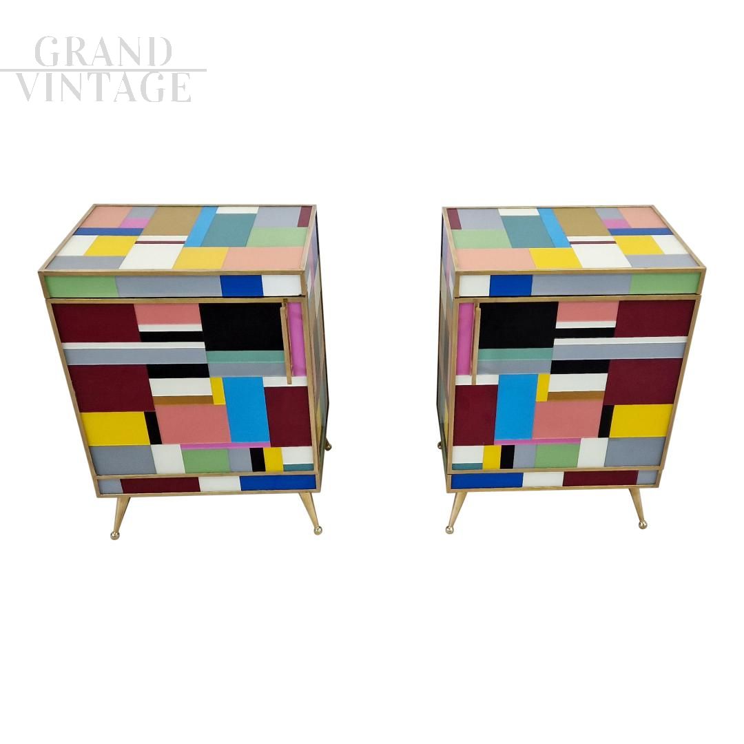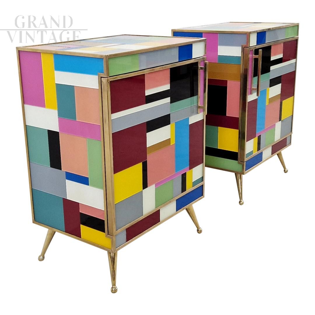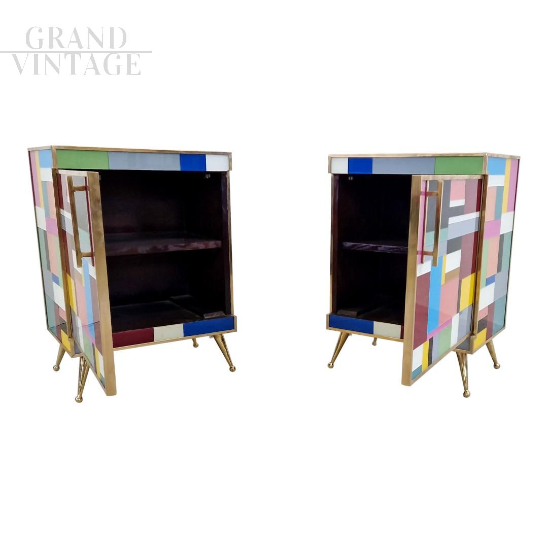 Pair of single-door bedside tables with wooden structure covered with multicolored glass, entirely handmade; profiles, handles and feet in golden brass.