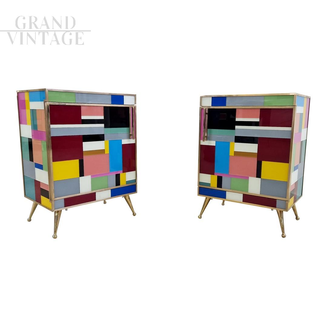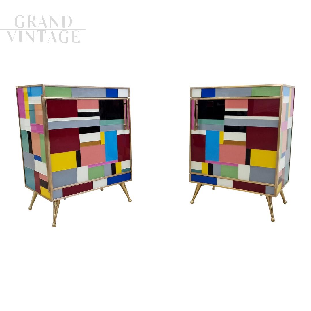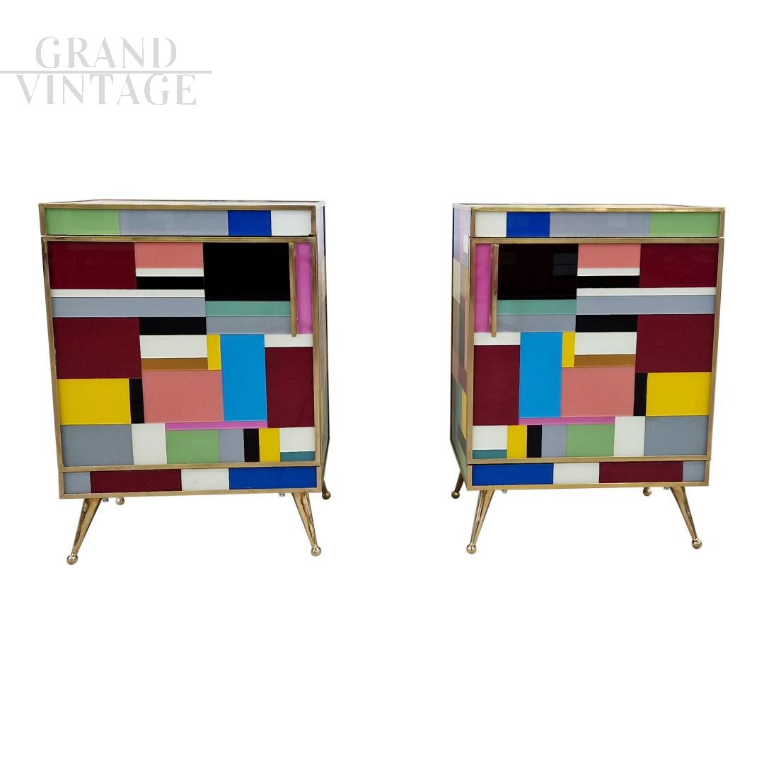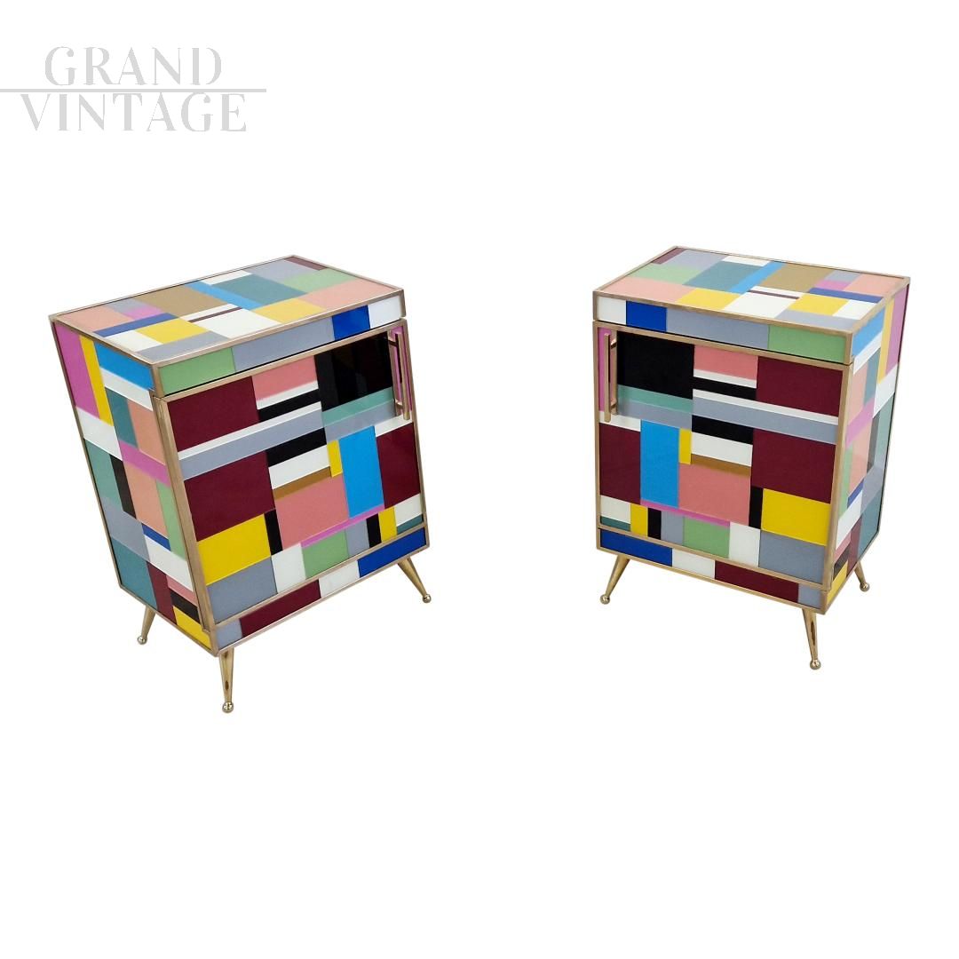 Pair of single-door bedside tables with wooden structure covered with multicolored glass, entirely handmade; profiles, handles and feet in golden brass.