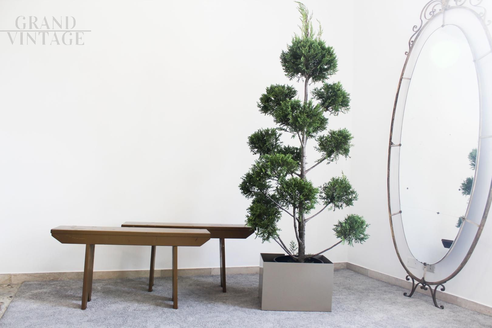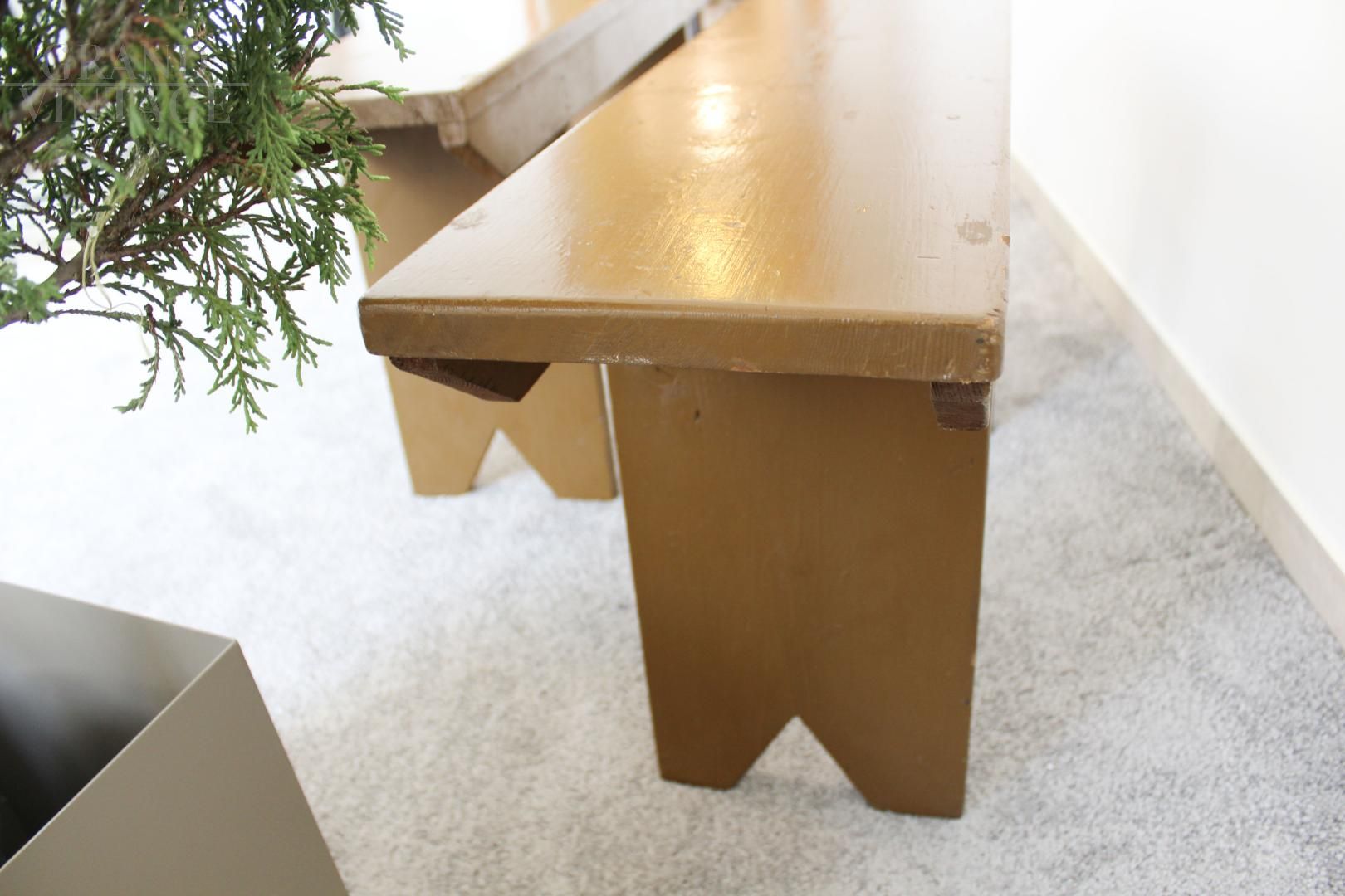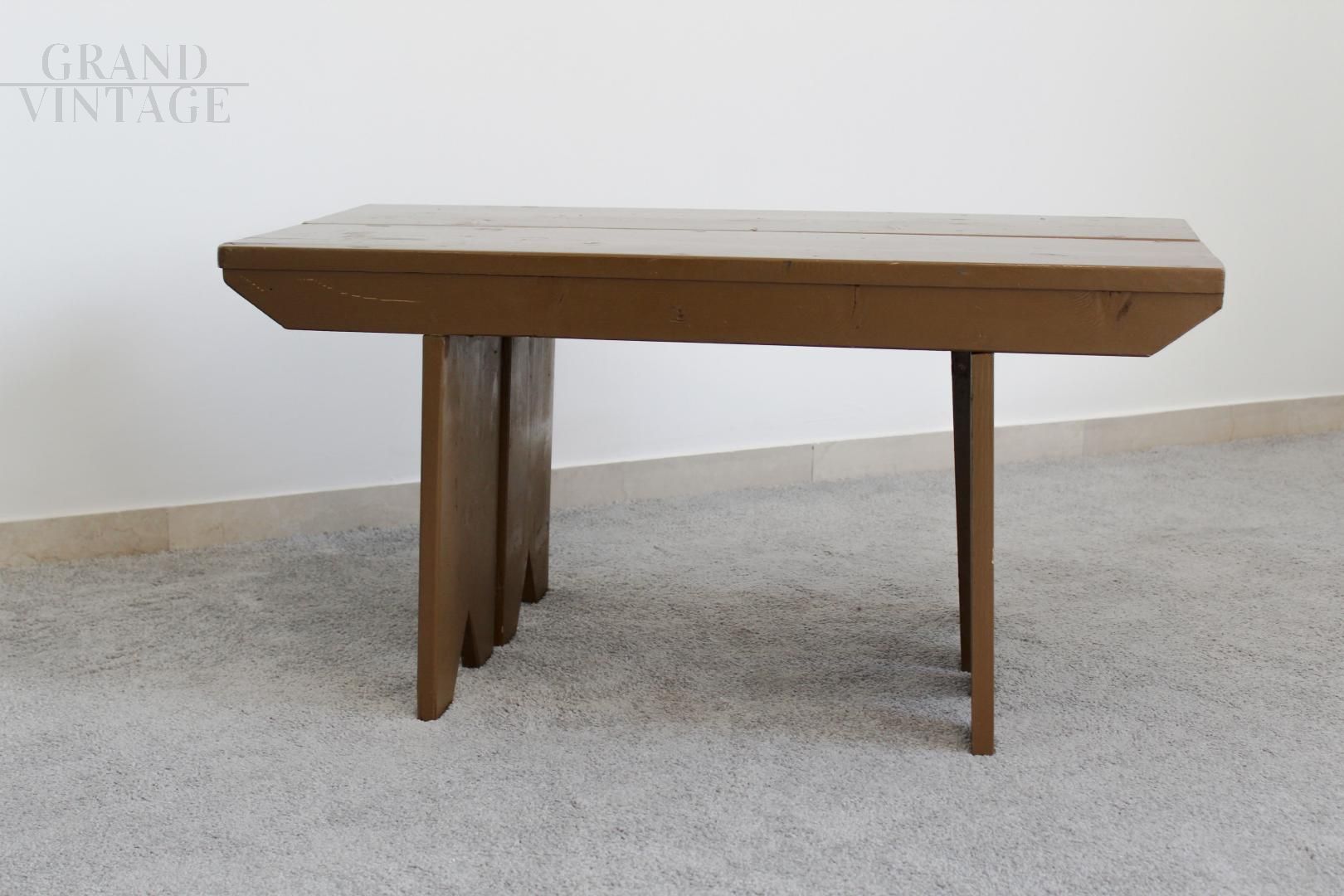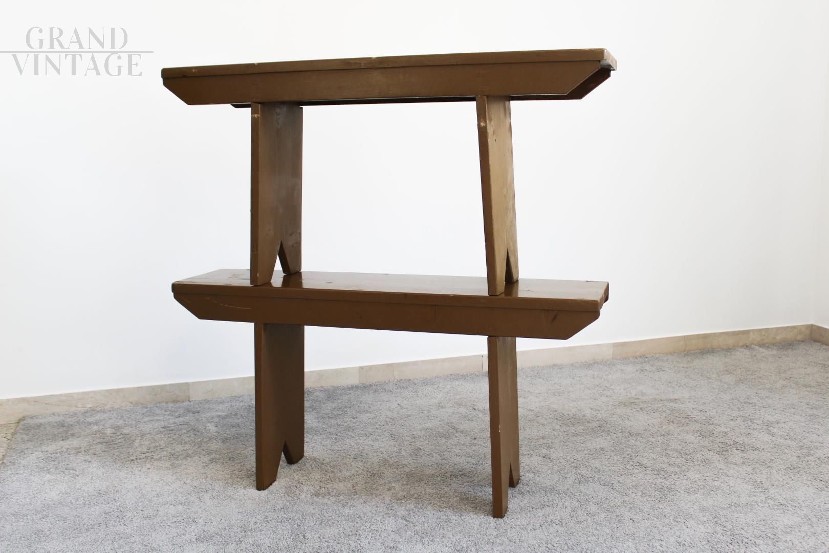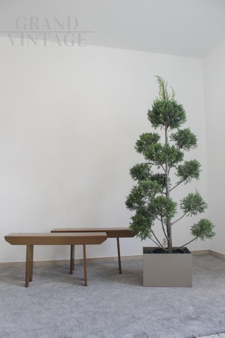 Pair of benches in fir wood, Italy 1950s, greenish brown in color, with a minimal appearance, suitable for any room or setting, in excellent conditions, they show the normal signs of wear over time.