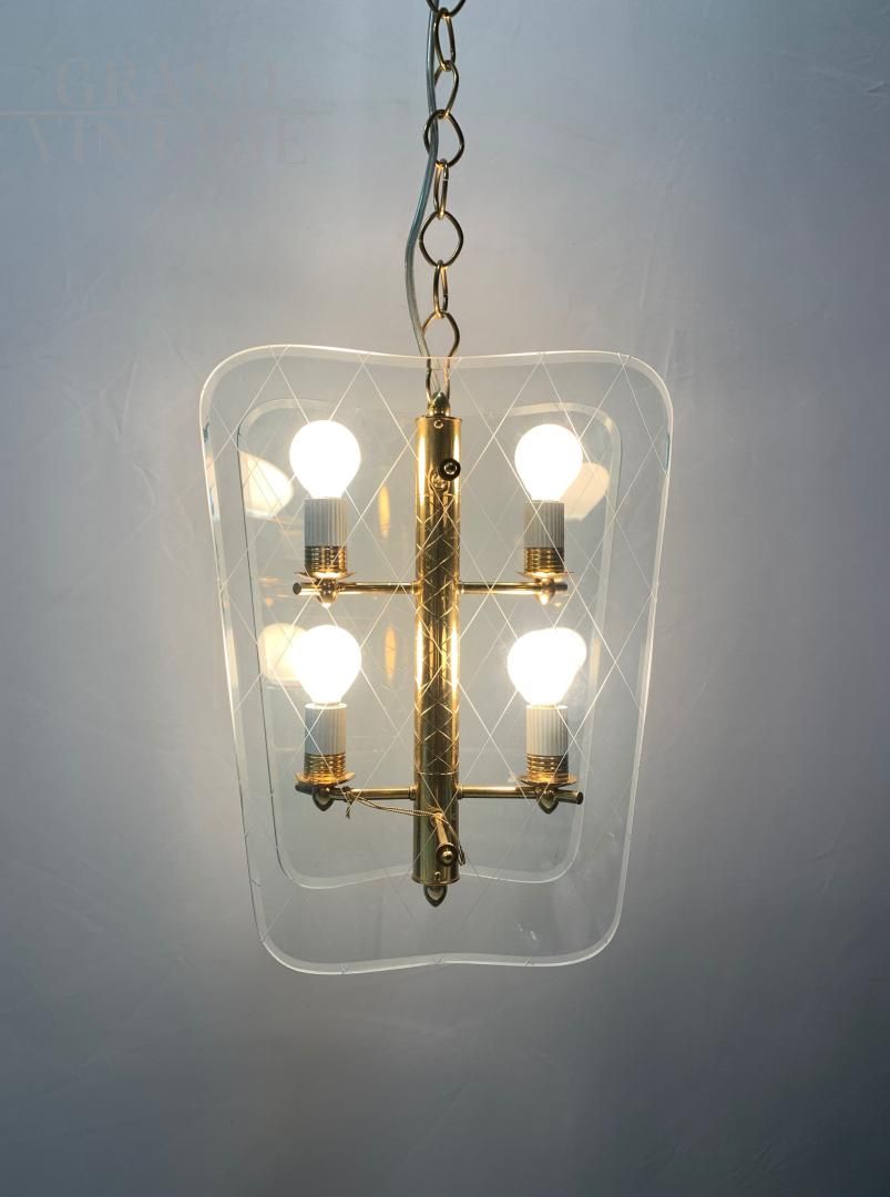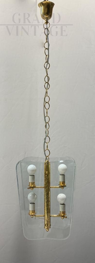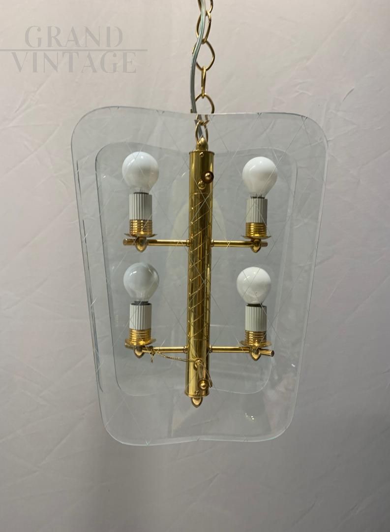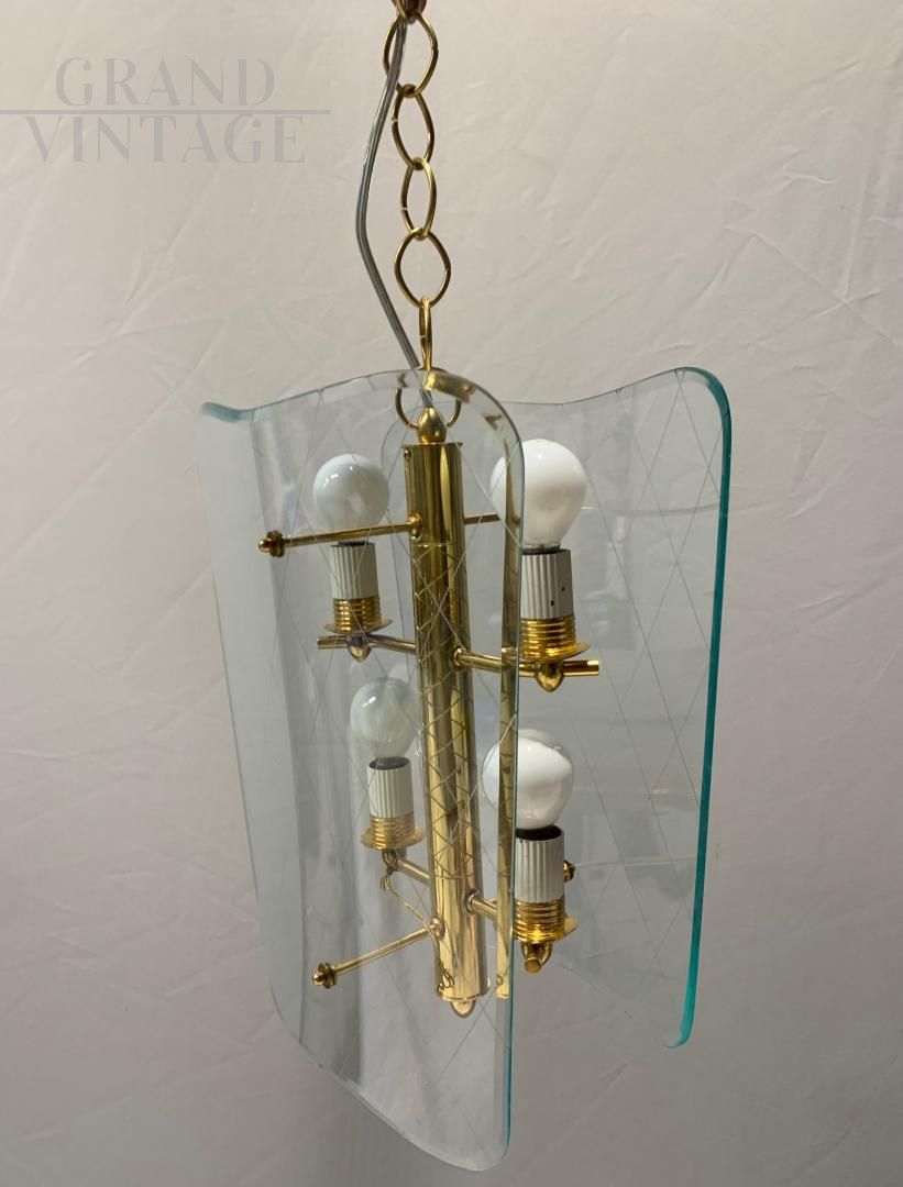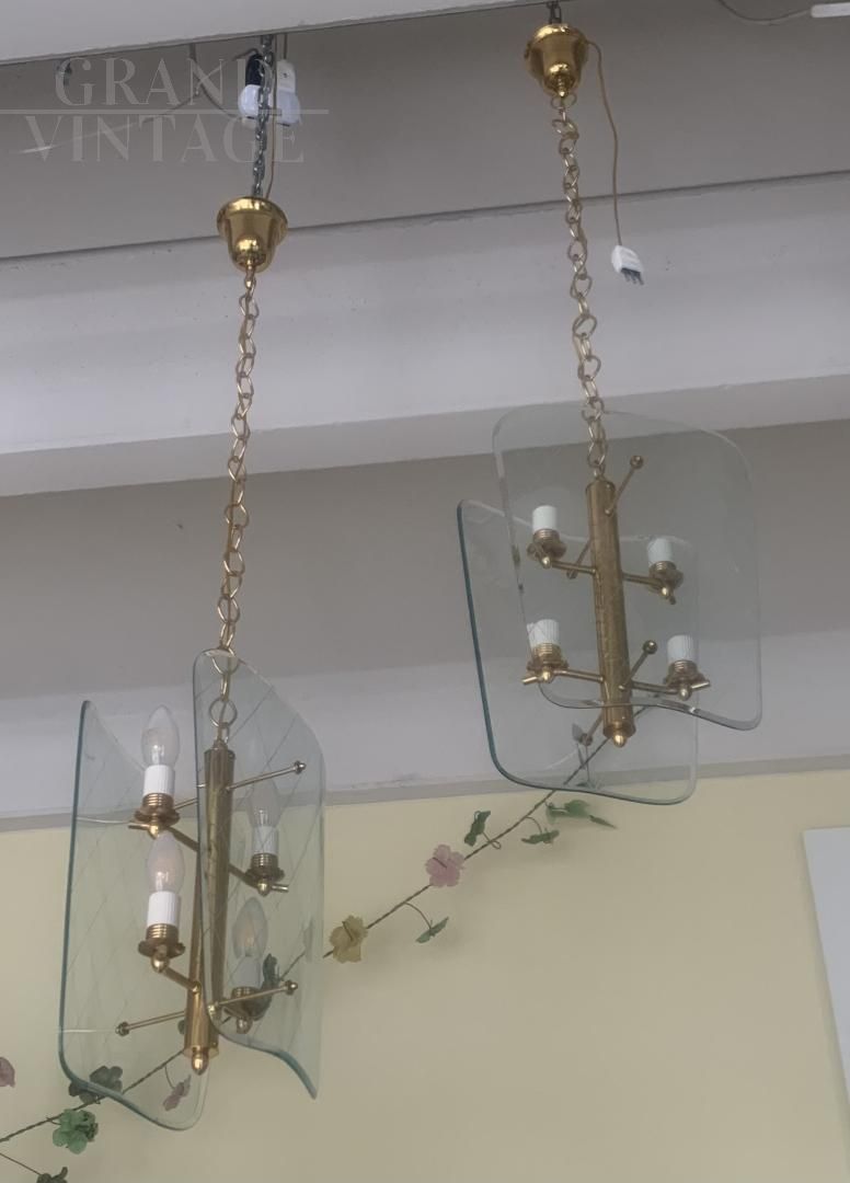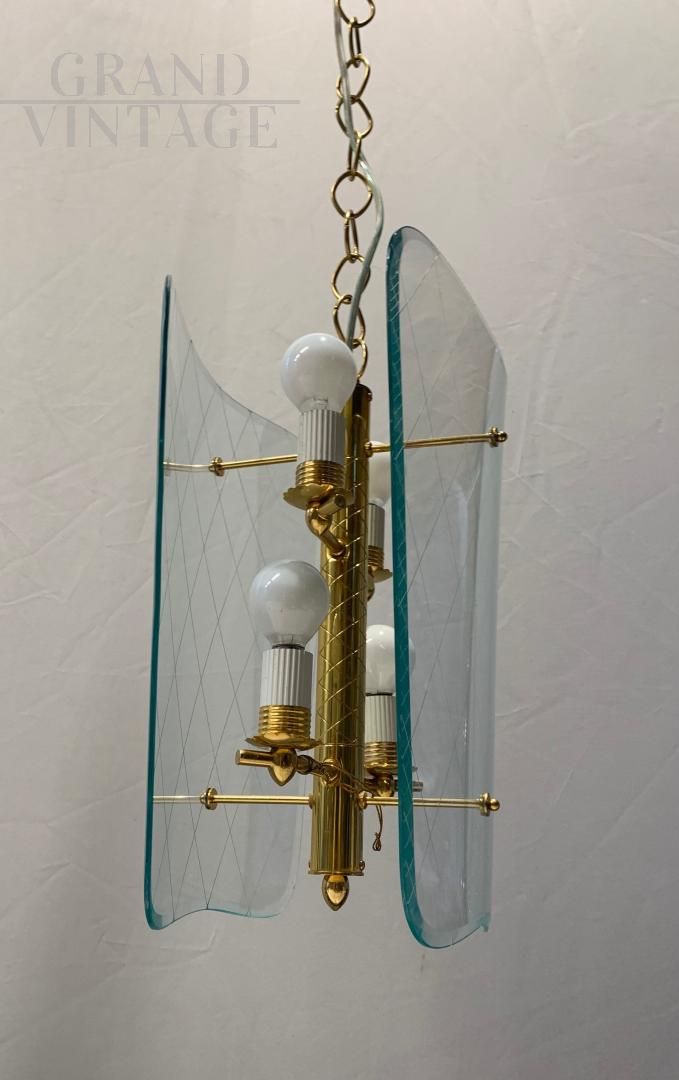 Pair of Fontana Arte lantern style chandeliers from the 1950s, with beautiful light Murano glass plates blown into a mold with internal grinding. In good condition, all original, they only have some signs of wear on the gold plated setting. Fantastic uncracked glass, working electrical system. Excellent elements that can furnish and illuminate different rooms. The height of the chain is adjustable. We recommend using an LED bulb.