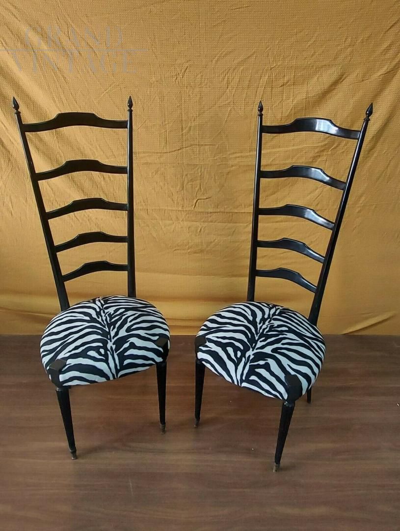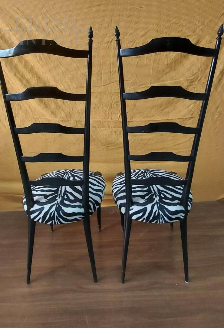 Pair of Art Deco Chiavarine chairs with high ladder backrest, in ebony wood, original 1950s, with seat in black and white animalier zebra fabric.