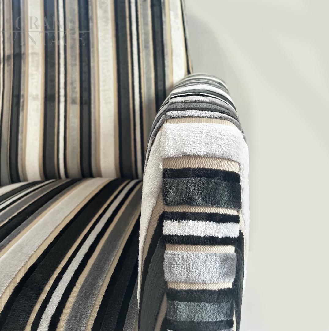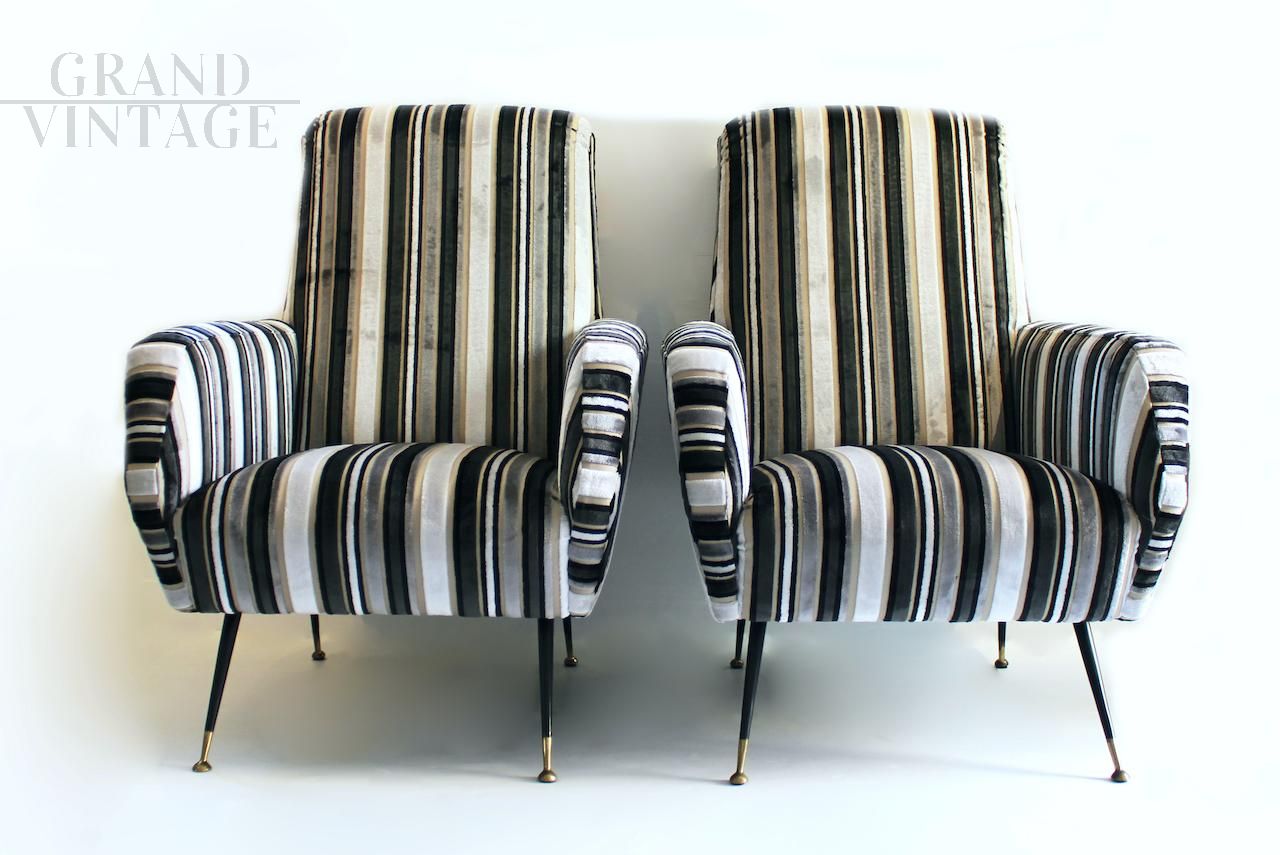 Particular pair of vintage armchairs in black and white striped velvet with original frame, iron legs and brass feet, Italian mid-century modern from the 70s.