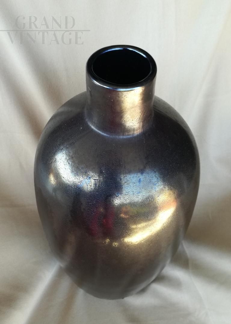 Pair of collectible artistic bottle vases. The set consists of a green glazed terracotta flask from the 1970s, Catalan origin - Spain, also called Terrissa Catalana - Cantir d'Hivern del Vendrell. And from a design vase by Barbini in Murano glass treated with silicon on the surface, originating in Italy from the 1990s, heavy and very thick, in the back you can see the chromatic overlapping of oxides to obtain the brown/burgundy colour. In excellent condition and without defects.