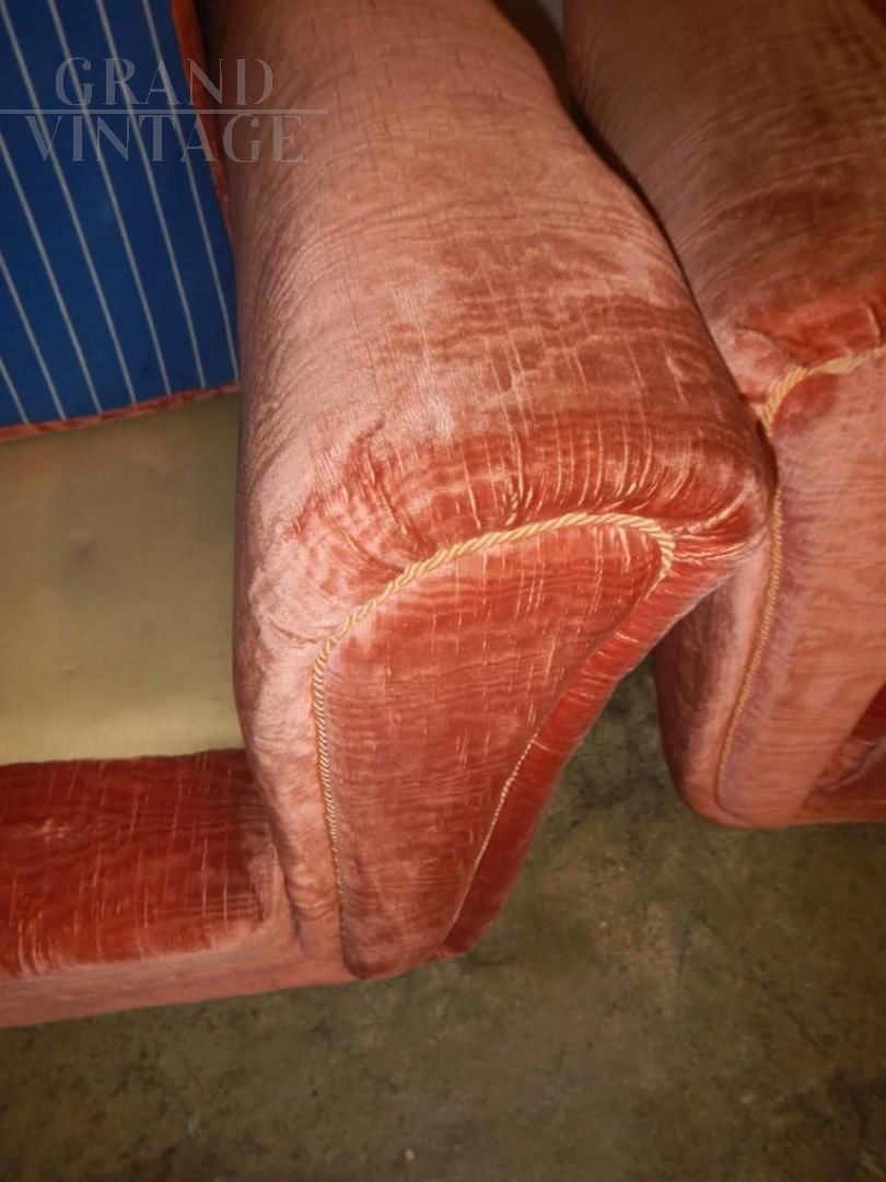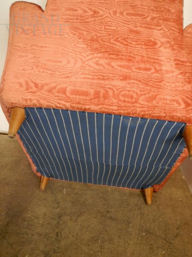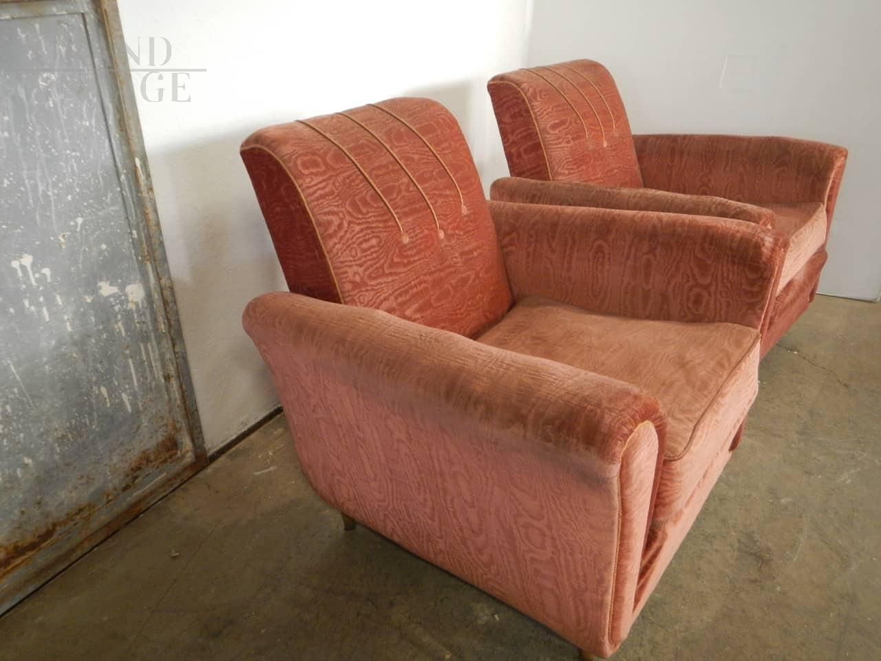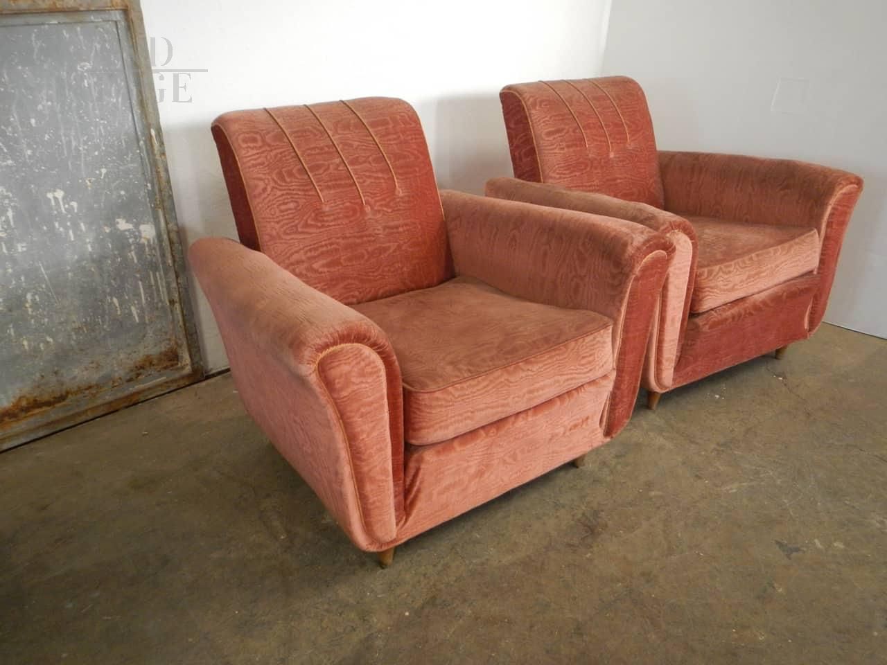 Pair of 1950s vintage armchairs in velvet with wooden legs, in good condition, with seat springs to be reviewed.