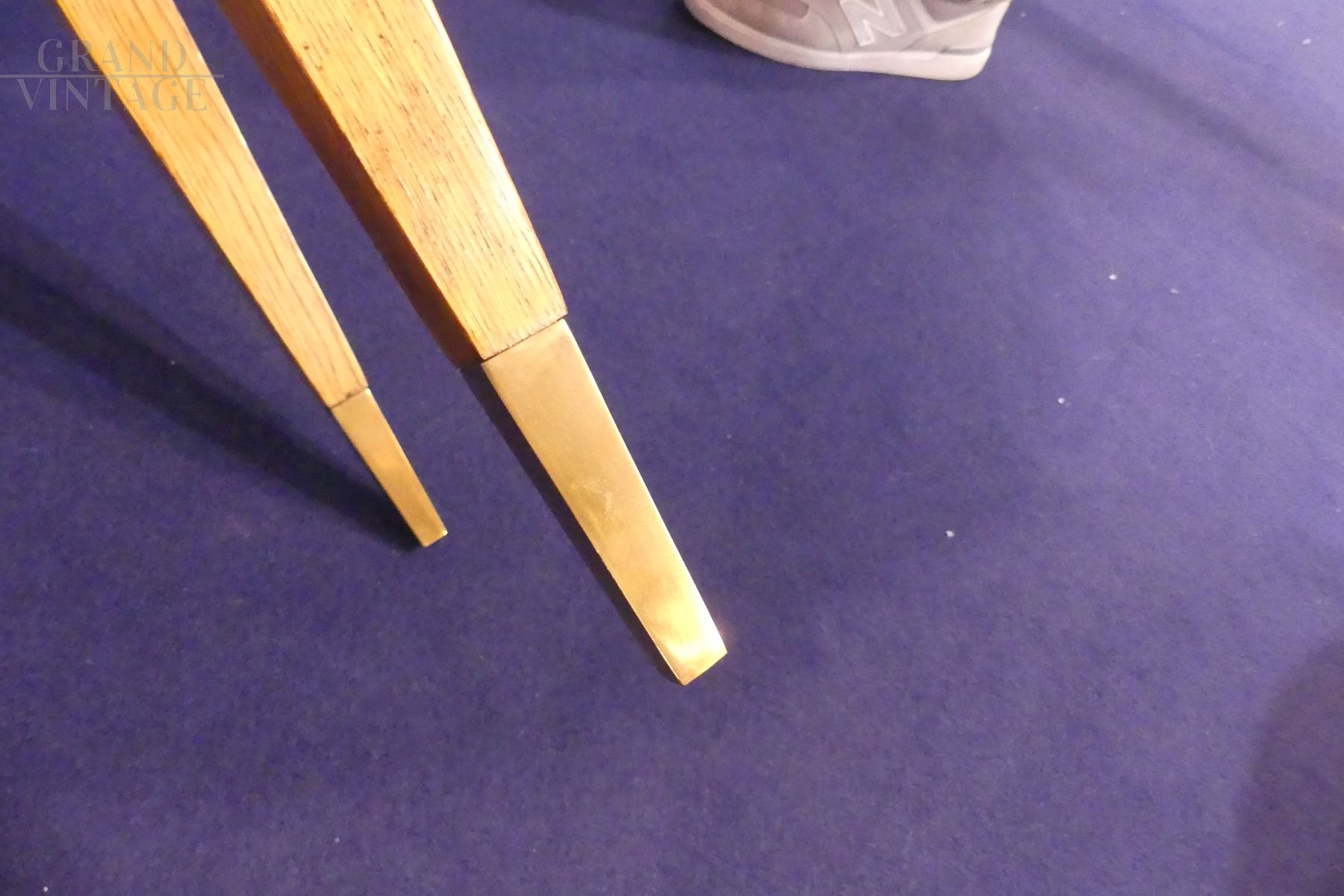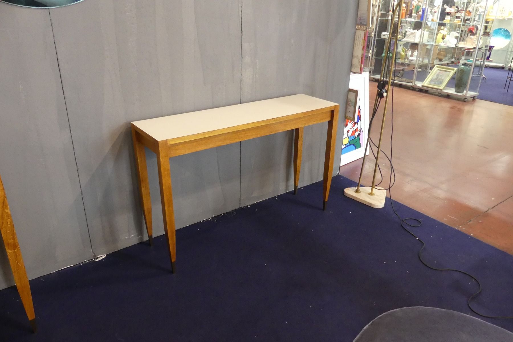 Pair of beautiful consoles designed by Gio Ponti in light walnut wood with formica top and brass feet.