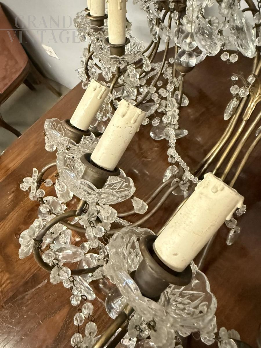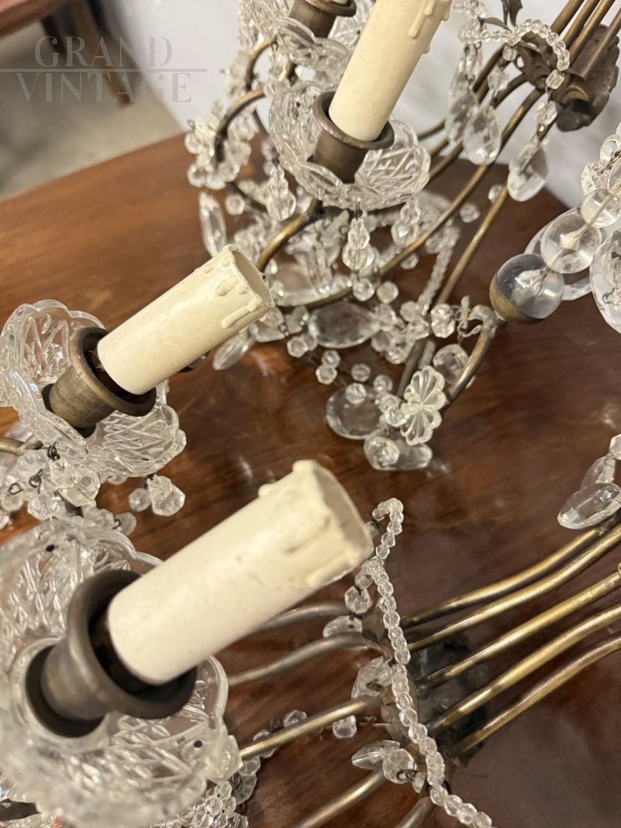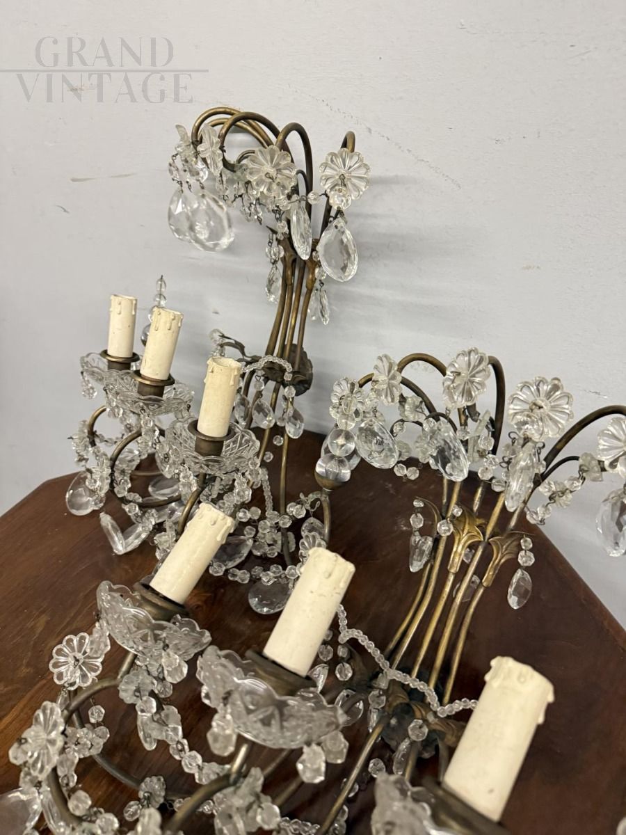 A pair of sconces wall lights with crystal drops from the early 1900s, each with three light points, very beautiful and electrified, in good condition.