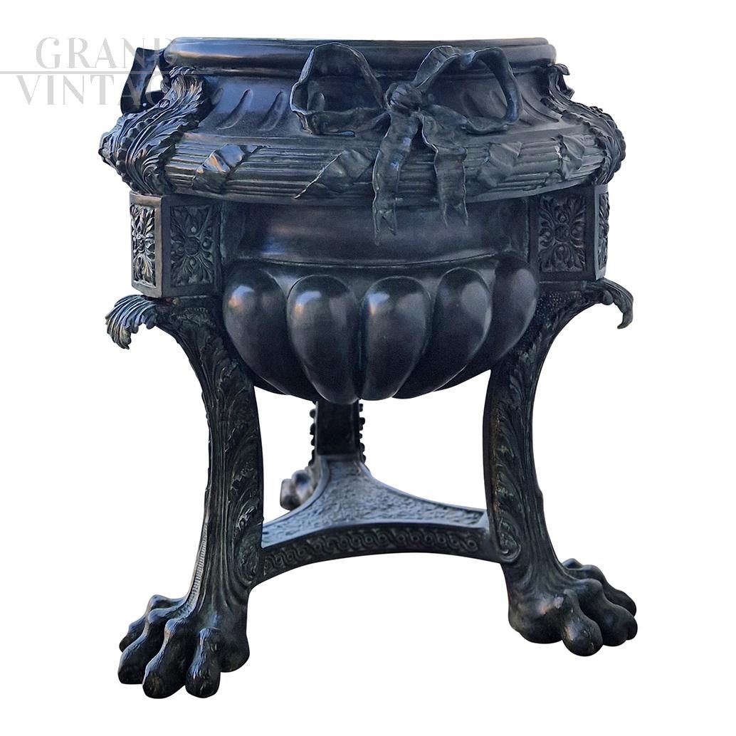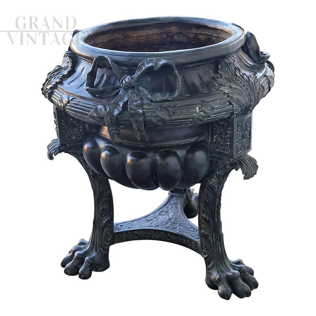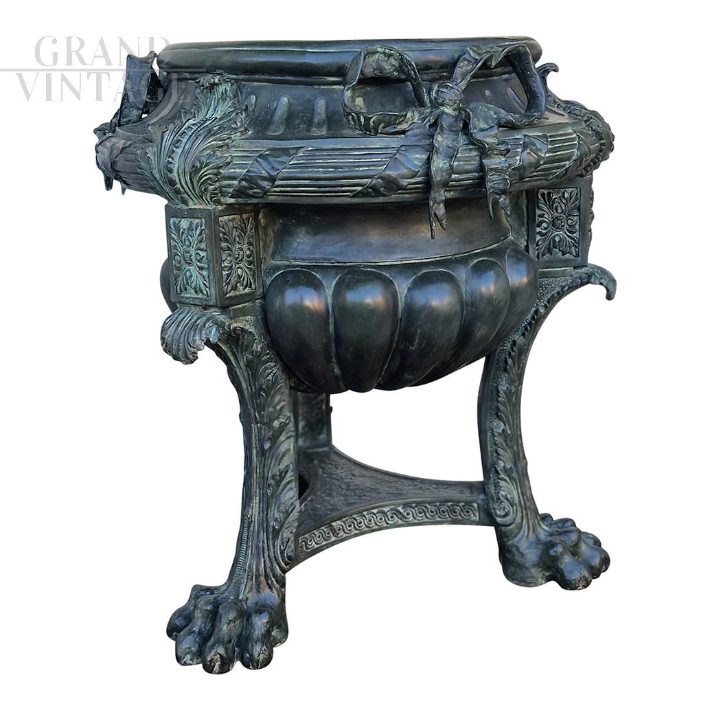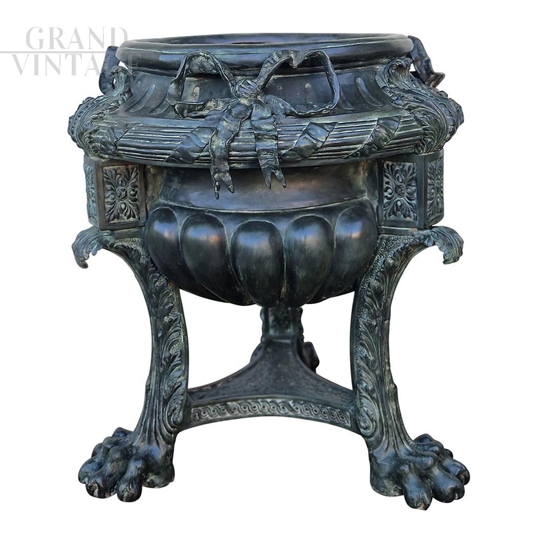 Very elegant pair of large bronze vases in antique Empire style worked with ribbon decorations and resting on lion's paws. E-0063